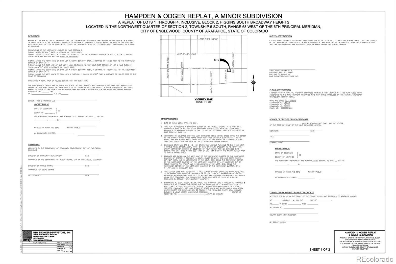 Current land space is 100’ wide. 125’ ft deep for a total of 12500sq ft lot. Zoned m-2. City of englewood. 60’ height limit, Sub dividable. Commercial/residential/retail mix. Survey is complete. Total land address includes 1002 E Hampden, 1008 E Hampden, and 3510 S Ogden.