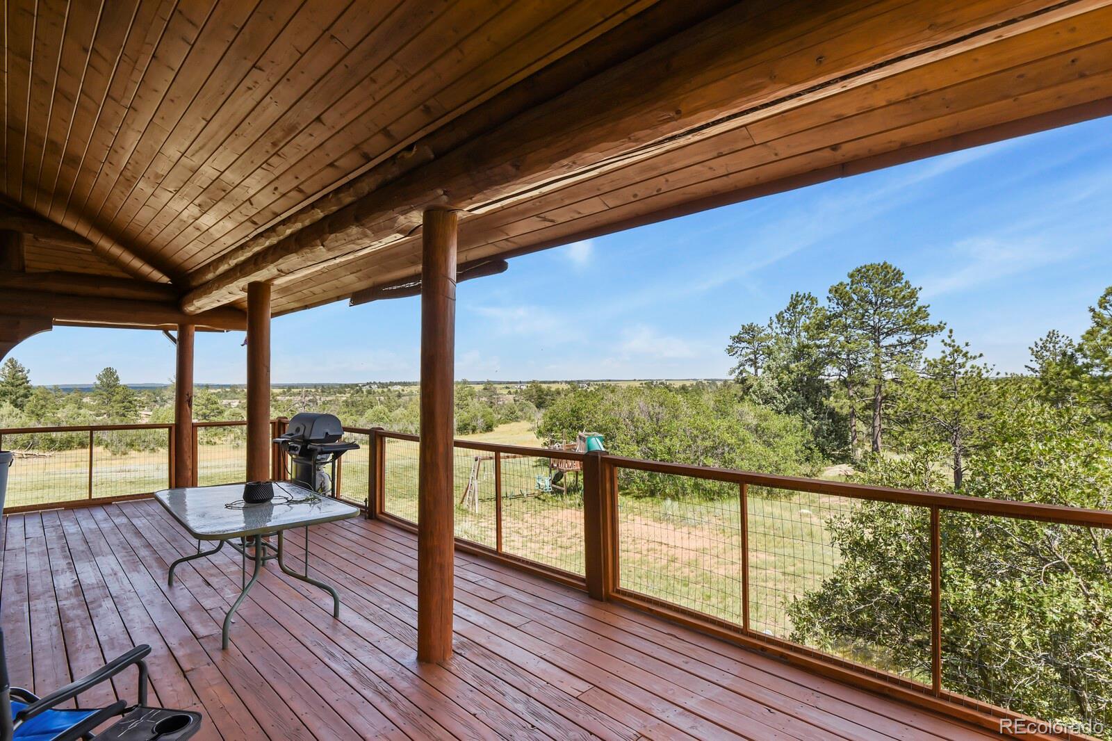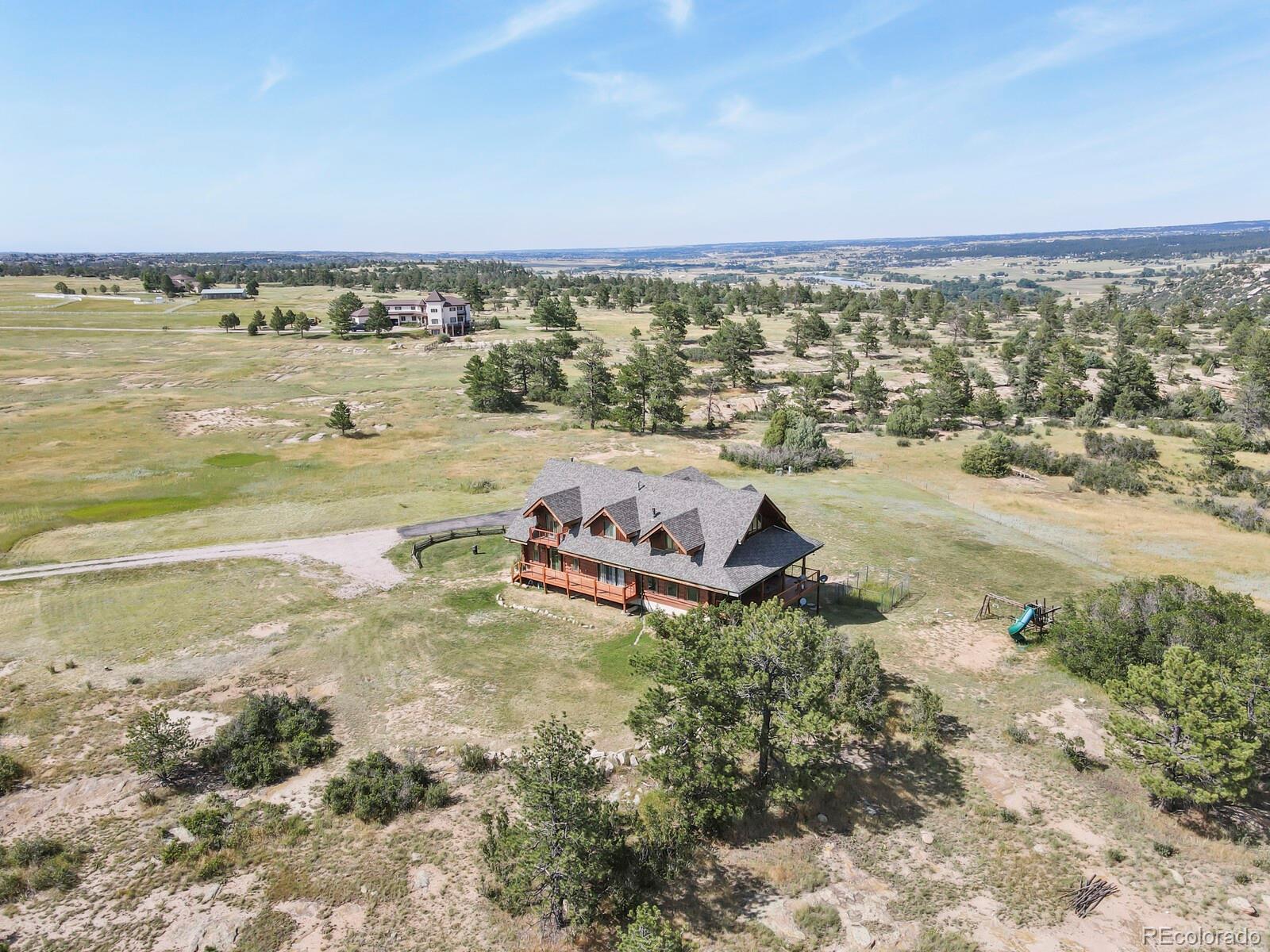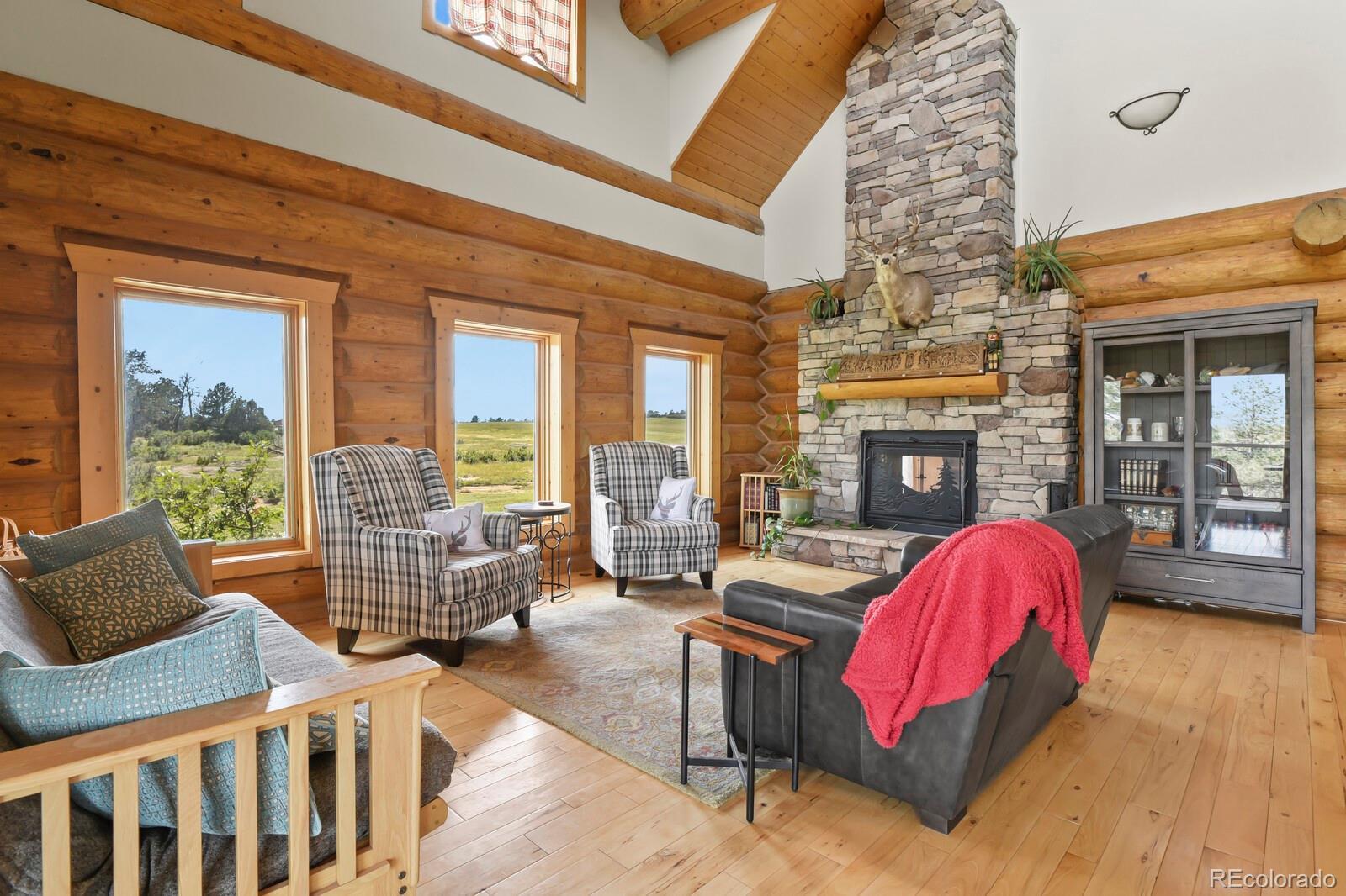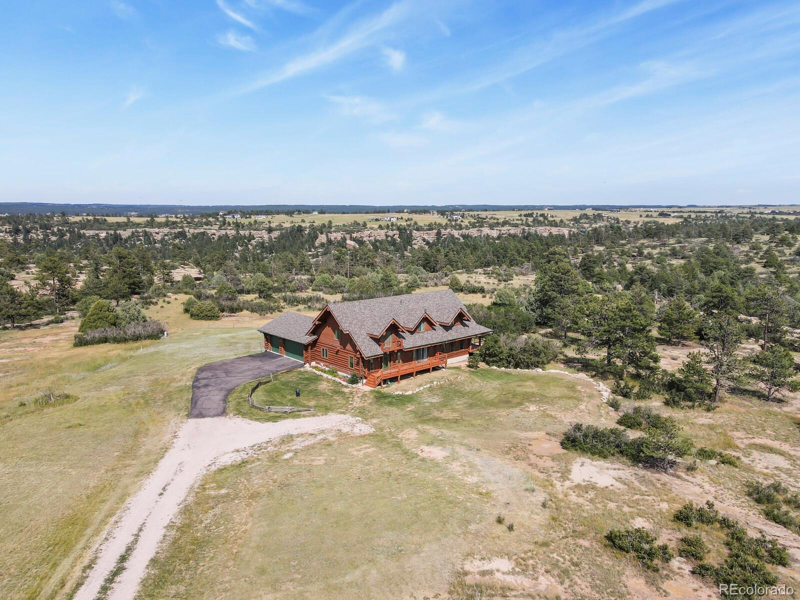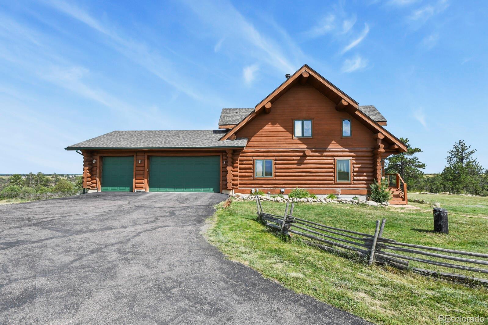 Own your private slice of Colorado paradise with this custom-built log cabin on over 36 acres—just minutes from downtown Castle Rock! This spacious four-bedroom, three-bath home features stunning log construction, soaring wood ceilings, and warm wood finishes throughout, blending rustic charm with modern comfort. The open-concept main living area is highlighted by a striking open fireplace, perfect for cozy evenings, while the kitchen offers stainless steel appliances and ample space for entertaining. A brand-new roof in 2025 adds peace of mind. Step outside to enjoy panoramic views of Castlewood Canyon State Park and the mountains from the expansive wood porch and back deck. The large unfinished basement is ready for your personal touch—ideal for adding living space, a home gym, or a media room. A three-car garage provides generous storage, and with horses allowed, there’s room to create your dream ranch setup. Whether you're looking for privacy, natural beauty, or room to roam, this property offers a rare combination of space and convenience.