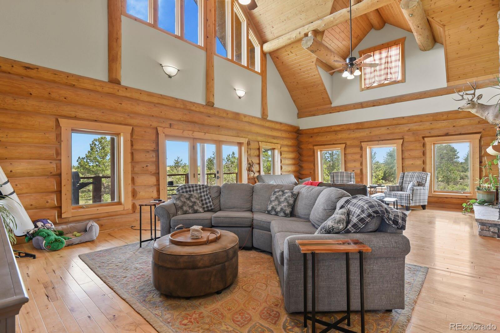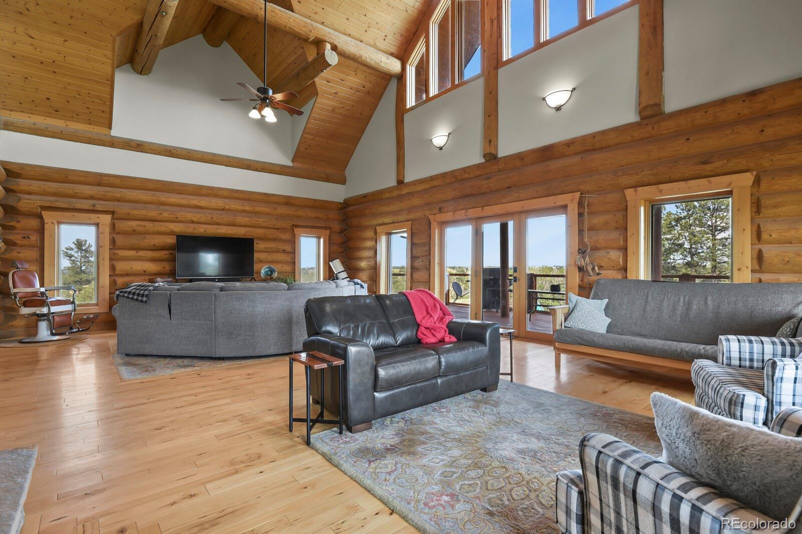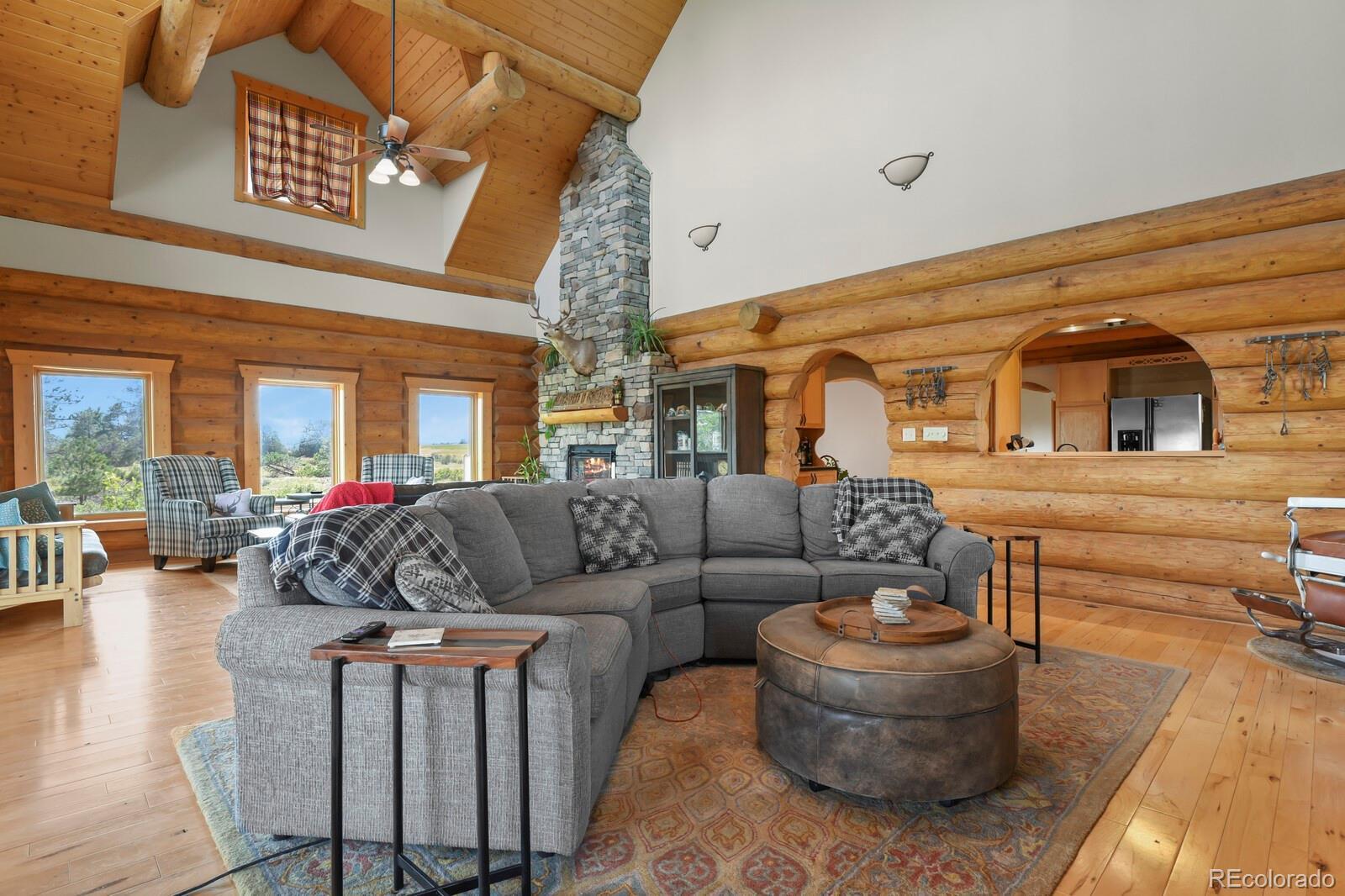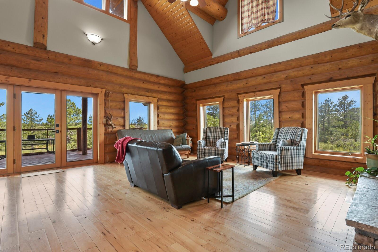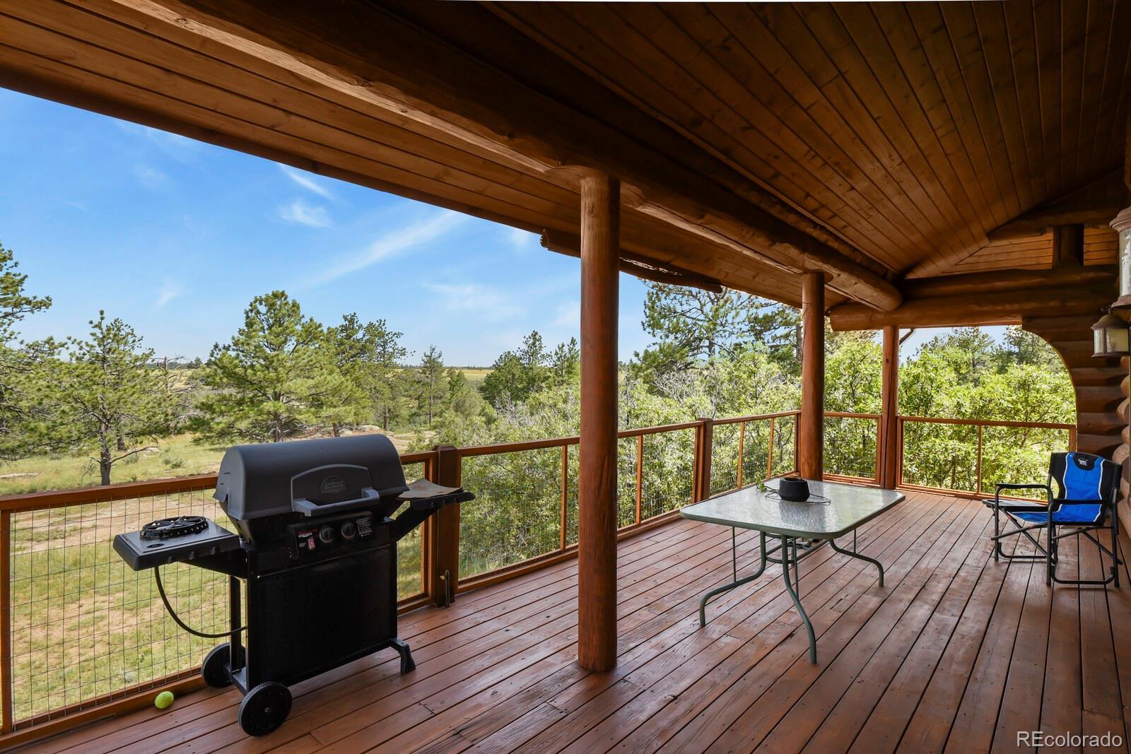 Own your private slice of Colorado paradise with this custom-built log cabin on over 36 acres—just minutes from downtown Castle Rock! This spacious four-bedroom, three-bath home features stunning log construction, soaring wood ceilings, and warm wood finishes throughout, blending rustic charm with modern comfort. The open-concept main living area is highlighted by a striking open fireplace, perfect for cozy evenings, while the kitchen offers stainless steel appliances and ample space for entertaining. A brand-new roof in 2025 adds peace of mind. Step outside to enjoy panoramic views of Castlewood Canyon State Park and the mountains from the expansive wood porch and back deck. The large unfinished basement is ready for your personal touch—ideal for adding living space, a home gym, or a media room. A three-car garage provides generous storage, and with horses allowed, there’s room to create your dream ranch setup. Whether you're looking for privacy, natural beauty, or room to roam, this property offers a rare combination of space and convenience.
