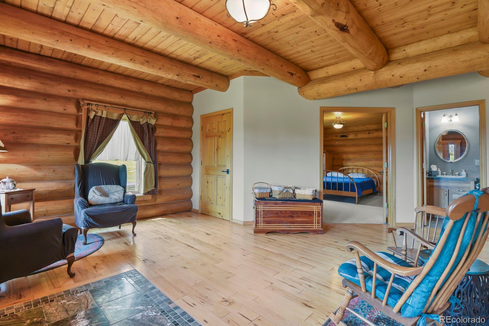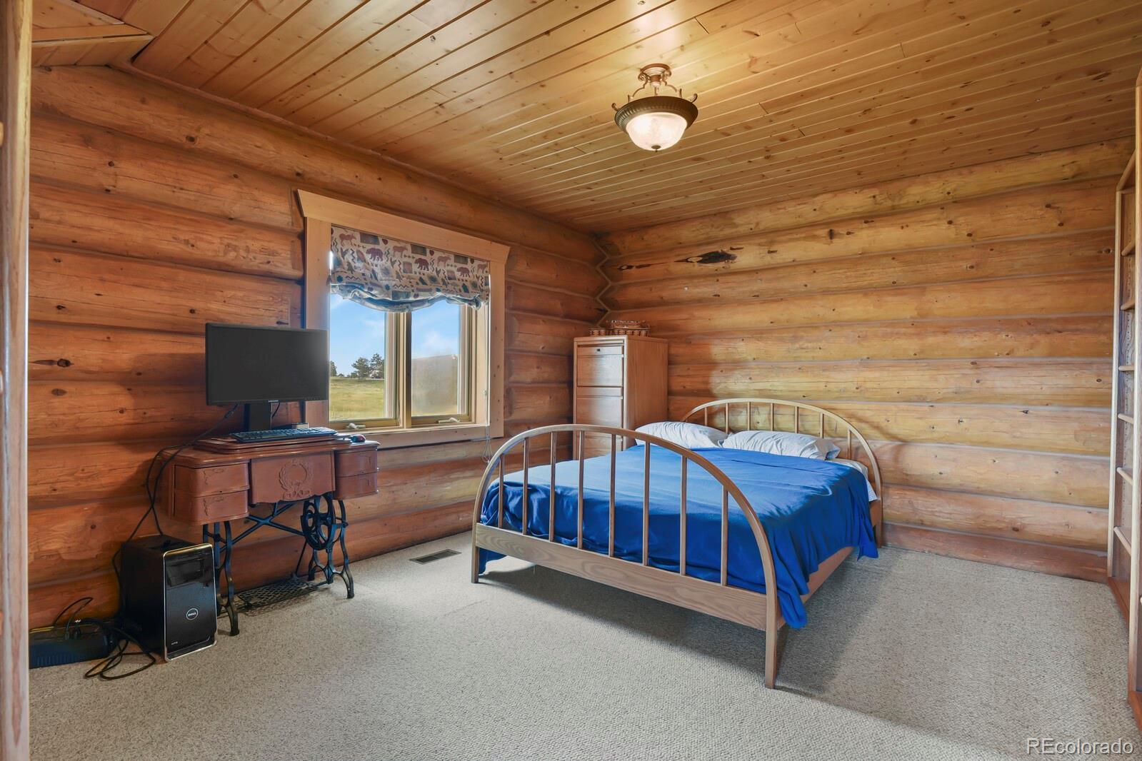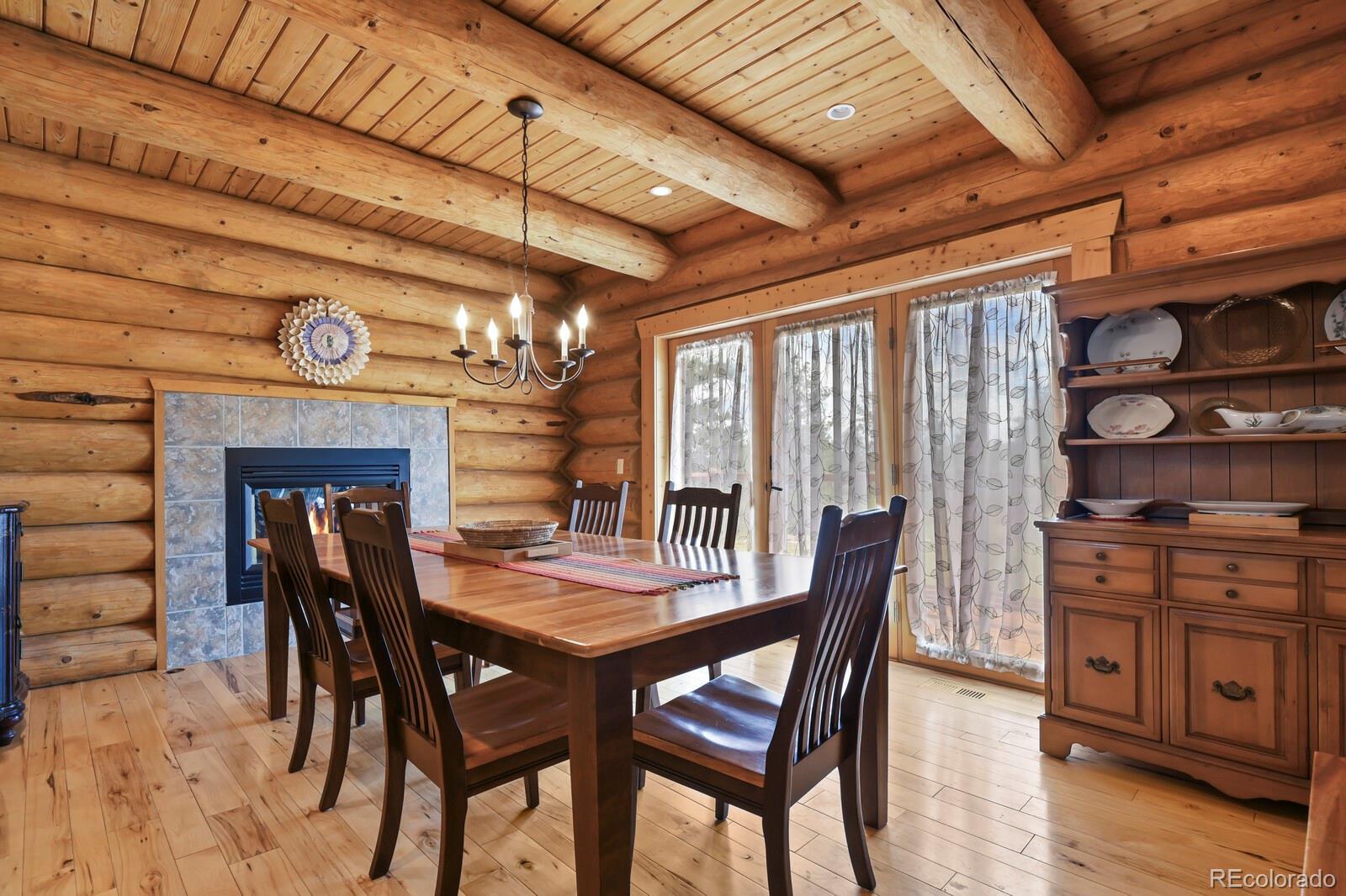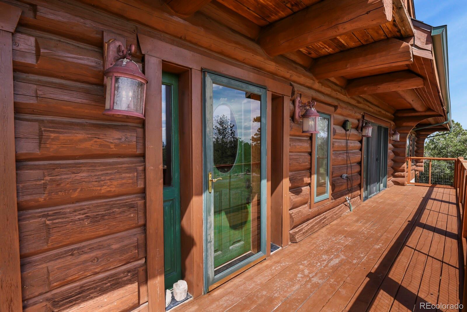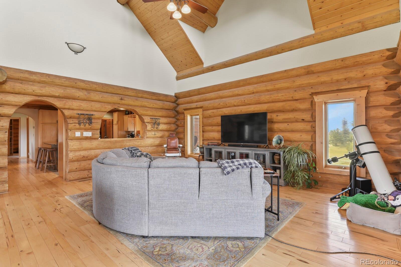 Own your private slice of Colorado paradise with this custom-built log cabin on over 36 acres—just minutes from downtown Castle Rock! This spacious four-bedroom, three-bath home features stunning log construction, soaring wood ceilings, and warm wood finishes throughout, blending rustic charm with modern comfort. The open-concept main living area is highlighted by a striking open fireplace, perfect for cozy evenings, while the kitchen offers stainless steel appliances and ample space for entertaining. A brand-new roof in 2025 adds peace of mind. Step outside to enjoy panoramic views of Castlewood Canyon State Park and the mountains from the expansive wood porch and back deck. The large unfinished basement is ready for your personal touch—ideal for adding living space, a home gym, or a media room. A three-car garage provides generous storage, and with horses allowed, there’s room to create your dream ranch setup. Whether you're looking for privacy, natural beauty, or room to roam, this property offers a rare combination of space and convenience.