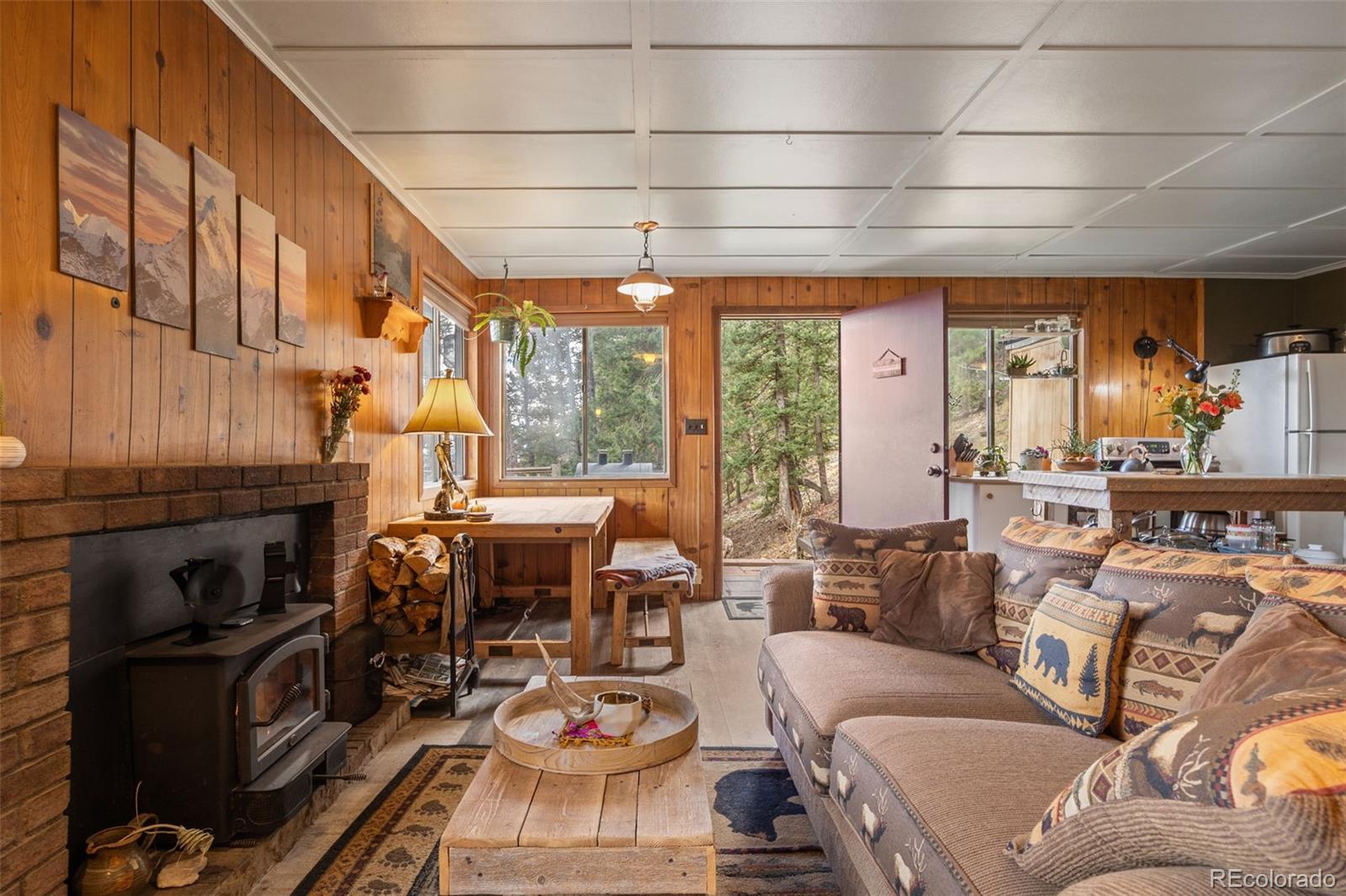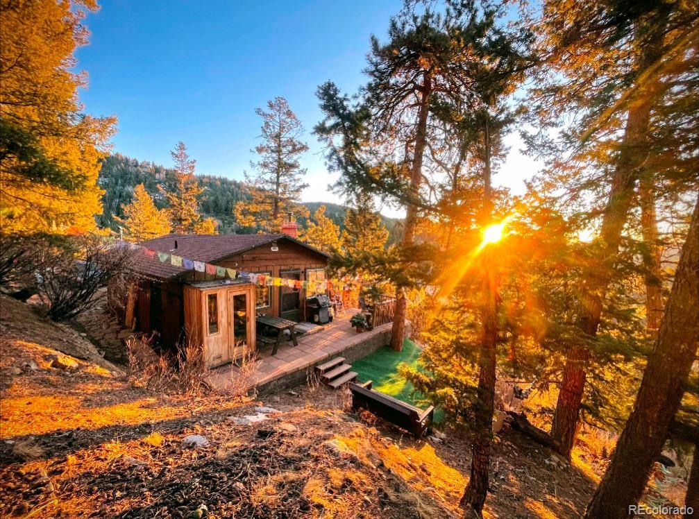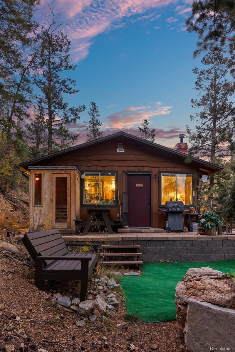 Perched high on the quiet side of Kings Valley, where the sunrise glows golden through the trees each morning, this soulful cabin offers a front-row seat to Colorado’s wild beauty. From the patio, Pikes Peak reveals itself in the distance, framed by an endless expanse of sky — a view that shifts with every passing hour. Here, nature takes center stage. Watch the storms roll in across the horizon, the sky breaking open with light and rainbows. Listen as the wind stirs through the aspens and the forest comes alive with birds gathering in your own backyard sanctuary. You’ll feel deeply connected — not just to the outdoors, but to something quieter and more sacred within yourself. The property borders Staunton State Park, so your next adventure begins right outside your door. Inside, the world slows down. A cozy two-bedroom, one-bath layout invites you to rest, reconnect, and lean into the moment. Sauna sessions at dawn. A cup of tea by the crackling fire. The scent of pine drifting in through an open window. Cookies baking in the oven while the snow falls soft and steady outside. This is not just a cabin — it’s a retreat for the soul. A place to feel, to dream, to remember who you are. Only 45 minutes from Denver, yet it feels worlds away. Come find your peace at 9,000 feet. Home Features Include: Public Water & Sewer - No HOA - Backs to Staunton State Park - Colorado Character - On-Demand Hot Water Heater - Hardwood Floors - Wood Coffered Ceiling - Hardwood Floors - Owned Propane Tank - Multiple Heat Sources - Newer Exterior Stain - Outdoor Infrared Sauna - Washer & Dryer Included - Two Outdoor Sheds - Teepee Tent Can Be Included for Additional $3000