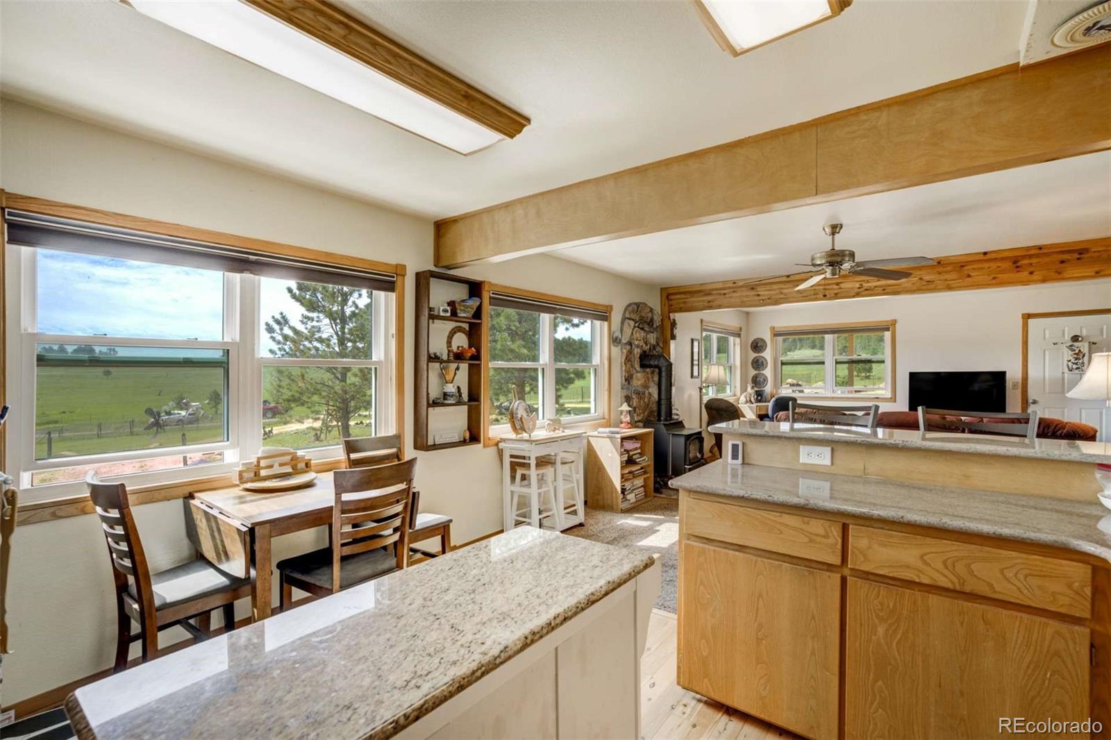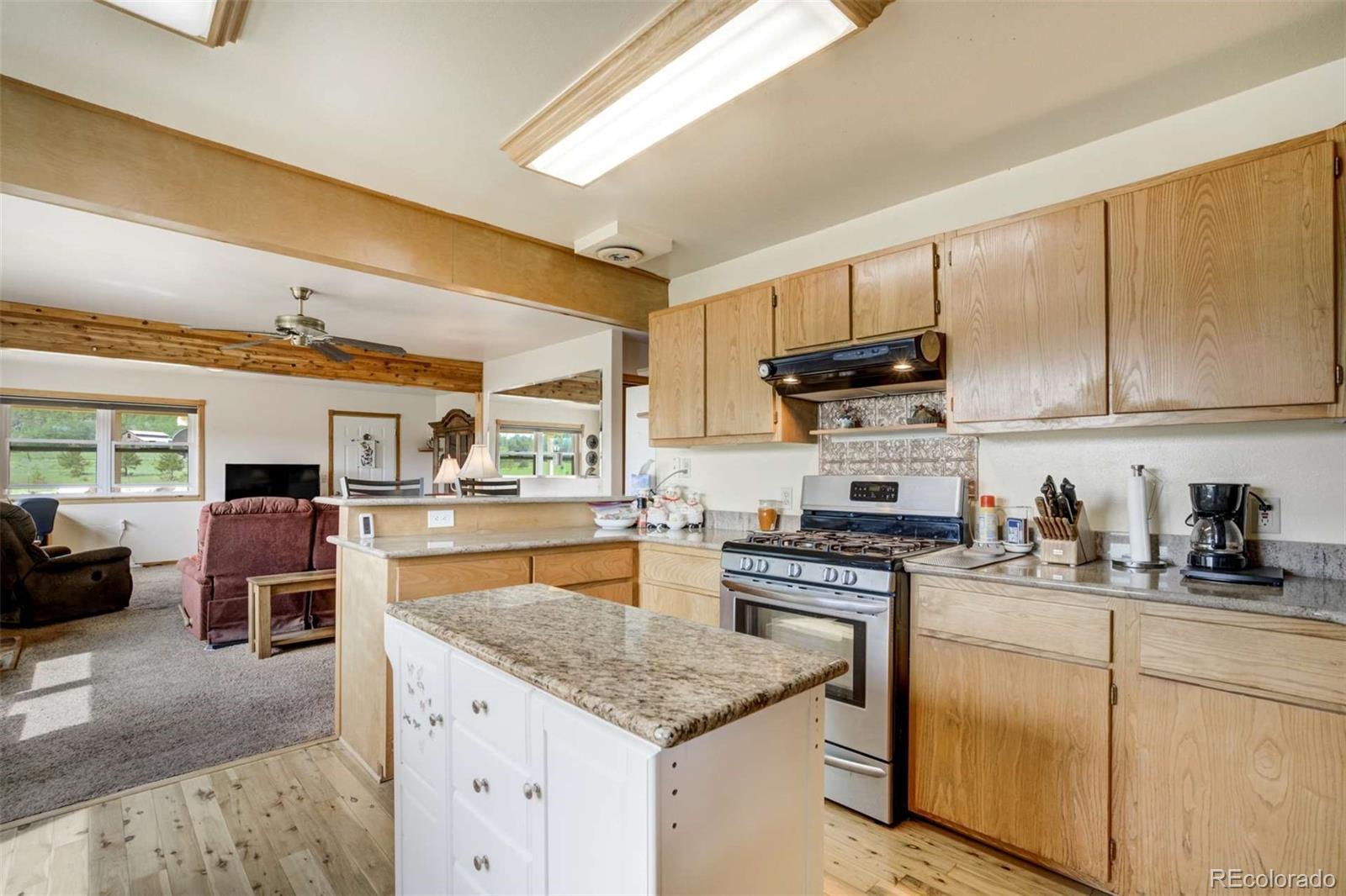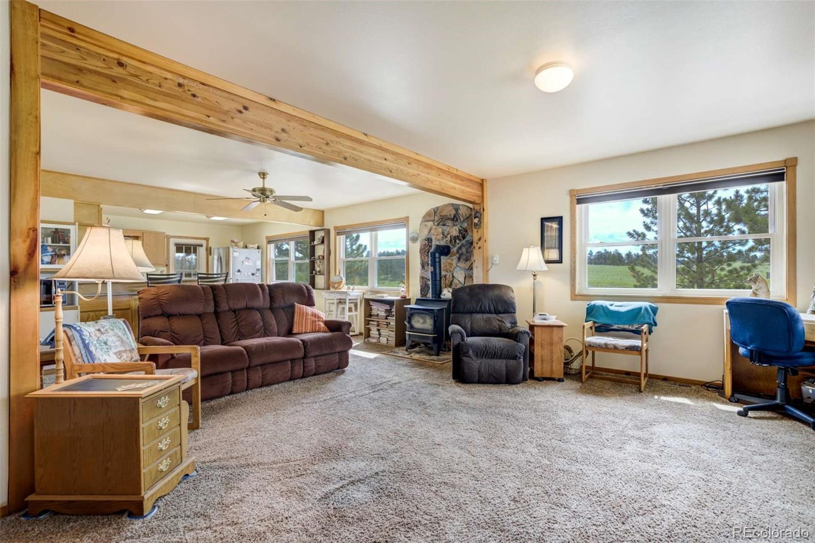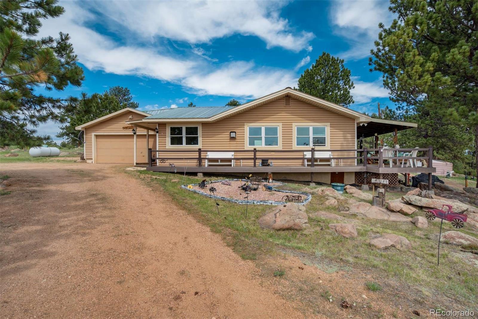 Discover unparalleled freedom and natural beauty with this captivating mountain retreat. Nestled on a sprawling 2.93-acre treed lot, this property offers abundant space for outdoor enjoyment and breathtaking mountain views. Embrace the tranquility of nature, with remarkable natural rock formations enhancing the landscape. Step inside and be greeted by a warm and inviting living space. The living room features charming exposed wood beams and a cozy stone-clad stove, perfect for chilly evenings. You'll find a harmonious blend of wood floors and comfortable carpeting throughout, bathed in an abundance of natural light. The heart of the home, the kitchen, is a delight with sleek granite countertops, stainless steel appliances, and a convenient walkout to a charming porch – ideal for enjoying your morning coffee amidst the serene surroundings. The primary bedroom boasts an adjoining bath for your comfort and privacy. A practical laundry room on the main level adds to the home's convenience. One of the well-appointed bathrooms includes a walk-in tub, providing ease of access. Beyond the main residence, you'll appreciate the spacious two-car garage, which features two versatile rooms off the side, offering flexible options to suit your needs. Additionally, a variety of outbuildings provide ample storage or can be adapted for various uses. This unique property, complete with its own septic and well systems, offers the ultimate in mountain living. Imagine endless possibilities for relaxation, recreation, and making cherished memories. Come experience the freedom and beauty this home has to offer!