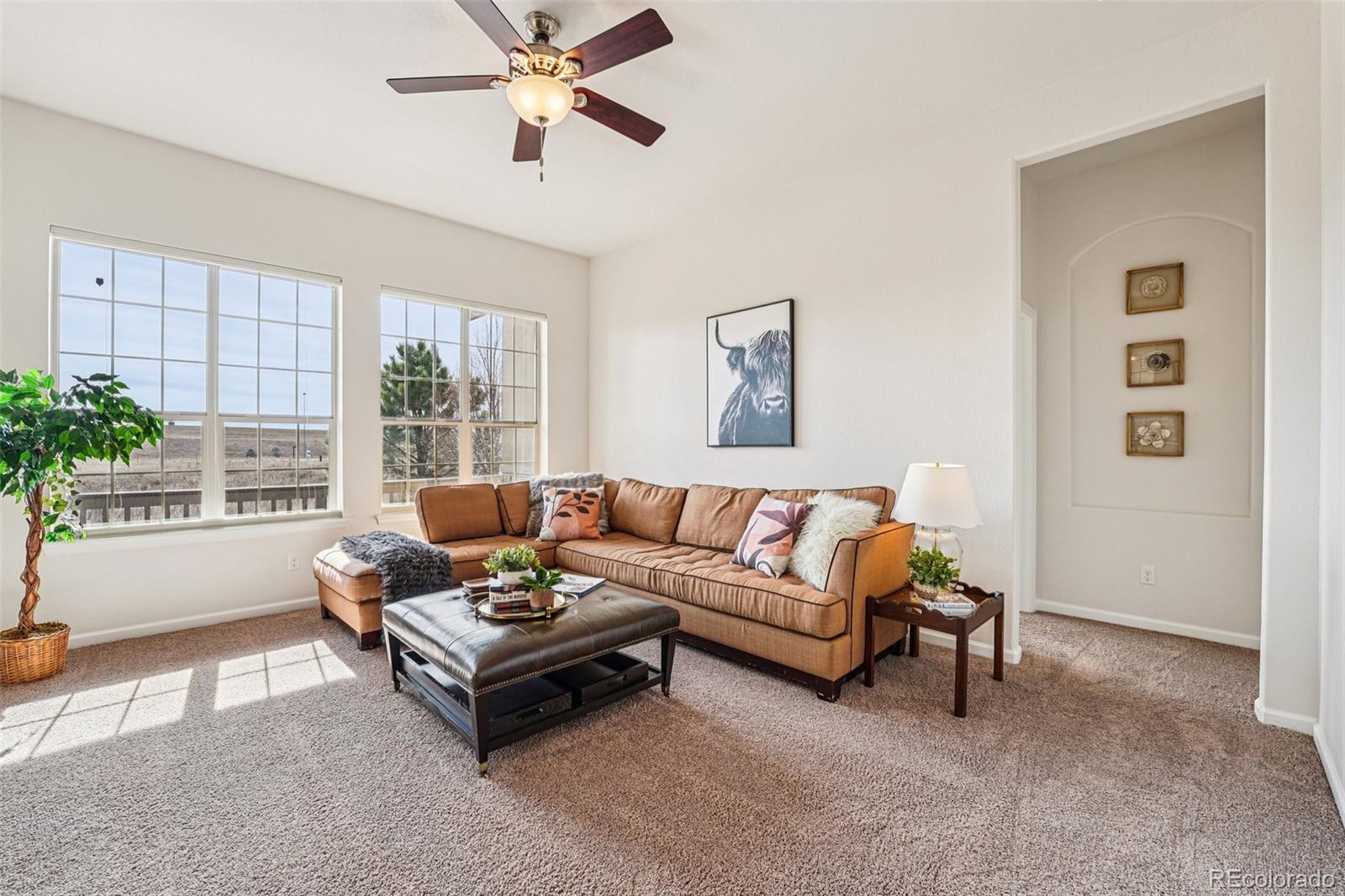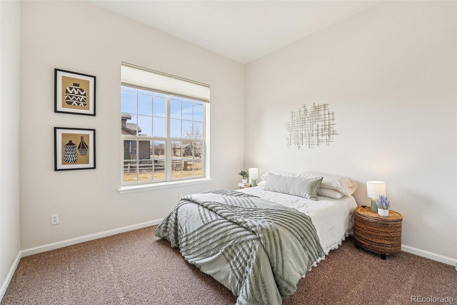 Check out this welcoming lifestyle community patio home at Anthem Ranch, the ultimate 55+ resort-style community! 2 beds/2 baths/2-car attached garage. This home is in such a great/peaceful setting - backs to open space, overlooking E-470 and has EXPANSIVE VIEWS of the Front Range. Enjoy the Colorado skies with no neighbors looking back at you on the covered back patio/deck! With fresh paint throughout, this home is move-in ready. The open floor plan allows the whole family to gather around the big island in the kitchen and lounge in the spacious family room to enjoy game night, cocktails, or just hanging with friends & family. There is also more space to gather in the flex room that is currently set up as a dining room. It would also be a great craft room or home office - TONS of flexibility! The generous primary suite will be your peaceful retreat at the end of the night, read a book, or catch up on your favorite Netflix show. You also get your own private ensuite bath & a large walk-in closet. The 2nd bed is great for guests - private, spacious; their own spot to relax. The full bath is right next door, perfect for guests visiting. The laundry/mud room is tucked away & comes with the washer & dryer. You’ll never be bored in Anthem Ranch - the clubhouse/community/rec center is stacked with upscale amenities like the indoor/outdoor pools, a walking track, fitness center, library, art & dance studios, outdoor bocce ball, pickleball, tennis courts, and even more surprises. Access to E-470, Boulder, restaurants, golf, and Downtown Lafayette is minutes away. All this and so much more to discover, you will want to experience it in person!