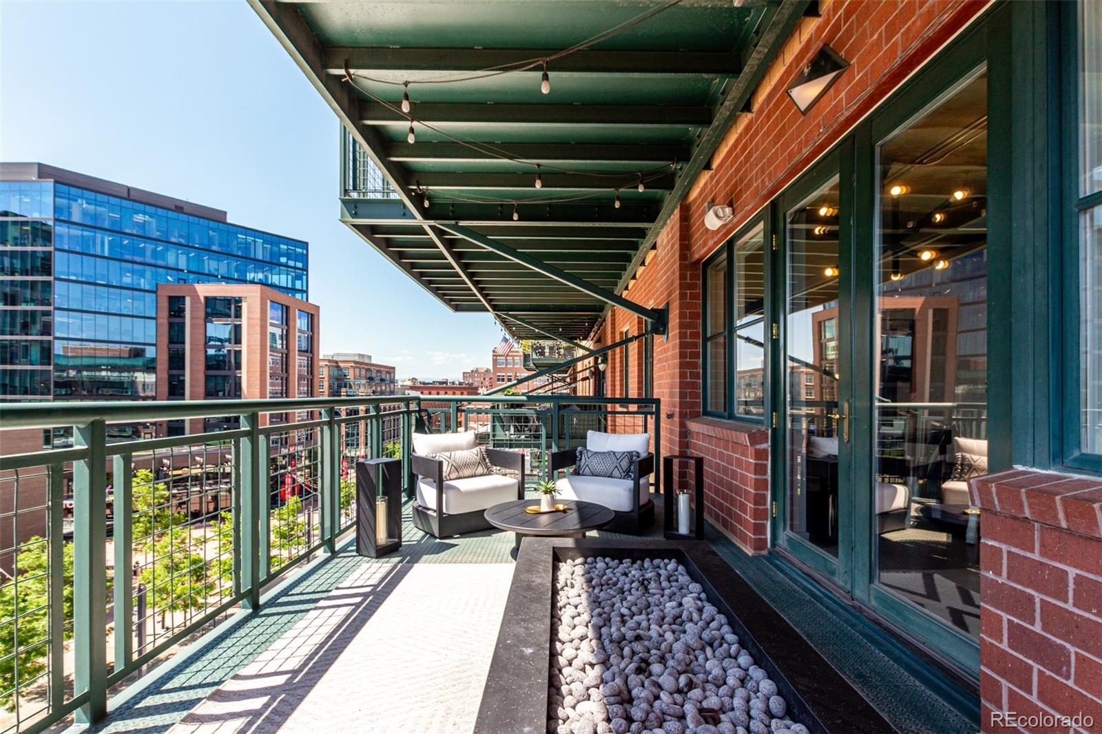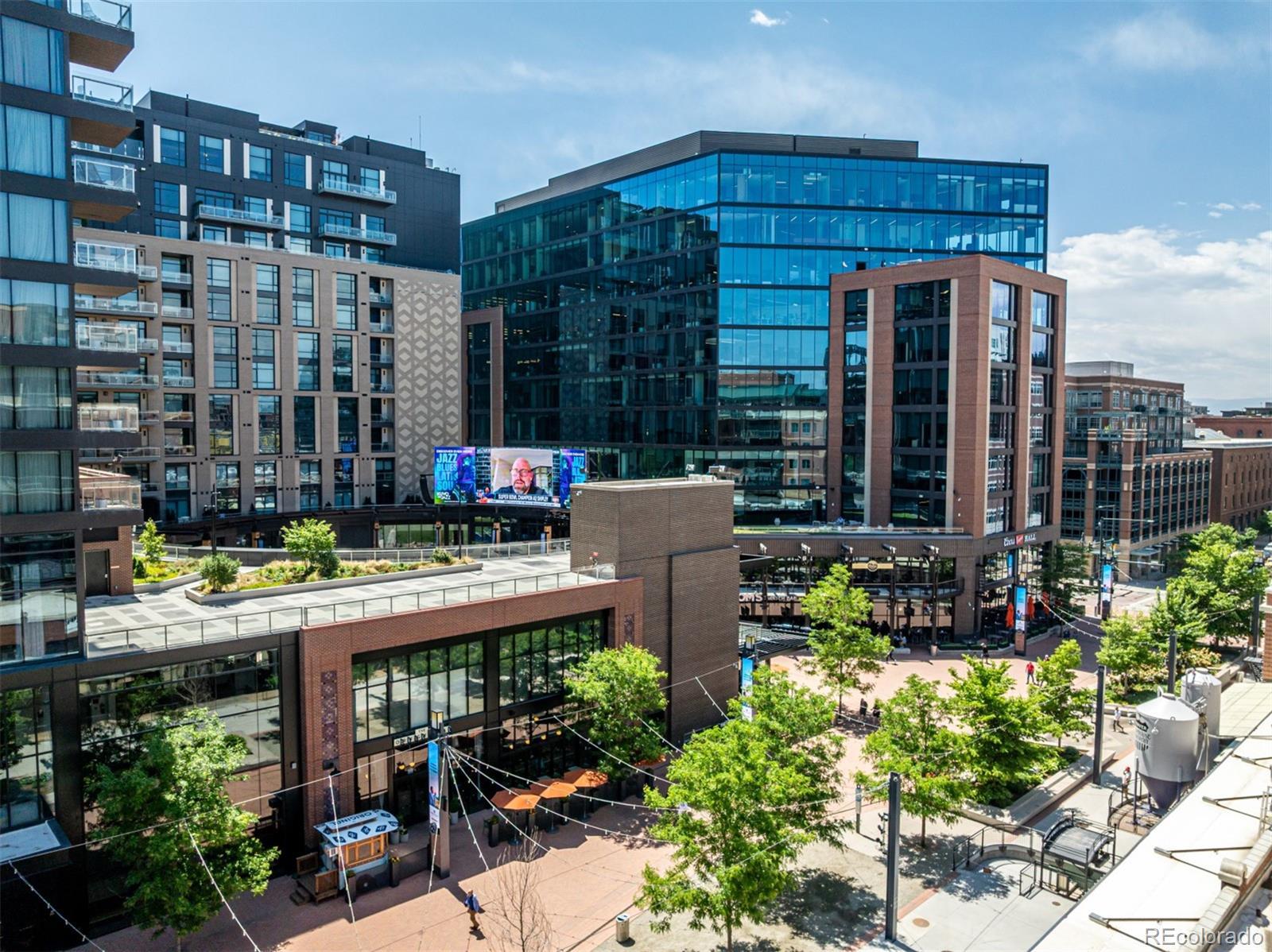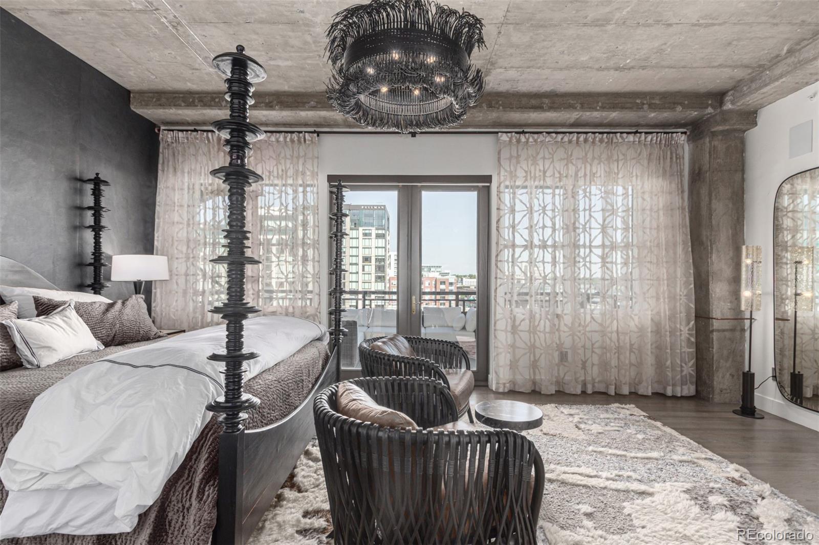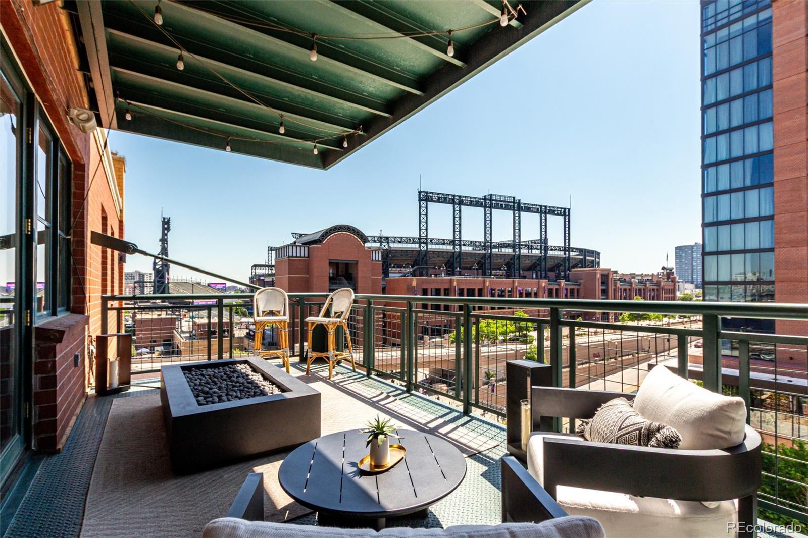 Emerge from the newly upgraded elevator into a private, light-filled entry with views of McGregor Square. This welcoming space includes custom cabinetry, a Murphy bed for guests, a large metal barn door for privacy, and chic décor with designer lighting and furnishings. Just beyond, a stylish open office features a tufted chair, desk, and whimsical stool under a custom chandelier, with a nearby guest bath showcasing designer tile, wood and stone vanity, and Delta fixtures. The chef’s kitchen impresses with a 7' x 7' butcher block island, aged black cabinetry, Sharp drawer microwave, two beverage fridges, and premium Thermador appliances. Burnt red subway tile, Tan Brown granite counters, glass display cabinets, and elegant lighting create a warm, functional space. Four hammered iron bar stools complete the look. Enjoy three balconies with stunning views. The 210 sq ft covered southeast balcony features a gas firepit, water spigot, and Restoration Hardware furniture. The northeast balcony is perfect for morning coffee or fireworks over Coors Field, while the northwest balcony, private to the primary suite, offers sunset and mountain glimpses. The dining area includes a charcoal wood table for eight, three custom chandeliers, and a full-height curio. The spacious living room offers a large L-shaped sofa, leather chairs, smart TV, and crystal chandelier. The guest bedroom features blackout drapes, king bed, smart TV, and adjacent steam bath. The primary suite includes a canopy bed, sitting area, walk-in closet, blackout shades, private balcony, and spa-like bath with Euro shower, double vanity, and in-suite laundry. Includes 2 tandem garage spaces, oversized storage, all in the heart of LoDo—next to Coors Field, across from McGregor Square, and just 2 blocks to Union Station and all restaurants, culture and sporting venues that Downtown has to offer. AVAILABLE FURNISHED - MOVE RIGHT IN!
