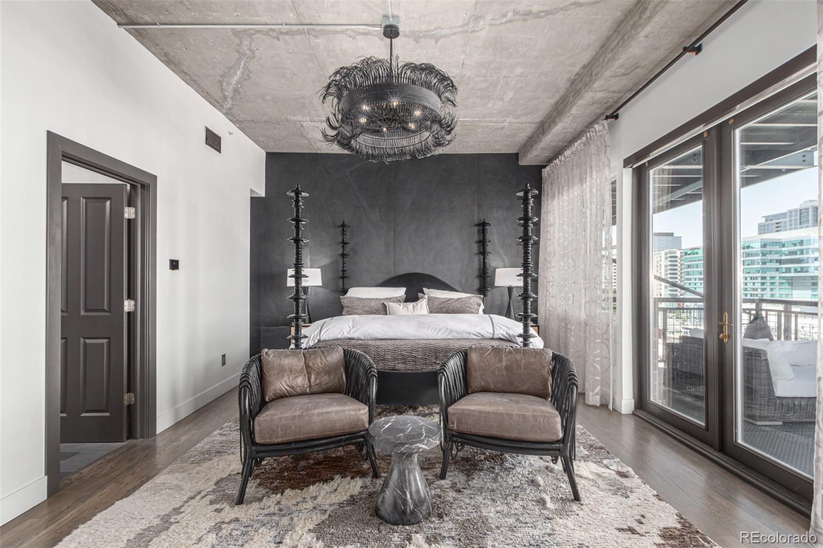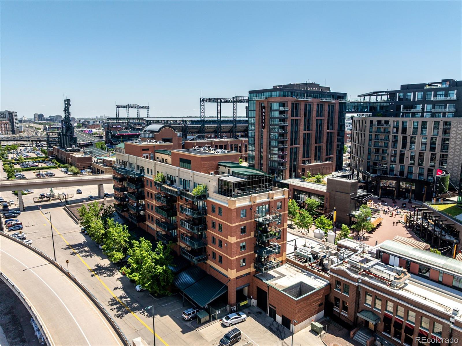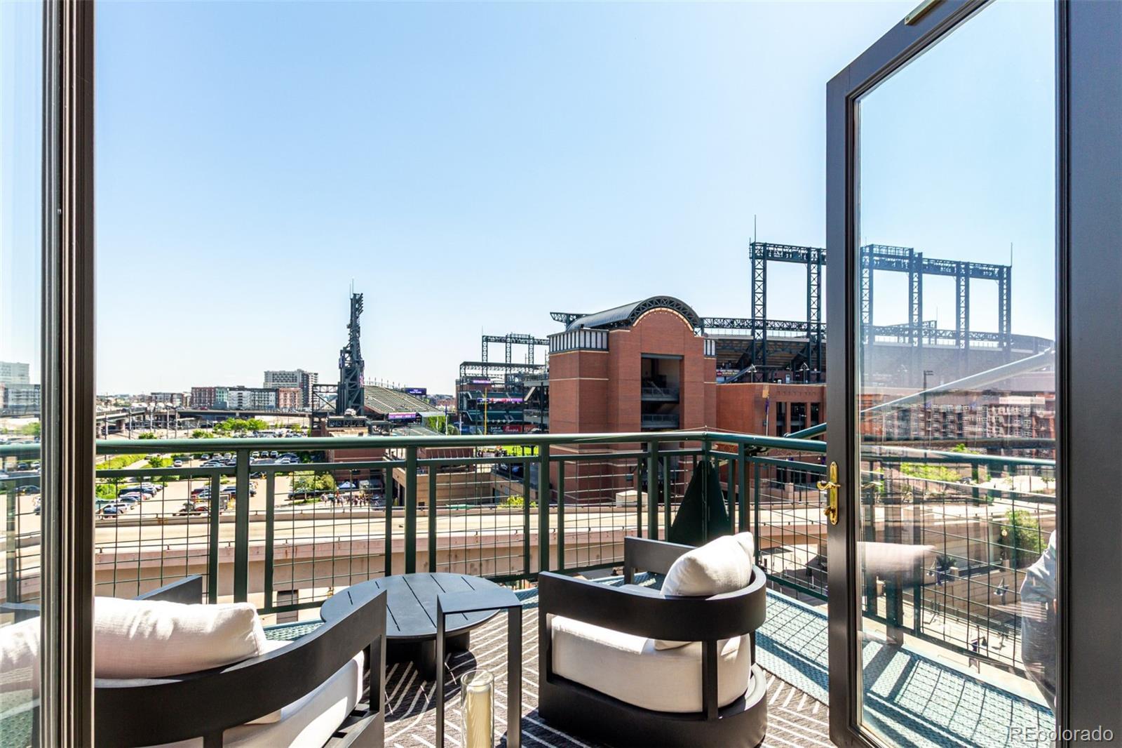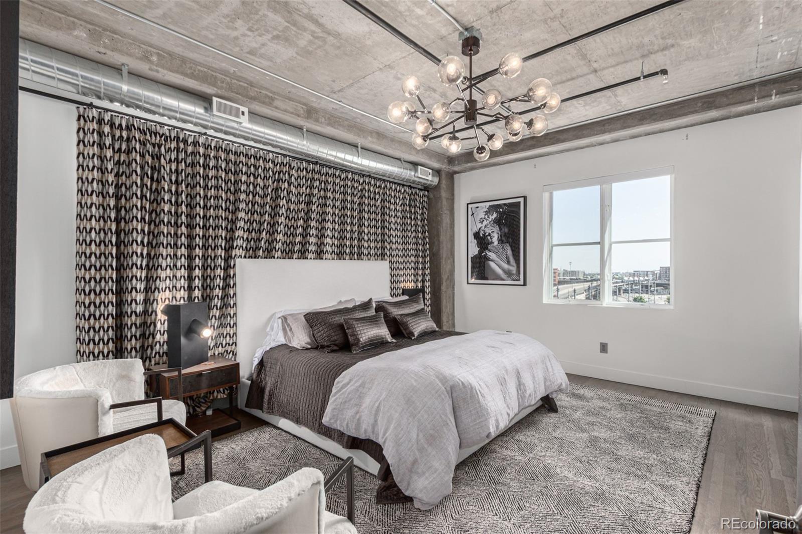 Emerge from the newly upgraded elevator into a private, light-filled entry with views of McGregor Square. This welcoming space includes custom cabinetry, a Murphy bed for guests, a large metal barn door for privacy, and chic décor with designer lighting and furnishings. Just beyond, a stylish open office features a tufted chair, desk, and whimsical stool under a custom chandelier, with a nearby guest bath showcasing designer tile, wood and stone vanity, and Delta fixtures. The chef’s kitchen impresses with a 7' x 7' butcher block island, aged black cabinetry, Sharp drawer microwave, two beverage fridges, and premium Thermador appliances. Burnt red subway tile, Tan Brown granite counters, glass display cabinets, and elegant lighting create a warm, functional space. Four hammered iron bar stools complete the look. Enjoy three balconies with stunning views. The 210 sq ft covered southeast balcony features a gas firepit, water spigot, and Restoration Hardware furniture. The northeast balcony is perfect for morning coffee or fireworks over Coors Field, while the northwest balcony, private to the primary suite, offers sunset and mountain glimpses. The dining area includes a charcoal wood table for eight, three custom chandeliers, and a full-height curio. The spacious living room offers a large L-shaped sofa, leather chairs, smart TV, and crystal chandelier. The guest bedroom features blackout drapes, king bed, smart TV, and adjacent steam bath. The primary suite includes a canopy bed, sitting area, walk-in closet, blackout shades, private balcony, and spa-like bath with Euro shower, double vanity, and in-suite laundry. Includes 2 tandem garage spaces, oversized storage, all in the heart of LoDo—next to Coors Field, across from McGregor Square, and just 2 blocks to Union Station and all restaurants, culture and sporting venues that Downtown has to offer. AVAILABLE FURNISHED - MOVE RIGHT IN!
