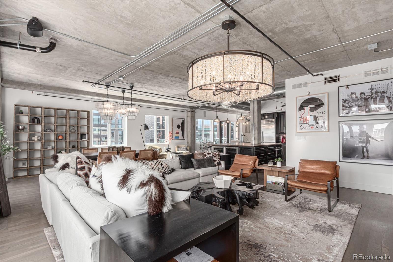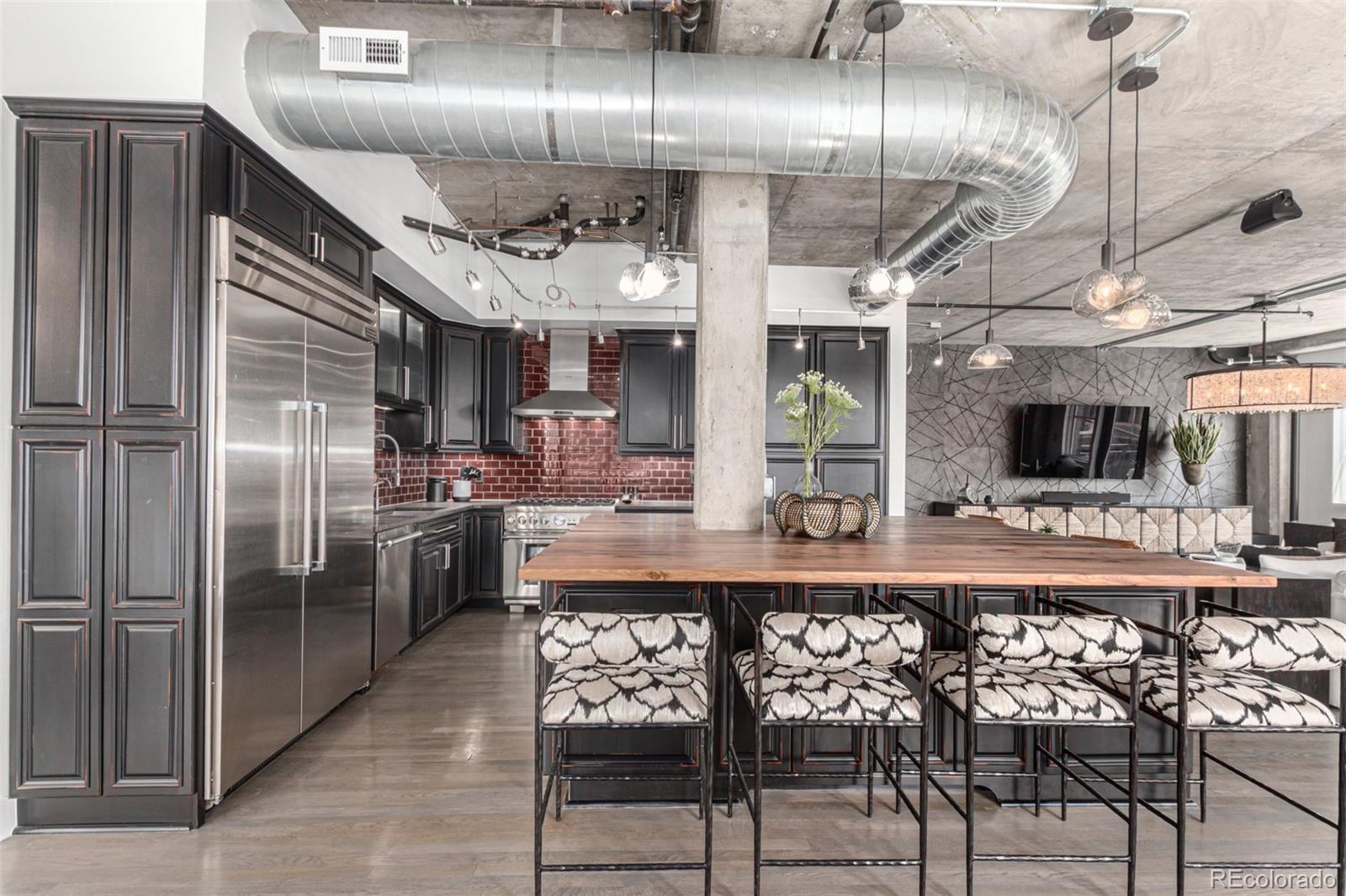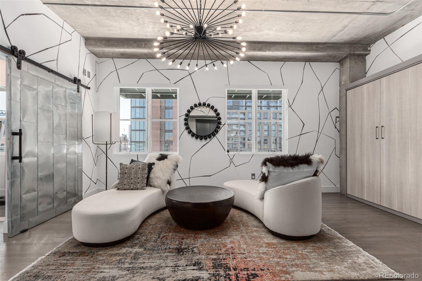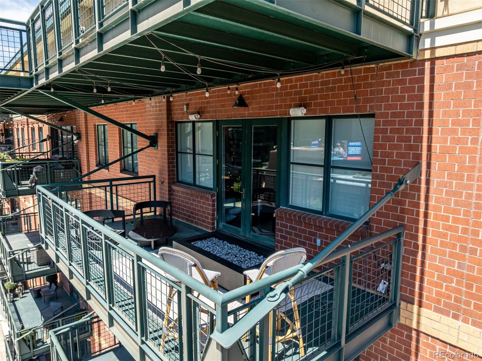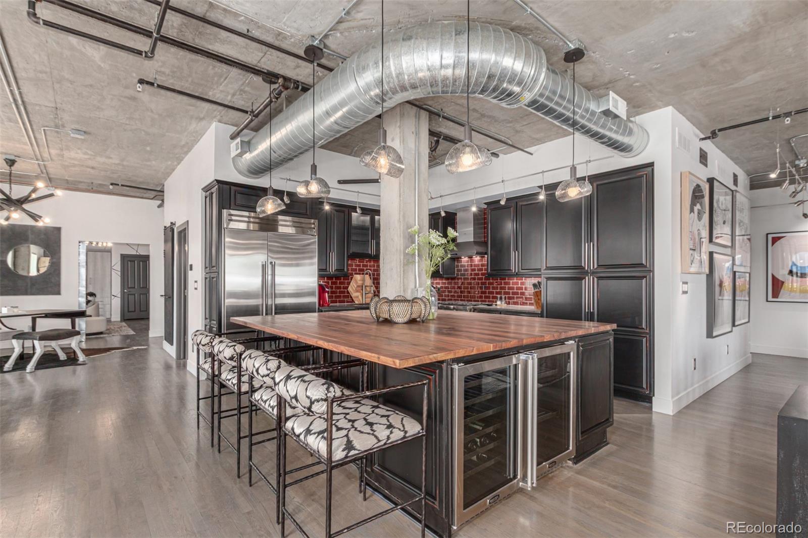 Emerge from the newly upgraded elevator into a private, light-filled entry with views of McGregor Square. This welcoming space includes custom cabinetry, a Murphy bed for guests, a large metal barn door for privacy, and chic décor with designer lighting and furnishings. Just beyond, a stylish open office features a tufted chair, desk, and whimsical stool under a custom chandelier, with a nearby guest bath showcasing designer tile, wood and stone vanity, and Delta fixtures. The chef’s kitchen impresses with a 7' x 7' butcher block island, aged black cabinetry, Sharp drawer microwave, two beverage fridges, and premium Thermador appliances. Burnt red subway tile, Tan Brown granite counters, glass display cabinets, and elegant lighting create a warm, functional space. Four hammered iron bar stools complete the look. Enjoy three balconies with stunning views. The 210 sq ft covered southeast balcony features a gas firepit, water spigot, and Restoration Hardware furniture. The northeast balcony is perfect for morning coffee or fireworks over Coors Field, while the northwest balcony, private to the primary suite, offers sunset and mountain glimpses. The dining area includes a charcoal wood table for eight, three custom chandeliers, and a full-height curio. The spacious living room offers a large L-shaped sofa, leather chairs, smart TV, and crystal chandelier. The guest bedroom features blackout drapes, king bed, smart TV, and adjacent steam bath. The primary suite includes a canopy bed, sitting area, walk-in closet, blackout shades, private balcony, and spa-like bath with Euro shower, double vanity, and in-suite laundry. Includes 2 tandem garage spaces, oversized storage, all in the heart of LoDo—next to Coors Field, across from McGregor Square, and just 2 blocks to Union Station and all restaurants, culture and sporting venues that Downtown has to offer. AVAILABLE FURNISHED - MOVE RIGHT IN!