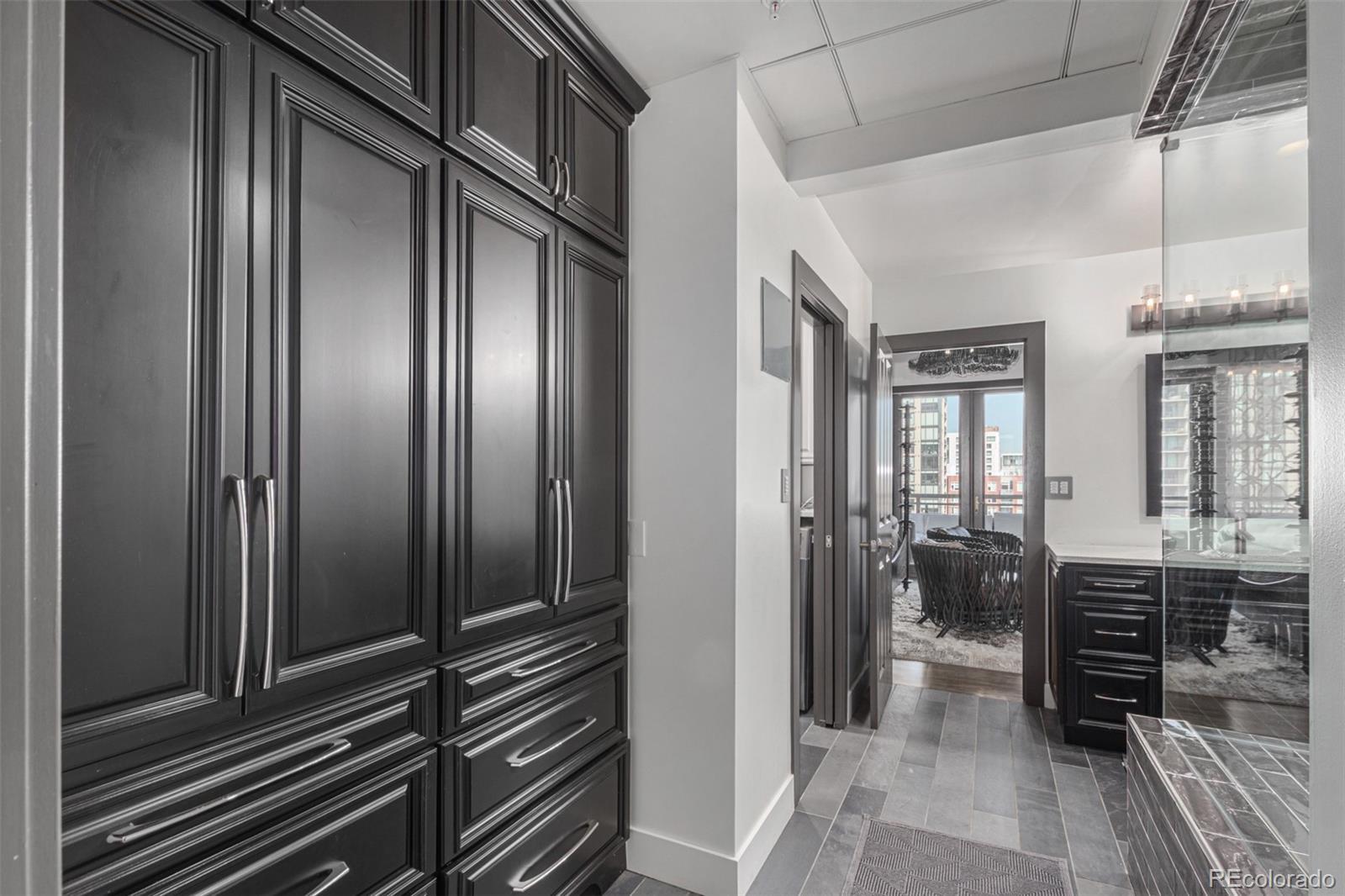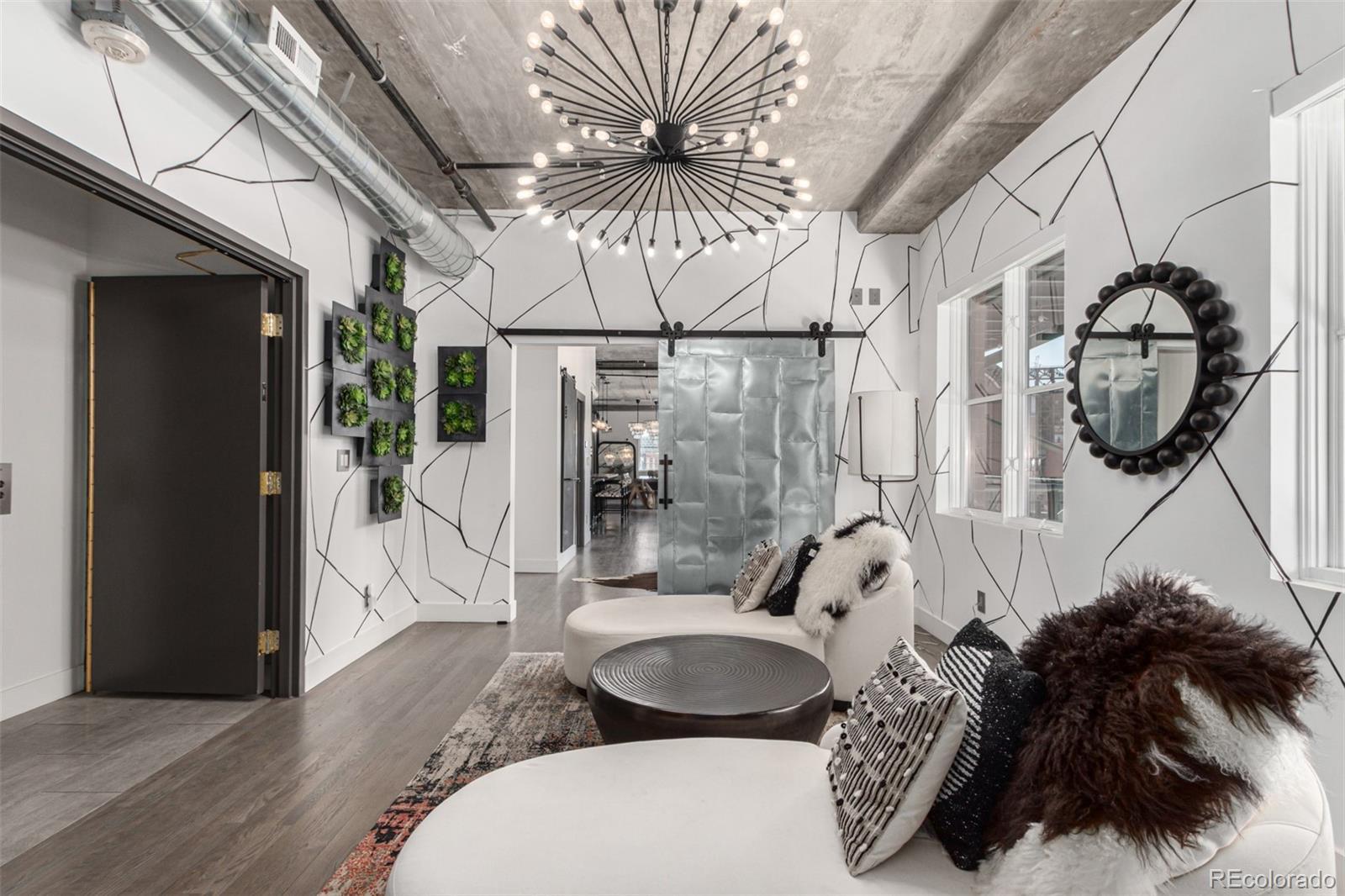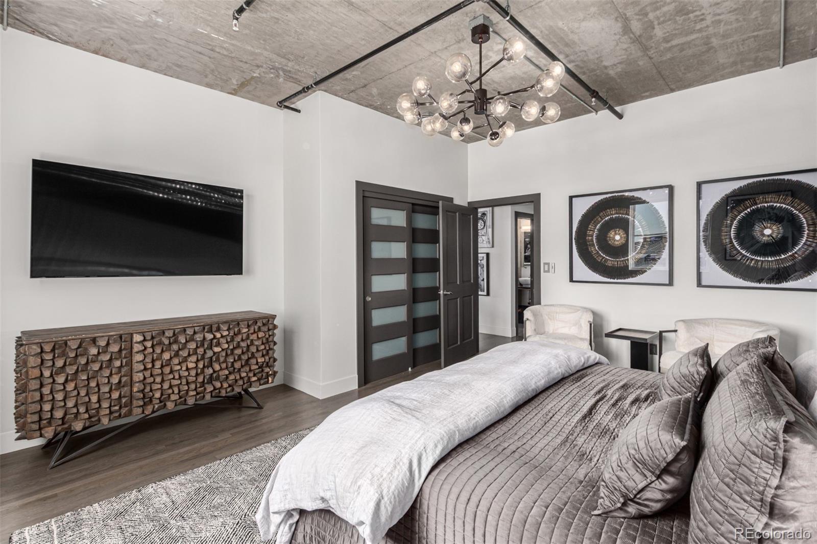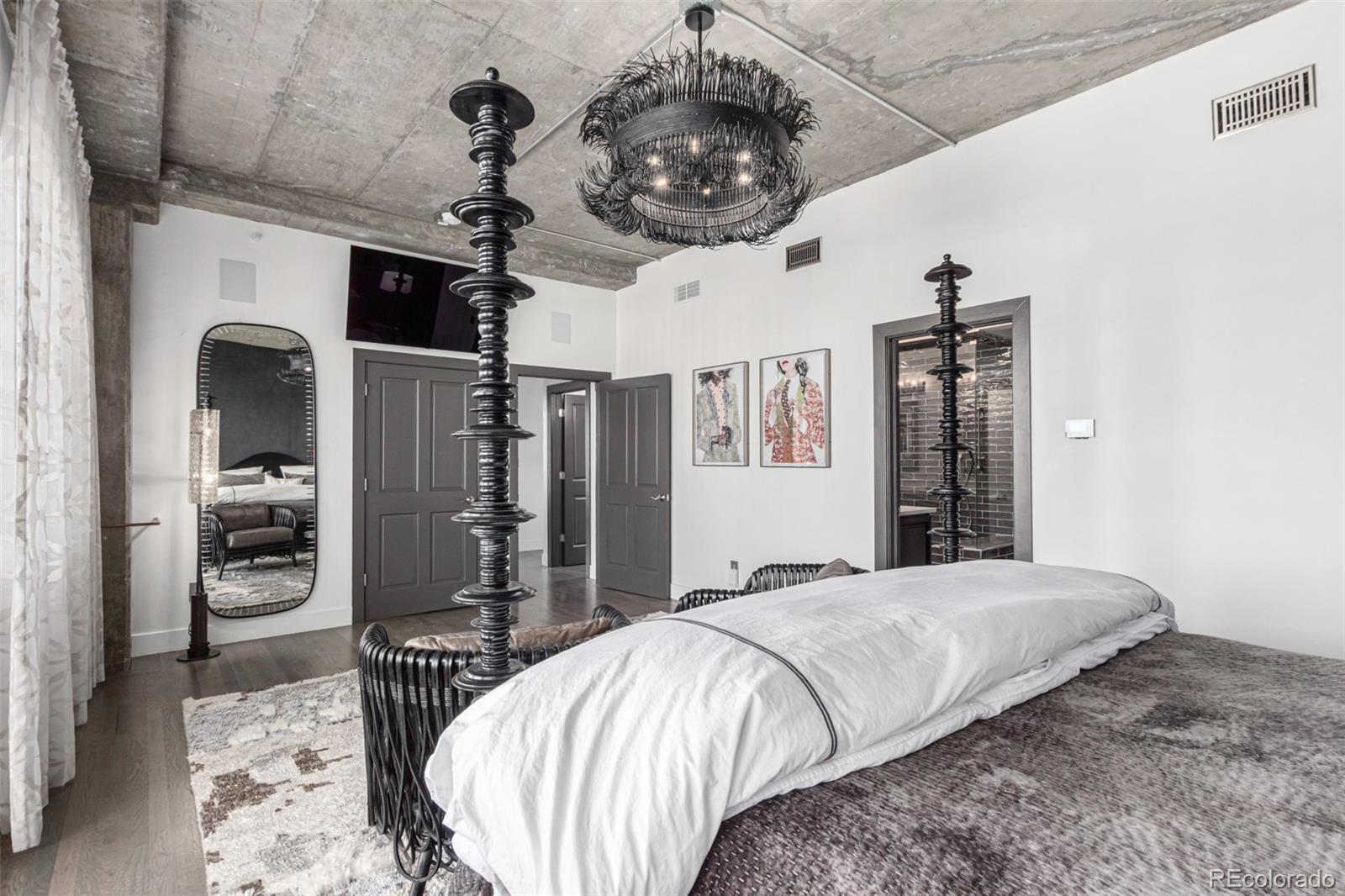 Emerge from the newly upgraded elevator into a private, light-filled entry with views of McGregor Square. This welcoming space includes custom cabinetry, a Murphy bed for guests, a large metal barn door for privacy, and chic décor with designer lighting and furnishings. Just beyond, a stylish open office features a tufted chair, desk, and whimsical stool under a custom chandelier, with a nearby guest bath showcasing designer tile, wood and stone vanity, and Delta fixtures. The chef’s kitchen impresses with a 7' x 7' butcher block island, aged black cabinetry, Sharp drawer microwave, two beverage fridges, and premium Thermador appliances. Burnt red subway tile, Tan Brown granite counters, glass display cabinets, and elegant lighting create a warm, functional space. Four hammered iron bar stools complete the look. Enjoy three balconies with stunning views. The 210 sq ft covered southeast balcony features a gas firepit, water spigot, and Restoration Hardware furniture. The northeast balcony is perfect for morning coffee or fireworks over Coors Field, while the northwest balcony, private to the primary suite, offers sunset and mountain glimpses. The dining area includes a charcoal wood table for eight, three custom chandeliers, and a full-height curio. The spacious living room offers a large L-shaped sofa, leather chairs, smart TV, and crystal chandelier. The guest bedroom features blackout drapes, king bed, smart TV, and adjacent steam bath. The primary suite includes a canopy bed, sitting area, walk-in closet, blackout shades, private balcony, and spa-like bath with Euro shower, double vanity, and in-suite laundry. Includes 2 tandem garage spaces, oversized storage, all in the heart of LoDo—next to Coors Field, across from McGregor Square, and just 2 blocks to Union Station and all restaurants, culture and sporting venues that Downtown has to offer. AVAILABLE FURNISHED - MOVE RIGHT IN!