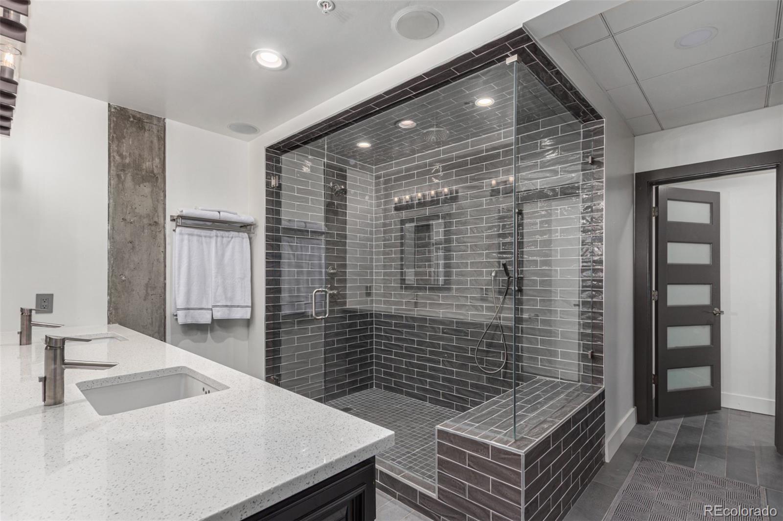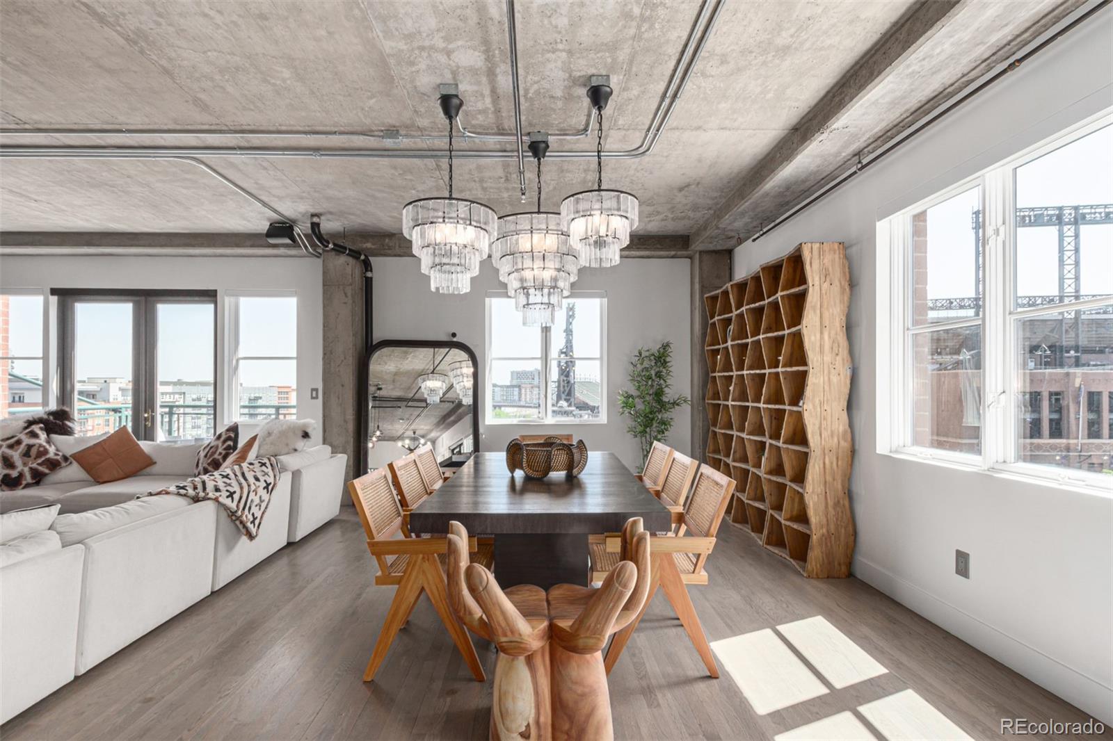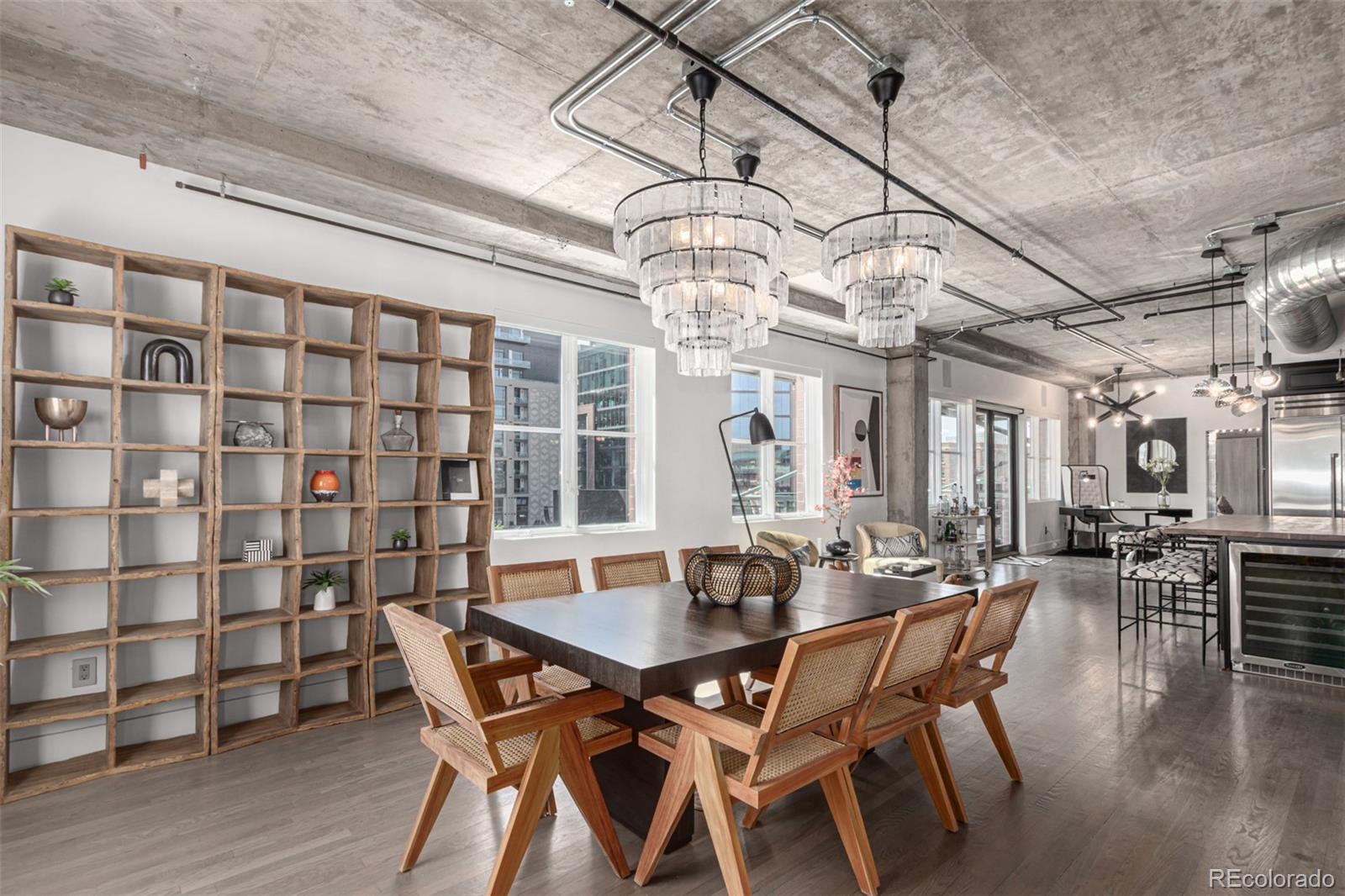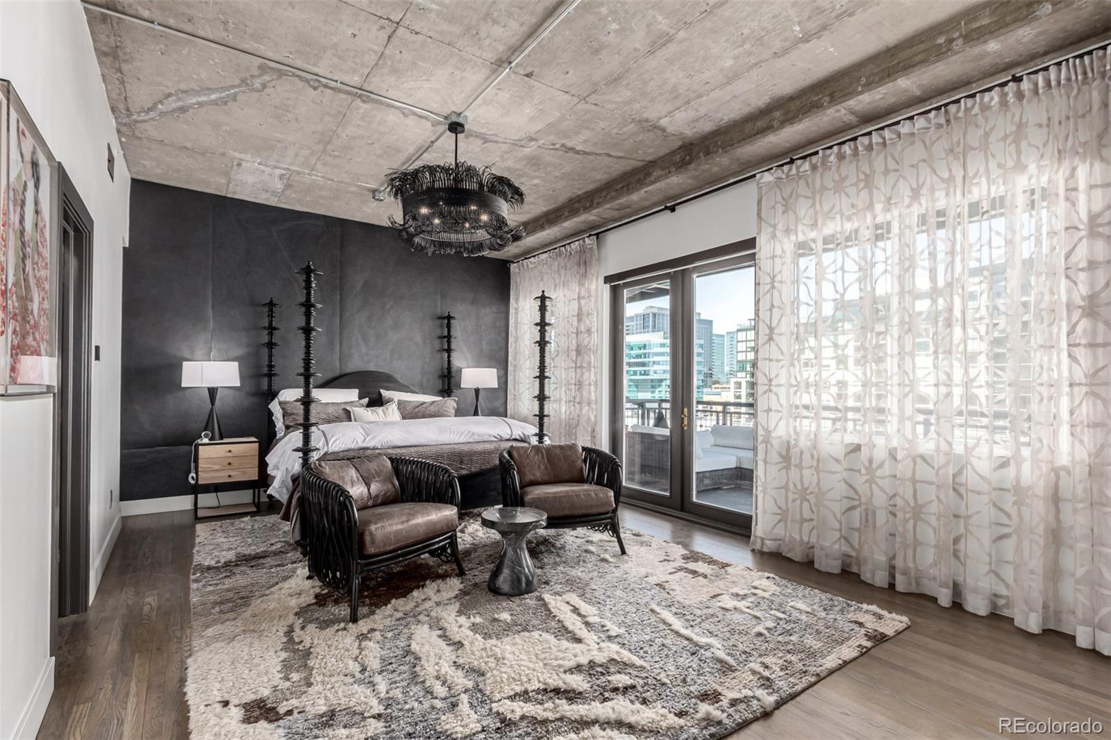 Emerge from the newly upgraded elevator into a private, light-filled entry with views of McGregor Square. This welcoming space includes custom cabinetry, a Murphy bed for guests, a large metal barn door for privacy, and chic décor with designer lighting and furnishings. Just beyond, a stylish open office features a tufted chair, desk, and whimsical stool under a custom chandelier, with a nearby guest bath showcasing designer tile, wood and stone vanity, and Delta fixtures. The chef’s kitchen impresses with a 7' x 7' butcher block island, aged black cabinetry, Sharp drawer microwave, two beverage fridges, and premium Thermador appliances. Burnt red subway tile, Tan Brown granite counters, glass display cabinets, and elegant lighting create a warm, functional space. Four hammered iron bar stools complete the look. Enjoy three balconies with stunning views. The 210 sq ft covered southeast balcony features a gas firepit, water spigot, and Restoration Hardware furniture. The northeast balcony is perfect for morning coffee or fireworks over Coors Field, while the northwest balcony, private to the primary suite, offers sunset and mountain glimpses. The dining area includes a charcoal wood table for eight, three custom chandeliers, and a full-height curio. The spacious living room offers a large L-shaped sofa, leather chairs, smart TV, and crystal chandelier. The guest bedroom features blackout drapes, king bed, smart TV, and adjacent steam bath. The primary suite includes a canopy bed, sitting area, walk-in closet, blackout shades, private balcony, and spa-like bath with Euro shower, double vanity, and in-suite laundry. Includes 2 tandem garage spaces, oversized storage, all in the heart of LoDo—next to Coors Field, across from McGregor Square, and just 2 blocks to Union Station and all restaurants, culture and sporting venues that Downtown has to offer. AVAILABLE FURNISHED - MOVE RIGHT IN!