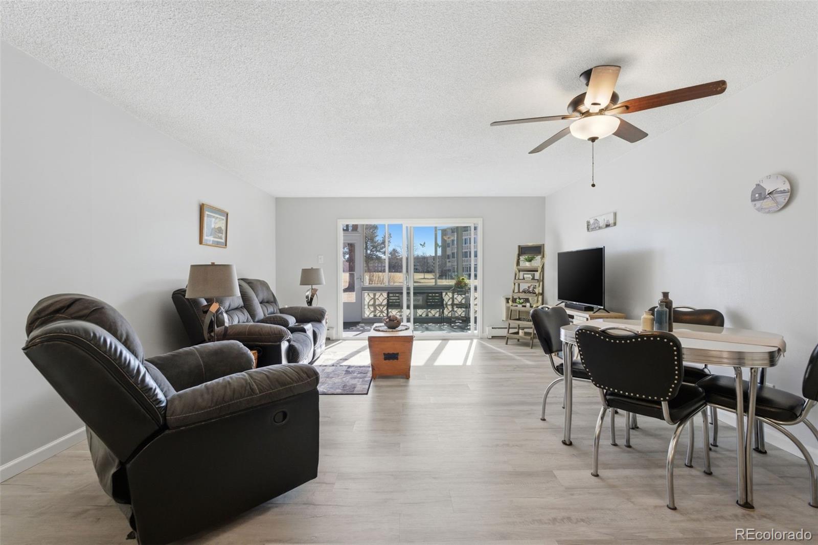 Location, location! Highly desired first-floor, south-facing corner unit right on the golf course! Building is next door to the clubhouse and all the amenities! 945 sq ft, 2 bed/1 bath, plus 1-car detached garage. Kitchen features soft-close doors, well thought out pantry, and pull-out trash/recycle cabinet. Granite countertops, tasteful backsplash, and stainless steel appliances. All new paint, baseboards, and flooring throughout the main living areas, carpet in bedrooms. New Anderson double pane windows and professionally custom made black out blinds in the bedrooms. Sealed enclosed lanai with tile floor and new custom door. Two AC unit! Bonus storage in the building. Located in one of Colorado’s largest 55+ active adult communities. FHA/VA approved. HOA dues include annual property taxes, plus heat, water, sewer, trash, 24-hour patrolling community responder, clubhouse with indoor & outdoor pools, hot tub, sauna, activities, and a 9-hole par 3 golf course open to the public.