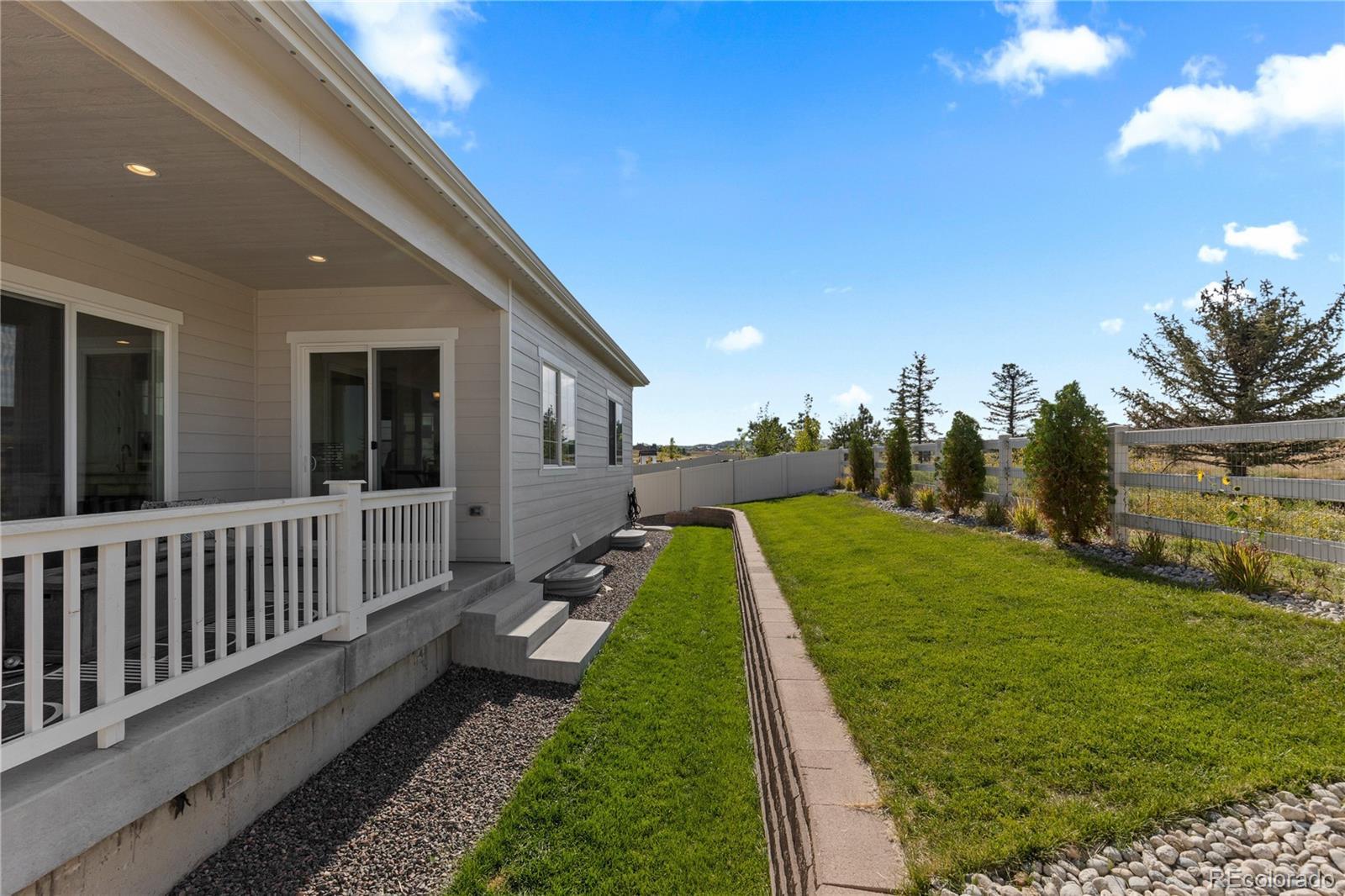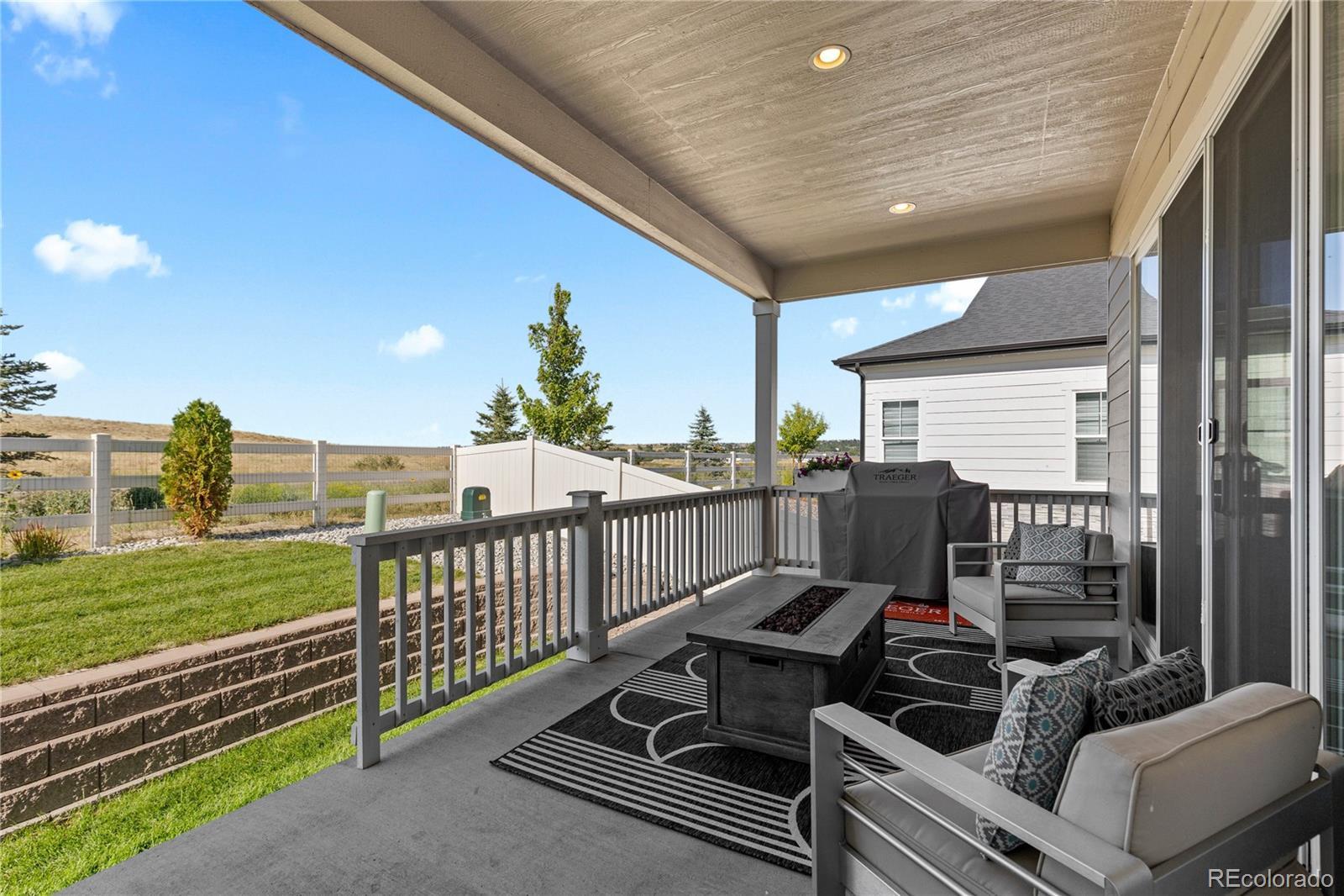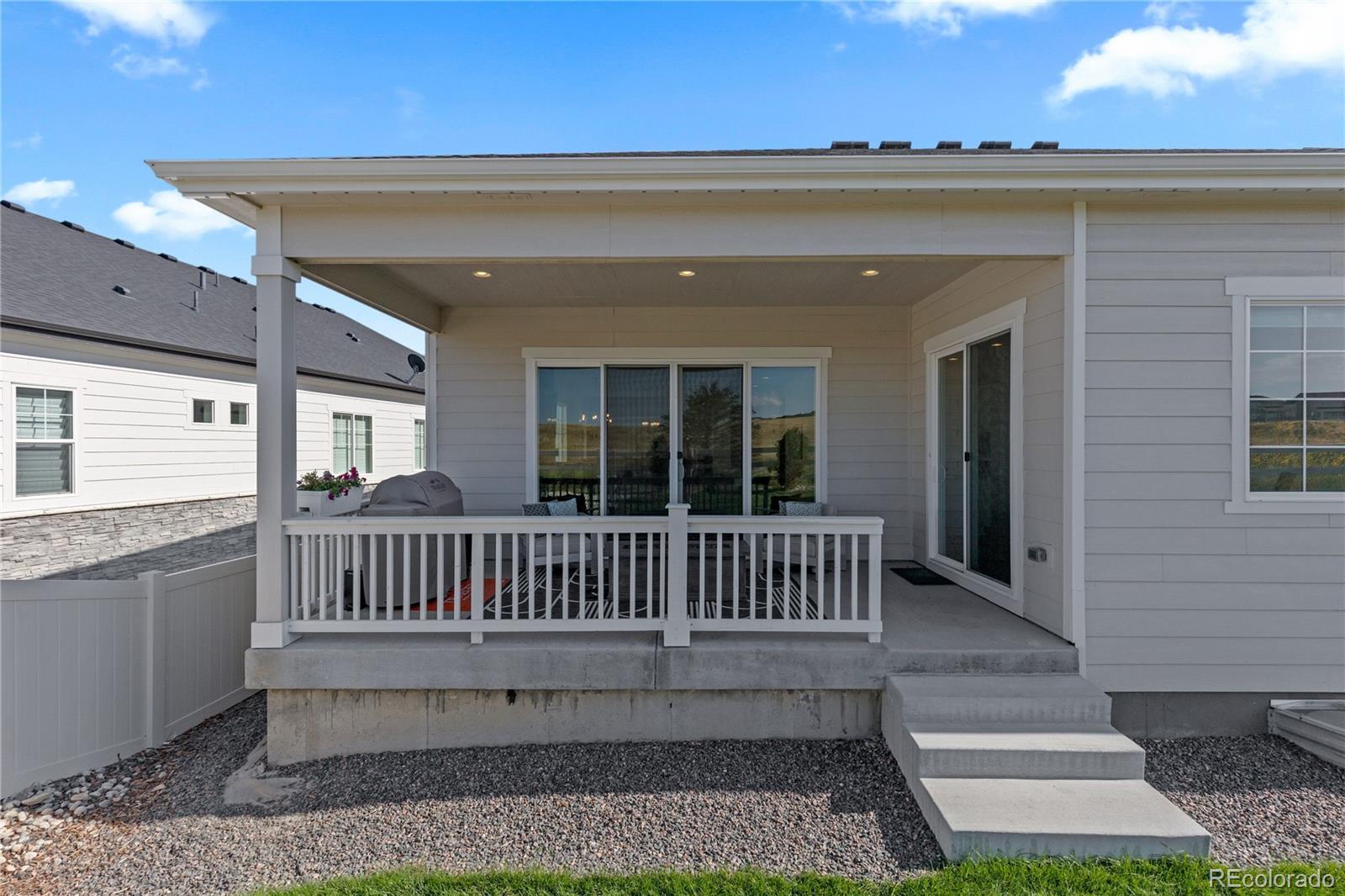 Set in Stone Creek Ranch, this 2022 ranch-style home captures sweeping views of Colorado’s rolling hills and offers a modern take on everyday living. Expansive windows fill the main level with natural light, creating a bright backdrop for both quiet mornings and lively gatherings. At the heart of the home, the chef’s kitchen boasts an oversized island, sleek subway tile backsplash, stainless steel appliances, and a walk-in pantry. The layout flows seamlessly into the dining area and great room, where a sleek fireplace anchors the space and sliding glass doors extend living outdoors. The primary suite serves as a private retreat with serene views, a spa-inspired bath, and a generous walk-in closet. The finished lower level expands the living space with a wet bar, media area, and room for fitness or guests. Additional highlights include a three-car garage, solar panels, thoughtful finishes throughout, and access to community amenities such as a pool, clubhouse, parks, and trails. Welcome home to modern design paired with the everyday comfort of Colorado living.