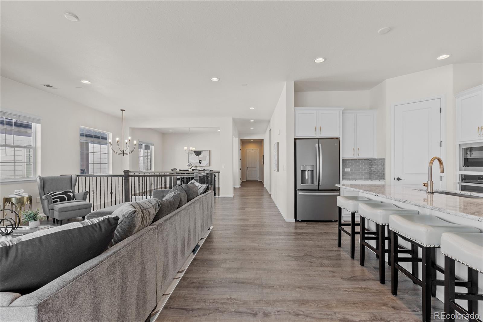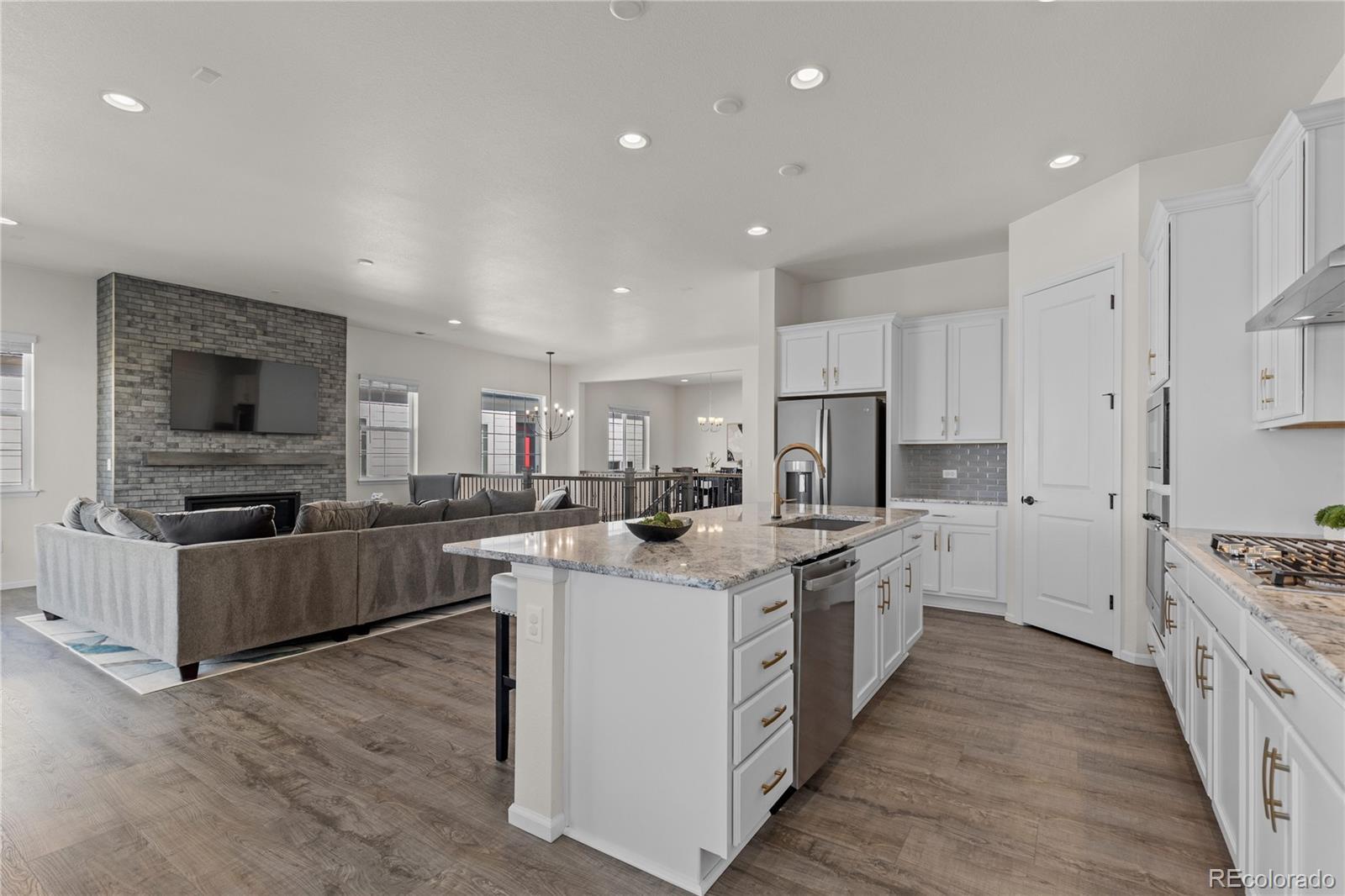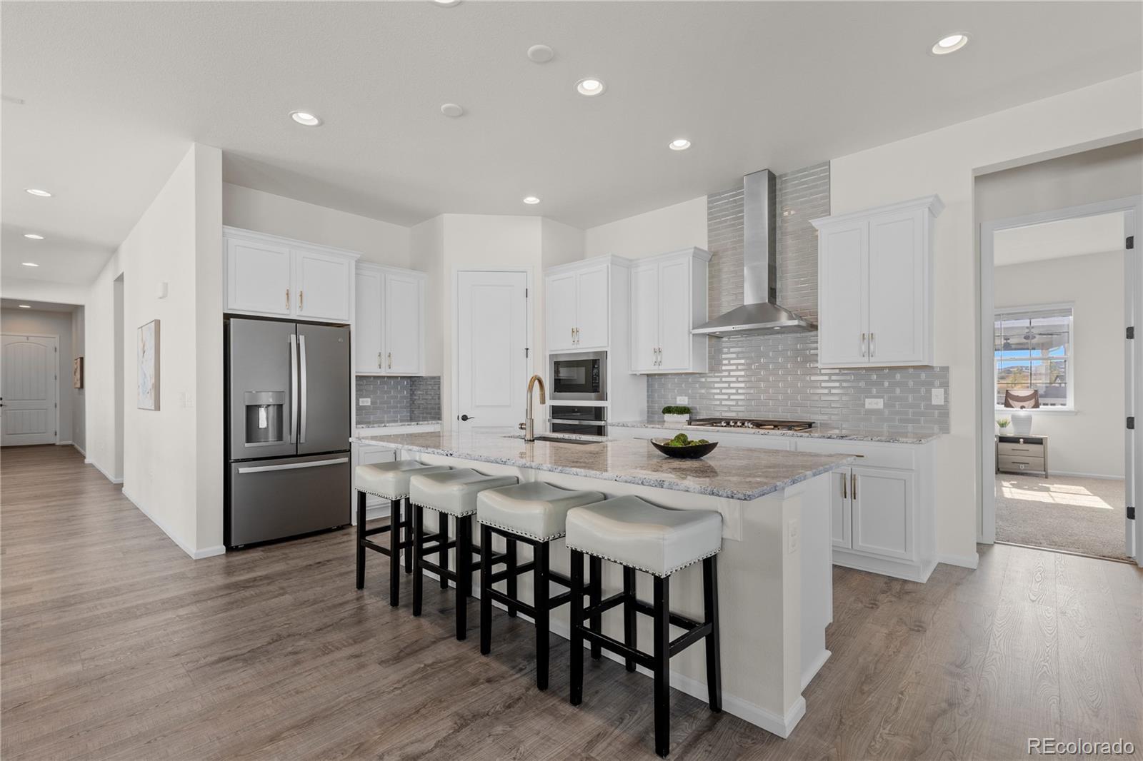Set in Stone Creek Ranch, this 2022 ranch-style home captures sweeping views of Colorado’s rolling hills and offers a modern take on everyday living. Expansive windows fill the main level with natural light, creating a bright backdrop for both quiet mornings and lively gatherings. At the heart of the home, the chef’s kitchen boasts an oversized island, sleek subway tile backsplash, stainless steel appliances, and a walk-in pantry. The layout flows seamlessly into the dining area and great room, where a sleek fireplace anchors the space and sliding glass doors extend living outdoors. The primary suite serves as a private retreat with serene views, a spa-inspired bath, and a generous walk-in closet. The finished lower level expands the living space with a wet bar, media area, and room for fitness or guests. Additional highlights include a three-car garage, solar panels, thoughtful finishes throughout, and access to community amenities such as a pool, clubhouse, parks, and trails. Welcome home to modern design paired with the everyday comfort of Colorado living.