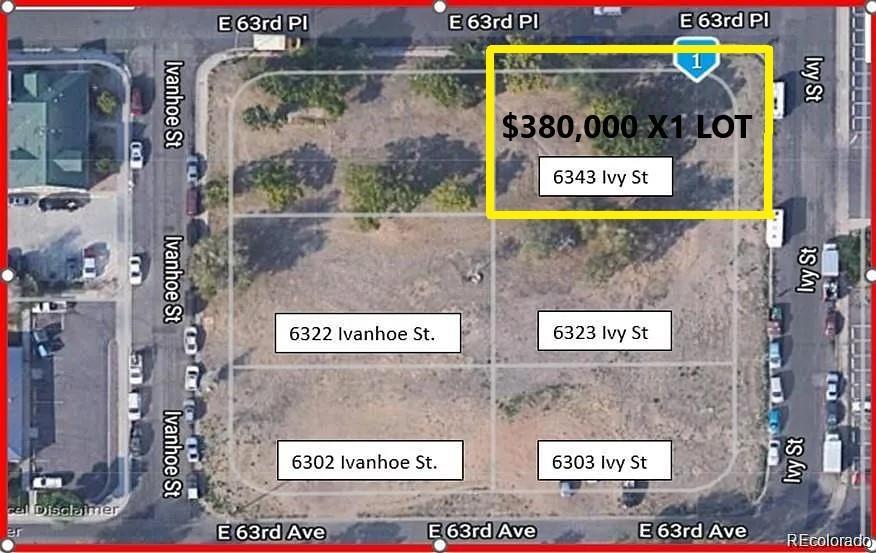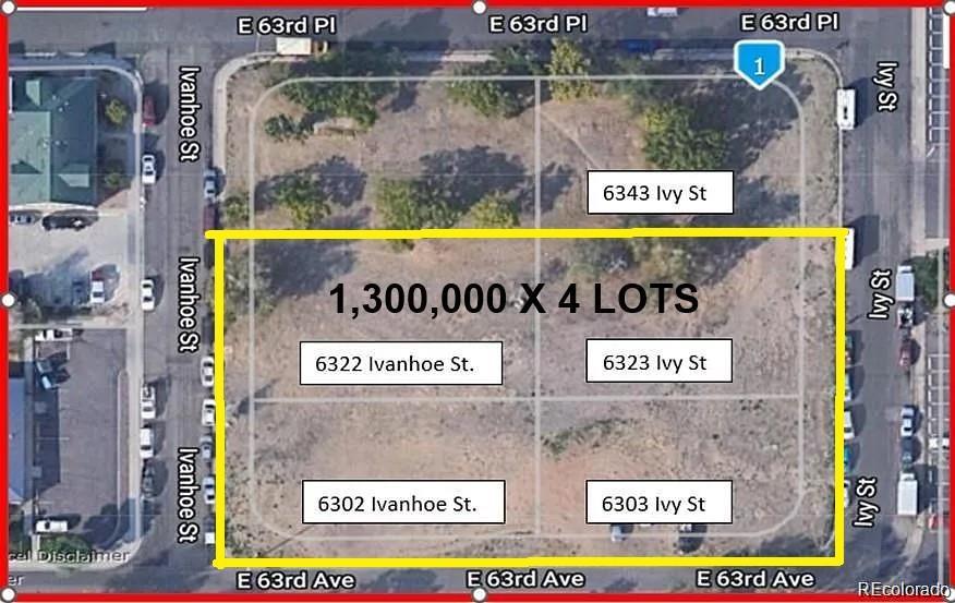 Commercial Infill opportunity with proximity to the 65-acre Urban Renewal project at Mile High Greyhound Park. Prefect for your Retail or Service businesses. Develop as one project or as 5 individual sites. The combined total land area is 1.24 Acres = 54,014 sq ft. Commerce City C-3 Zoning, Located in the Adams County Opportunity Zone. Growing area, numerous Commercial and Residential projects underway. The Greyhound Park development is projected to add 1000+ new Housing units, and 40,000 sq ft of new Retail plus a 122 room Hotel! 6322 Ivanhoe St is being sold along with four adjoining lots. Purchase the entire group or Seller is open to selling lots in bundles at reduced pricing. See photos for smaller bundled prices. Ready for your ideas. Unimproved Land. No Utilities, Water or Sewer. 2022 combined annual property taxes for all five lots $4,839. Owner Financing available...Call for details. Buyer to verify all. EXTENSIVE NUMBER OF USES ALLOWED BY RIGHT: Bar, tavern, night club, Brewpub, Catering services, Restaurant with drive-thru/up, Bank or financial institution, Convenience store/grocery store, Liquor store, delicatessen, retail bakery, specialty food market, coffee shop, Community garden, Greenhouse/nursery/tree production Veterinary offices or clinics, Building Materials & Services , Fuel sales with minor vehicle repair, Business or professional, Massage therapy office/clinics, Instructional services, studios, Bingo establishments, movie theaters, Health clubs, Furniture or appliance repair, Machinery sales, Retail business store, Tattoo parlor, Thrift/consignment store, Automobile washing facility, Motor vehicle dealer/sales, new and used automobiles, Tire shop, Vehicle repair (minor), Hotel or motels, Microbrewery, Winery, Medical marijuana center, Retail marijuana store, Trailer sales and service, Events center, Child care center, Adult day care center, Church or religious institution, Assisted living facility, Nursing homes.