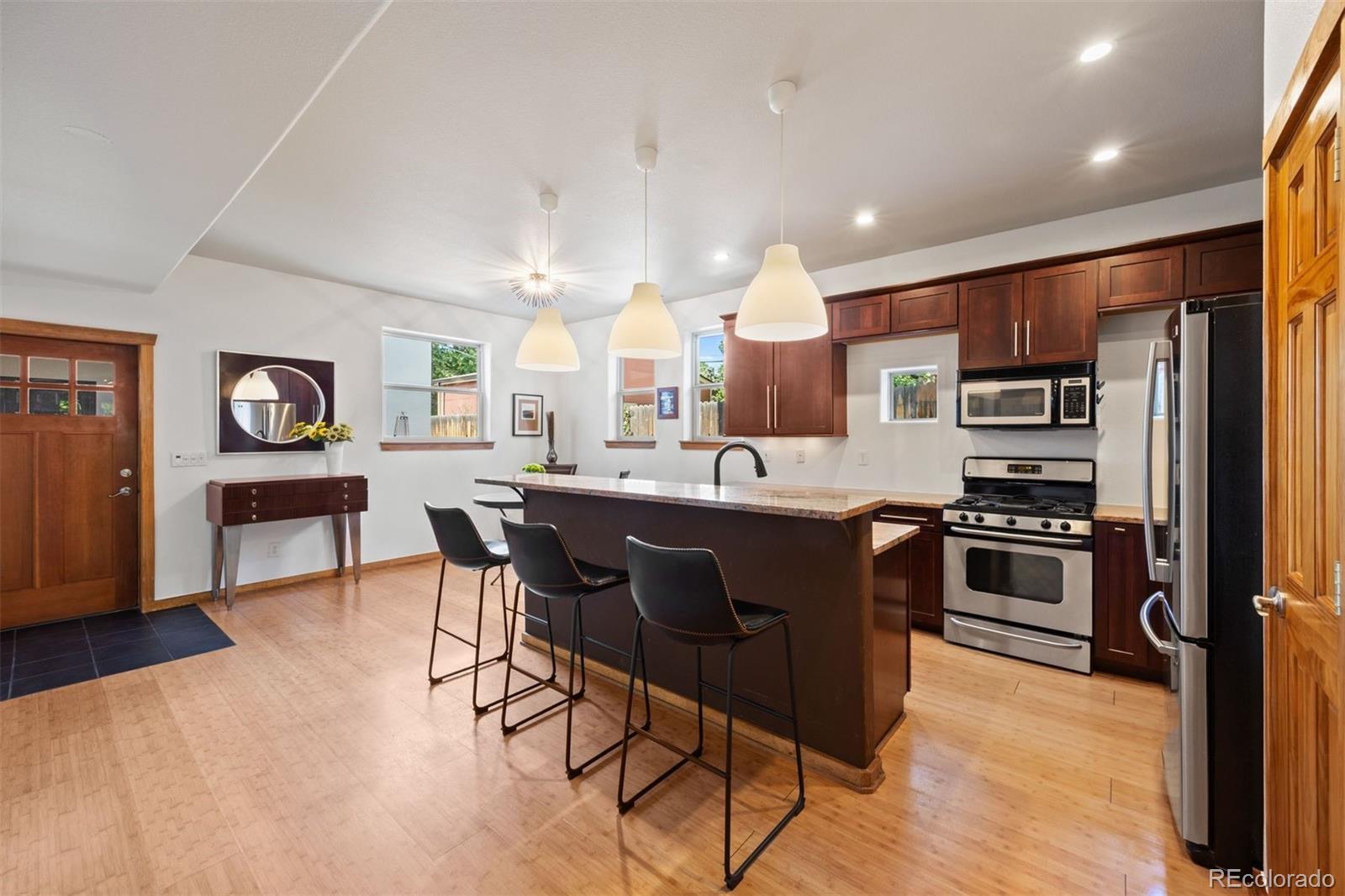 Baker Neighborhood Hidden Gem with Courtyard, Rooftop Deck & 2-Car Garage Discover a rare blend of privacy, style, and convenience in the heart of Denver’s Baker neighborhood. This residence offers a private entrance, charming courtyard, two-car garage, and expansive rooftop deck—all in one of the city’s most desirable urban settings. Built with ICF construction for increased energy efficiency and sound proofing. A welcoming covered front sitting area sets the tone for this home’s inviting character. Inside, a spacious foyer with gallery-style art walls flows seamlessly into the open living room with a cozy fireplace and the well-appointed kitchen. The kitchen boasts granite countertops, stainless steel appliances, and a bar-height counter—perfect for casual dining or entertaining. Designed for indoor-outdoor living, the kitchen opens directly to a private courtyard with a partially covered patio and garden space. The attached two-car garage connects effortlessly to this area, enhancing the home’s functional and thoughtful layout. Upstairs, you’ll find three bedrooms—including two with ensuite baths—plus a convenient laundry area and a generous rooftop deck ideal for entertaining, relaxing, or stargazing. The primary suite includes a spacious walk-in closet, dual vanities, and a linen closet for added storage. Baker itself is a center for art and culture, a legacy of both historic and modern influences. Beloved by art lovers and culture seekers alike, it offers walkability to acclaimed restaurants, boutique shopping, and vibrant nightlife in the Santa Fe Arts District and along Broadway. This dynamic cultural hub blends creativity, history, and charm in a way few Denver neighborhoods can. All of this comes with unmatched access to the best of Denver—just minutes from Cherry Creek’s upscale shopping and dining and Downtown Denver’s thriving business and entertainment districts. With character, convenience, and culture at your doorstep.