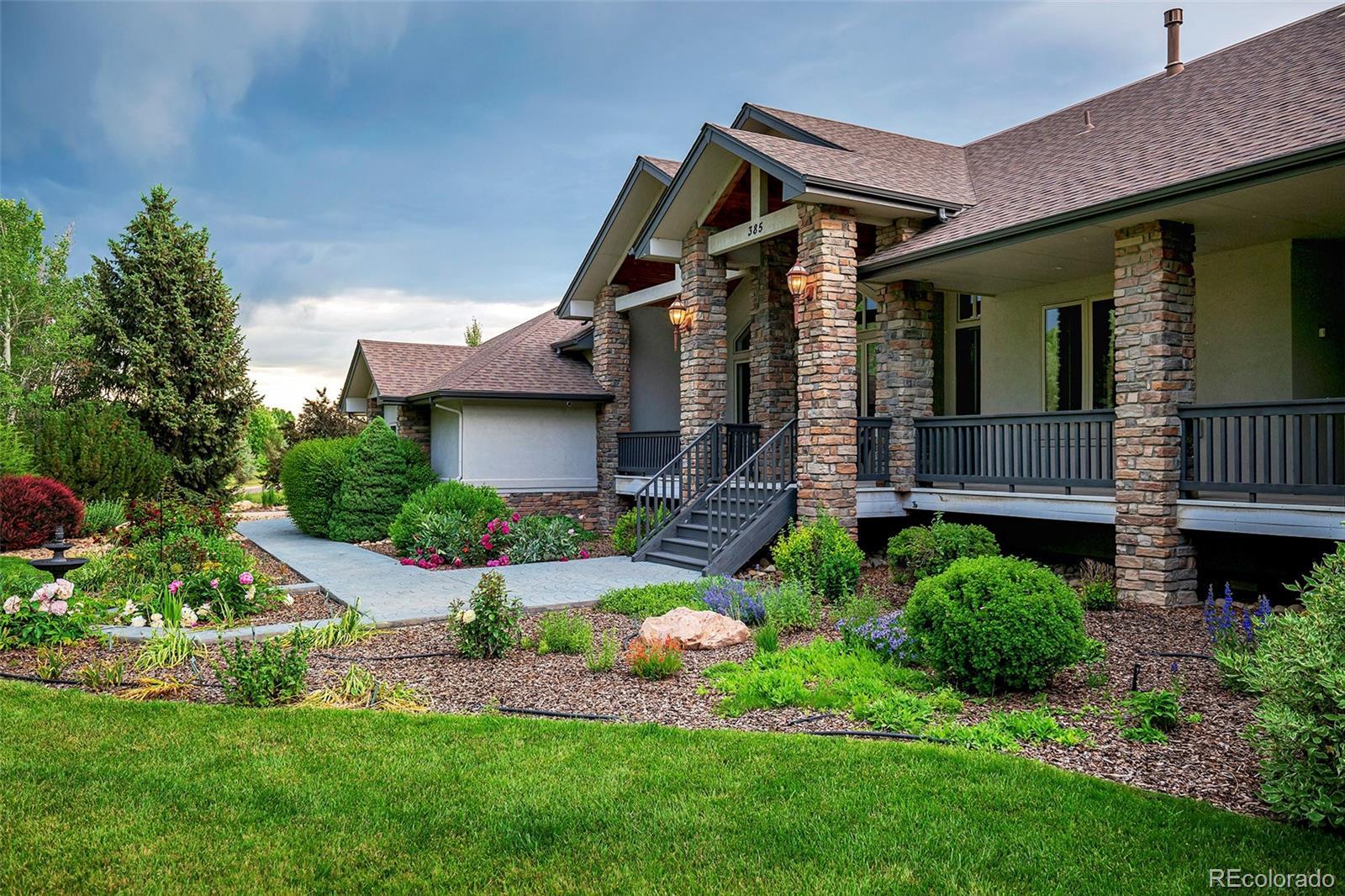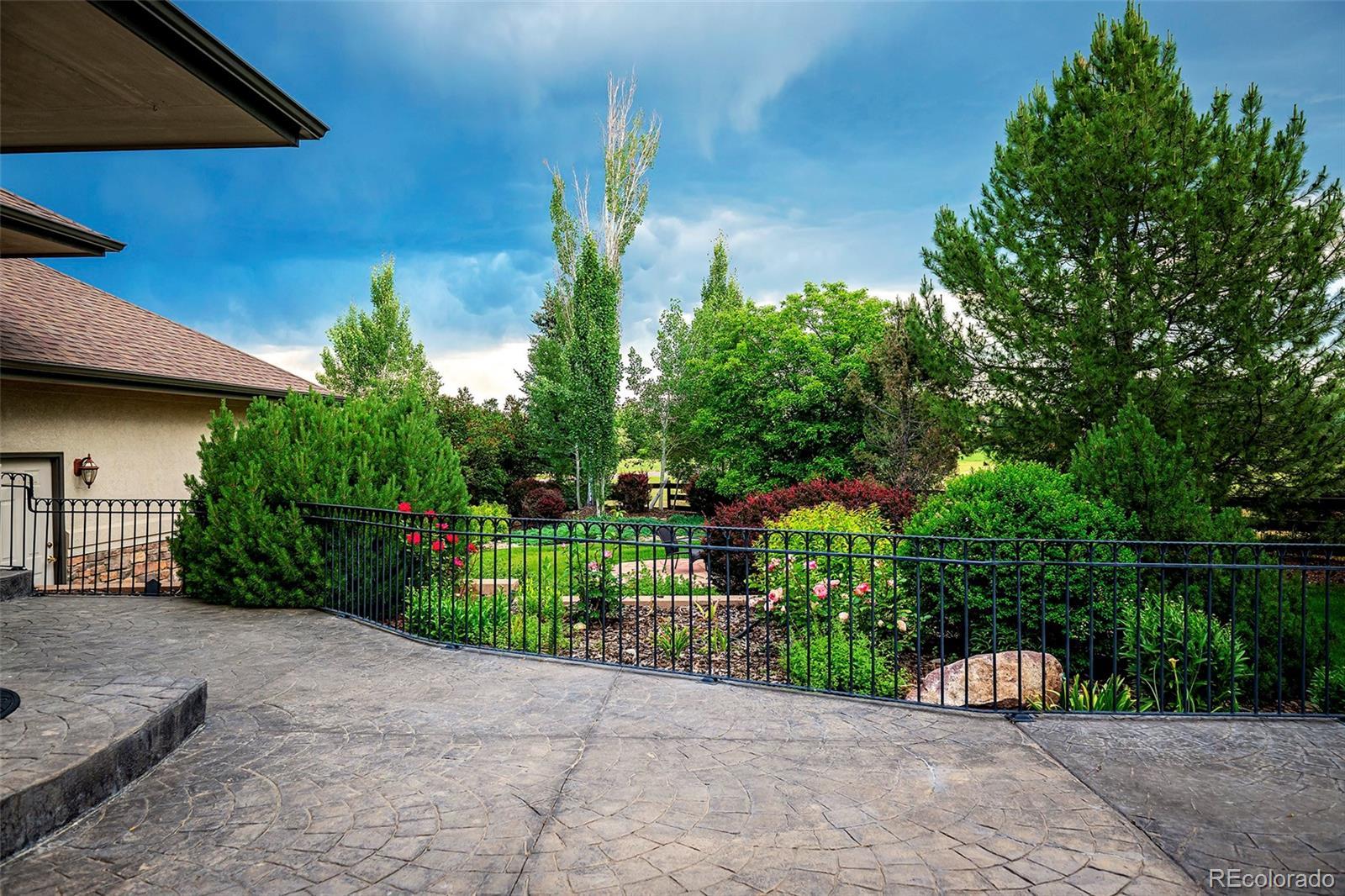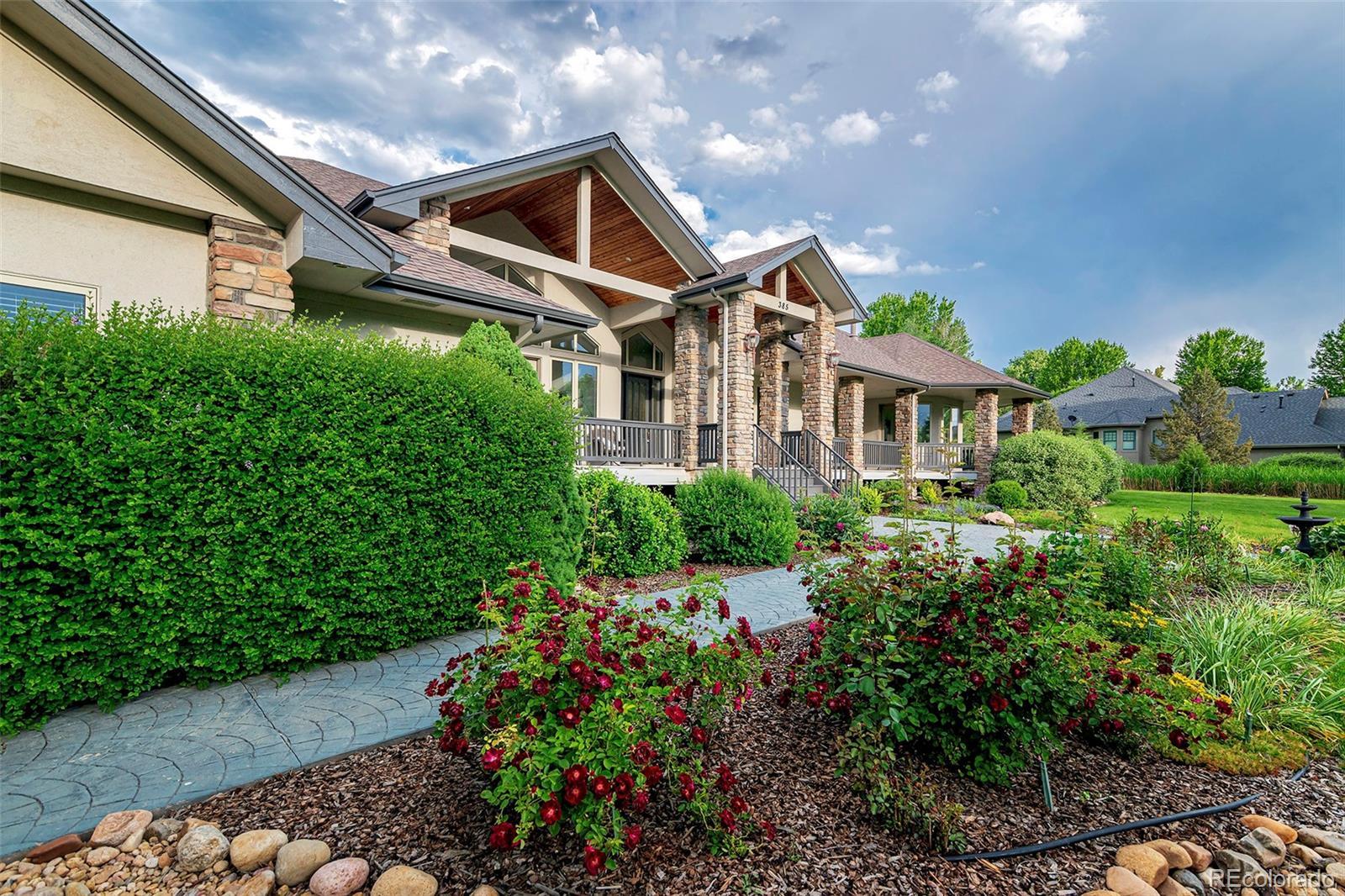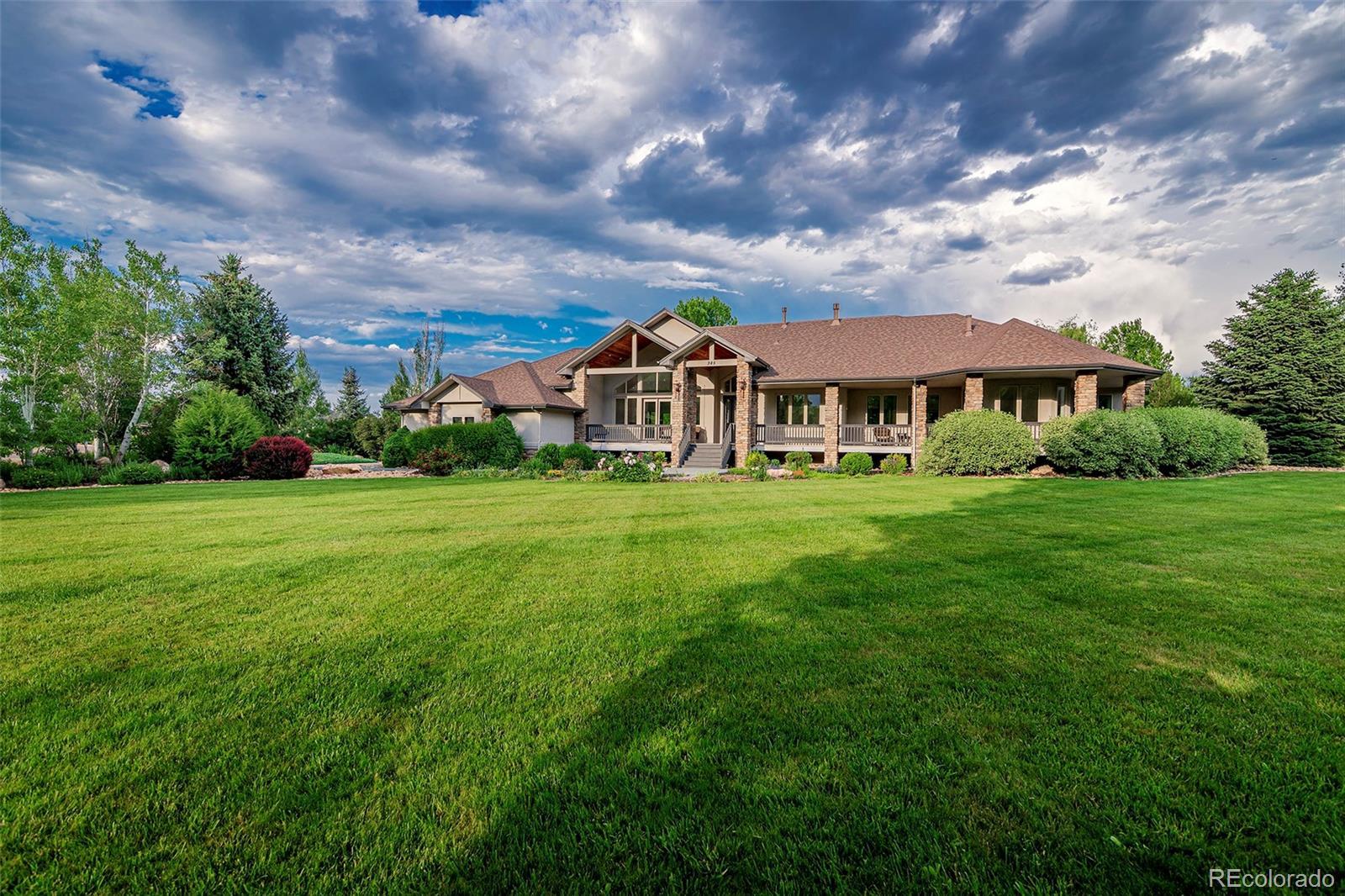 Welcome to your Boulder County dream estate nestled on over an acre of pristine land in an exclusive enclave of custom homes, where every moment feels like a cherished memory in the making. A sprawling front porch stretches across the entire facade, beckoning you to take a seat and soak in the breathtaking mountain views. A generous expanse of windows and soaring ceilings throughout amplify natural light, suffusing the carefully crafted open interior with an airy brilliance. The home effortlessly blends modern elegance with functional livability with an open concept ranch plan that encompasses everything you need on the main floor. Each generous room is carefully oriented to integrate the lush outdoor splendor into the interior living spaces. The chef’s kitchen with its sophisticated color palette is a testament in culinary refinement with soft white cabinets, a contrasting island, quartz counters, designer pendants and stainless appliances bringing a luxury that transcends time. The sun-drenched great room showcases a soaring 15ft vaulted ceiling and a stacked stone fireplace that adds a warm ambiance. Immerse yourself in the pinnacle of pampered living in the primary bedroom suite with a lavish bath carefully curated to elevate your daily routine and provide a sanctuary for well-being. Every desire for fun and entertainment finds fulfillment in the sprawling 3700 sqft finished basement. Discover the thrill of friendly competition within multiple game rooms, a vast rec room or the dedicated exercise area. Delight in cinematic experiences, gather around the warmth of the fireplace or unwind with your favorite reads in the intimate library. Lush greenery stretches as far as the eye can see in the meticulously manicured backyard where spirited games and the sounds of sizzling grills and crackling fires fill your summers. Colorful foliage and evergreens frame the perimeter providing a vibrant backdrop offering privacy without obstructing the wide open space views.