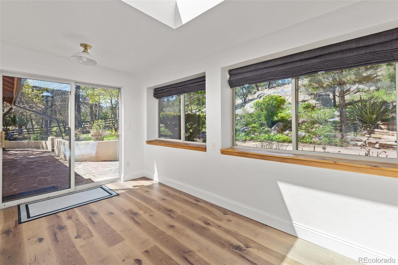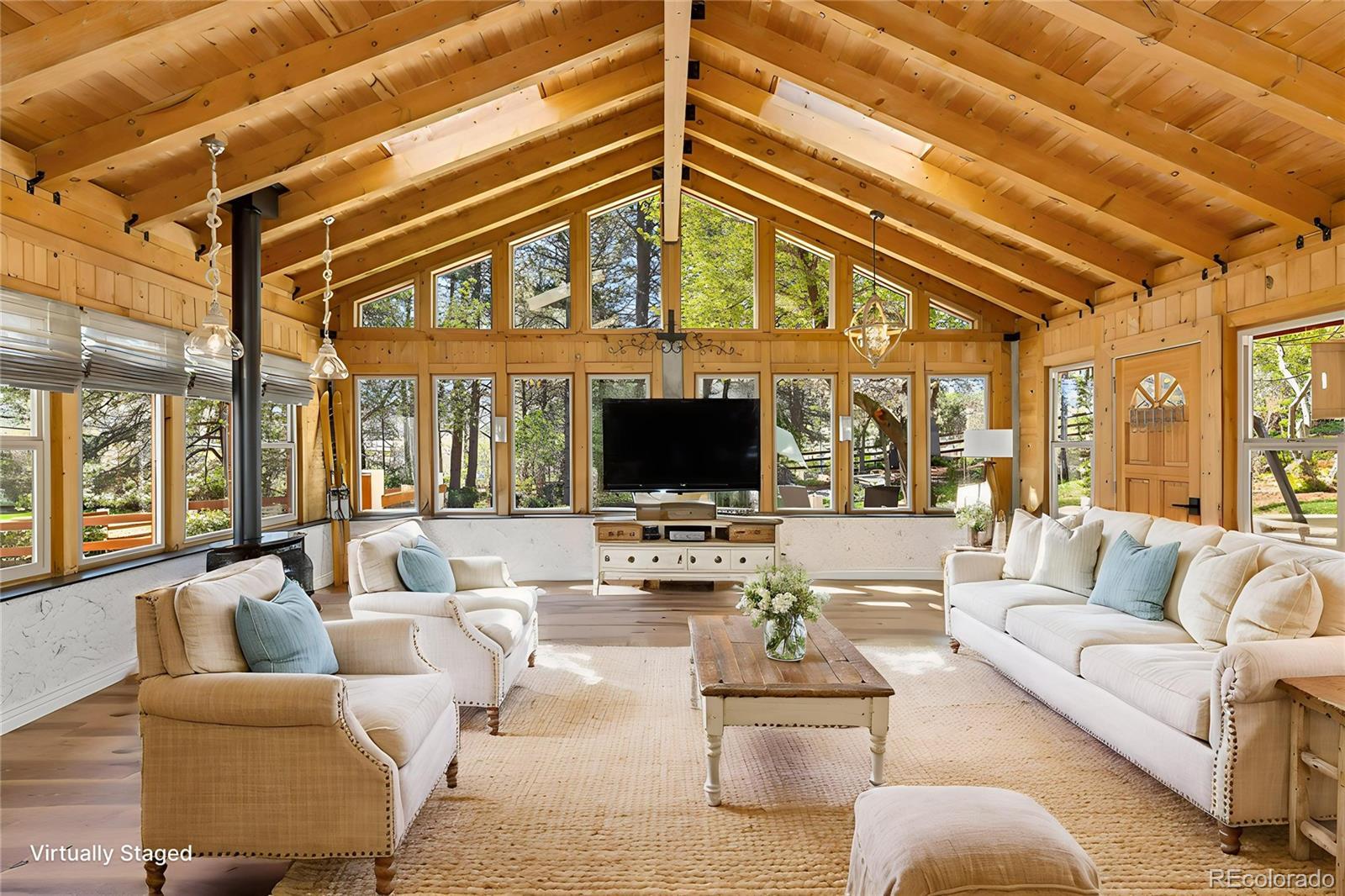 One mile outside of the quaint mountain town of Lyons, Colorado, on coveted Apple Valley Road, sits this beautiful secluded home. The backyard borders a 24-acre conservation easement for ultimate privacy. Nestled in the Napa Valley-like canyon in uncorporated Boulder County, this unique gem sits on nearly 3 acres with gorgeous natural granite outcroppings, Lyons sandstone, lodgepole pines, indigenous botannicals, fruit trees including: apples, pears, cherries, apricots, plums, chestnuts, mature lavender plants, & herbs woven throughout. The 9 sunlights bring the forest & mountain views into your space. The meditation trails throughout are stunning. The Frank LLoyd Wright-esque organic architecture of the home also features several recent remodels that include: a new boiler system, sunroom gas stove, Breckenridge granite counters, designer stainless steel appliances, quartz counters in all bathrooms, acacia & luxe vinyl floors throughout, new exterior stucco, windows, cistern pump, french drain, sprinkler system, and much more. Plenty of acreage to expand home, dry pasture/barn for horses, or a full garage. Use of the river in Lyons for swimming, fishing, or floating is permitted & leads to Laverne Johnson Park by duckie raft, kayak, or inner tube. House has 750 sq ft. special irrigation exterior permit, 2025 Septic Smart Pass, 1200 gal cistern, well (free water), low utility costs, and fire hydrant within 50ft. No HOA.