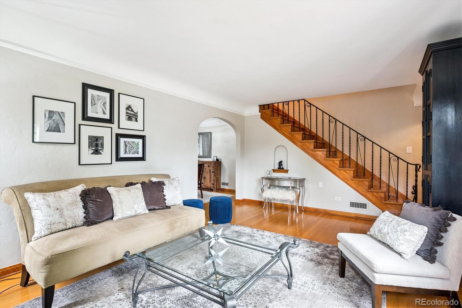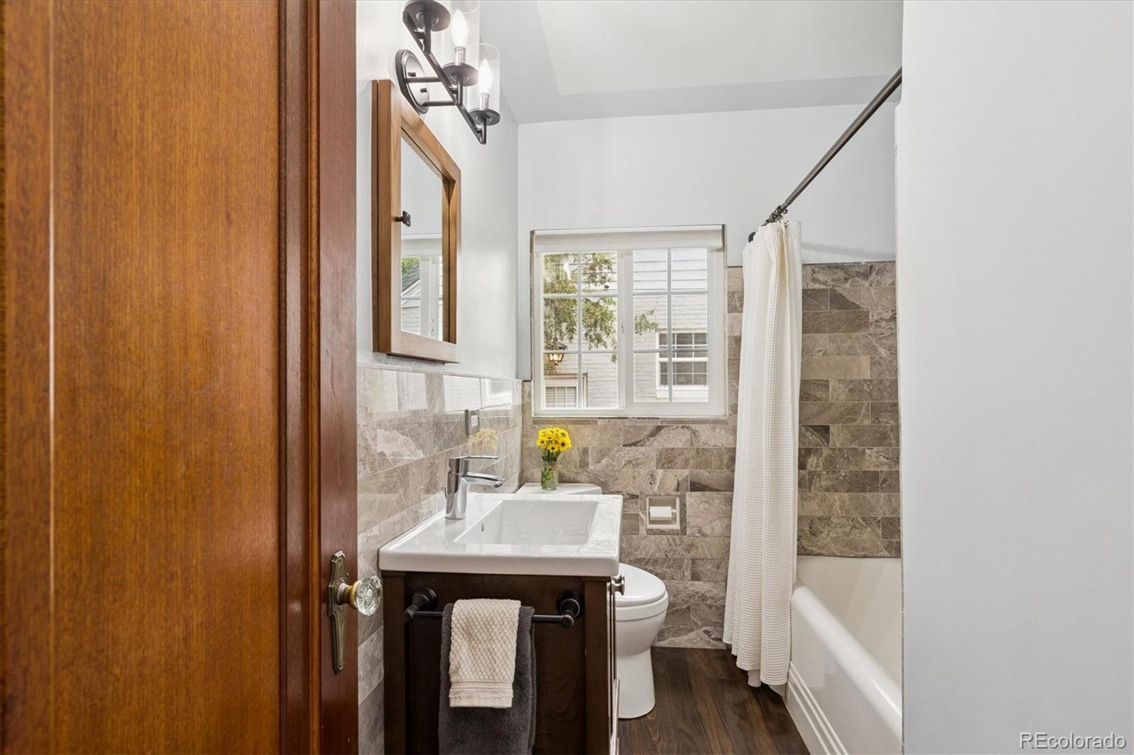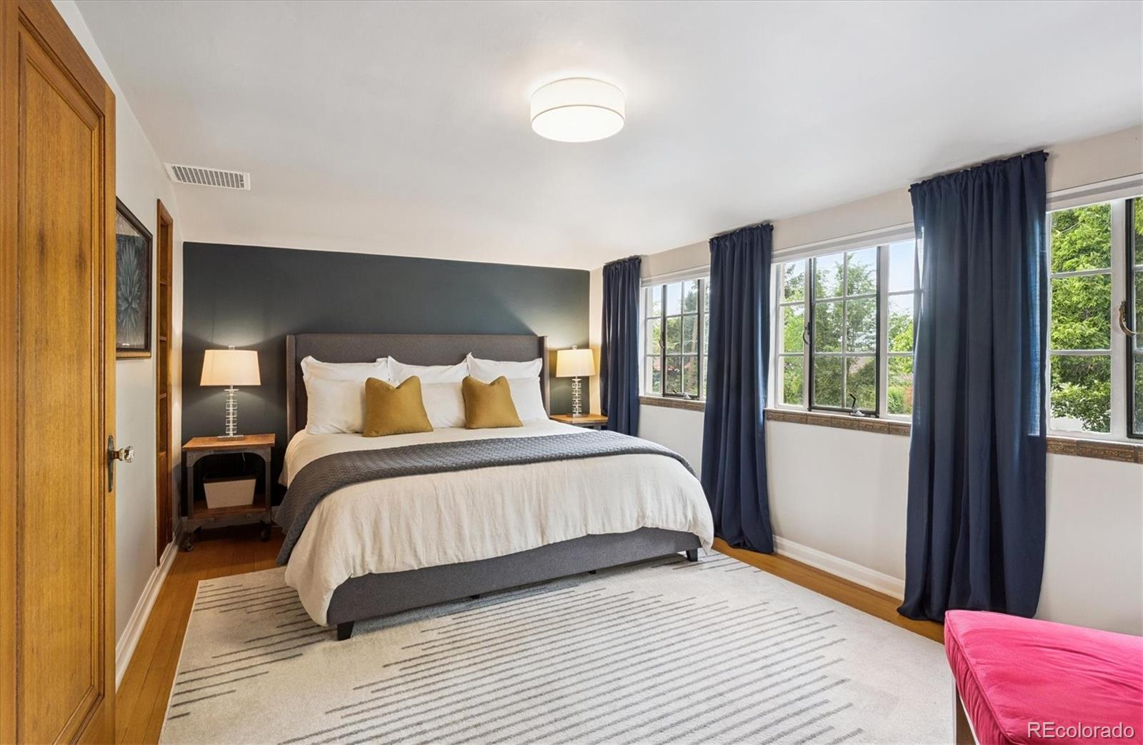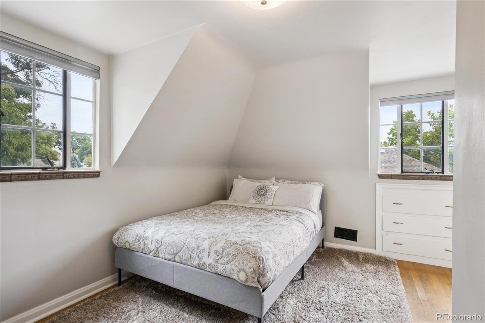 Storybook 2-story Tudor located in highly sought after Park Hill. This home has been meticulously renovated while carefully preserving original 1938 character which includes wood floors, Batchelder tiled windows sills, rod iron banister, wood doors with vintage hardware, arches and coved ceilings. The careful designed kitchen features white cabinets, stainless appliances, marble countertops and a sunny breakfast nook. The beautiful living room is filled with natural light and is great for entertaining with a cozy gas fireplace. Formal dining room features French doors that leads to the beautiful backyard with mature landscaping, garden areas and patios ideal for entertaining and Al Fresco dining. The second floor offers an elegant primary retreat with a sitting area, secondary bedroom, updated bath and a rare unfinished walk-in attic space perfect for a bedroom/ bath expansion or storage. Recently updated basement offers a lovely family with a built-in bar great for movie nights. Desired 2 car garage offers a bonus heated workshop. With easy access to City Park, the Denver Zoo, neighborhood shops, cafés, and restaurants, this home combines convenience with the timeless charm Park Hill is known for.