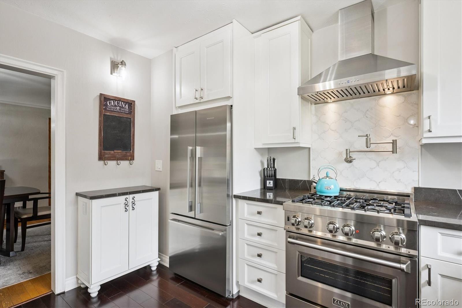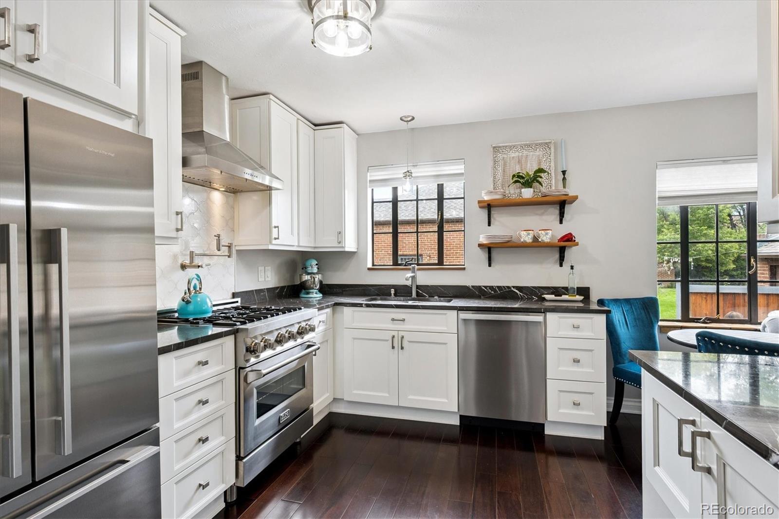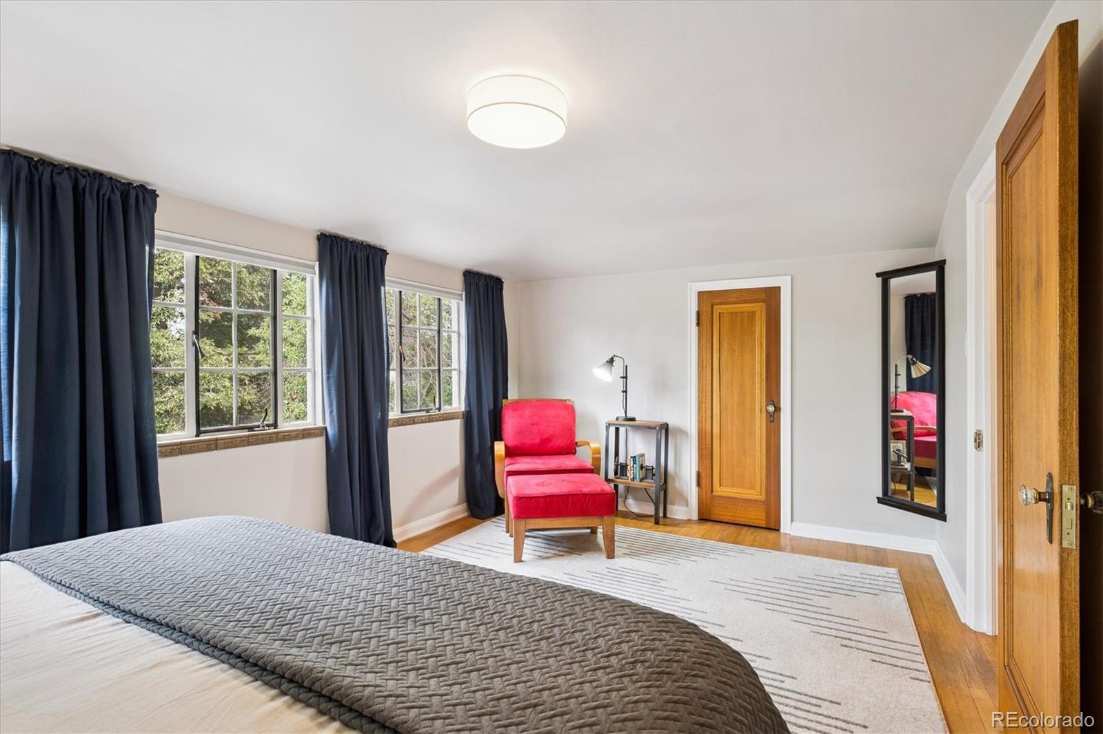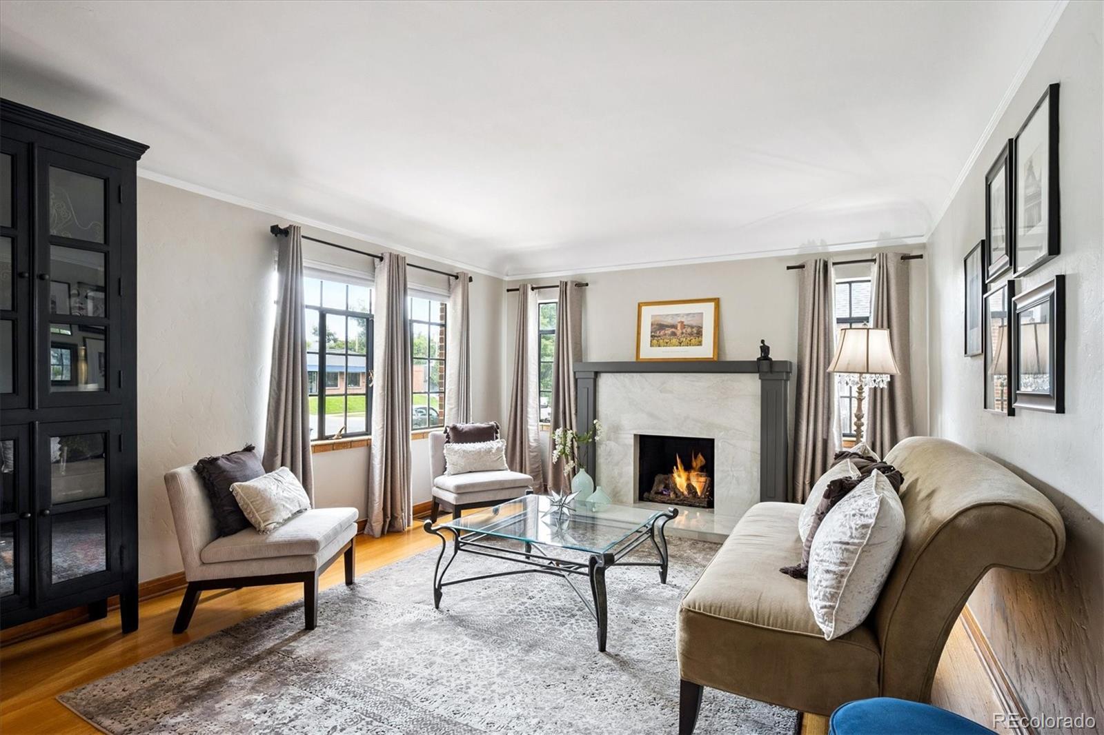 Storybook 2-story Tudor located in highly sought after Park Hill. This home has been meticulously renovated while carefully preserving original 1938 character which includes wood floors, Batchelder tiled windows sills, rod iron banister, wood doors with vintage hardware, arches and coved ceilings. The careful designed kitchen features white cabinets, stainless appliances, marble countertops and a sunny breakfast nook. The beautiful living room is filled with natural light and is great for entertaining with a cozy gas fireplace. Formal dining room features French doors that leads to the beautiful backyard with mature landscaping, garden areas and patios ideal for entertaining and Al Fresco dining. The second floor offers an elegant primary retreat with a sitting area, secondary bedroom, updated bath and a rare unfinished walk-in attic space perfect for a bedroom/ bath expansion or storage. Recently updated basement offers a lovely family with a built-in bar great for movie nights. Desired 2 car garage offers a bonus heated workshop. With easy access to City Park, the Denver Zoo, neighborhood shops, cafés, and restaurants, this home combines convenience with the timeless charm Park Hill is known for.