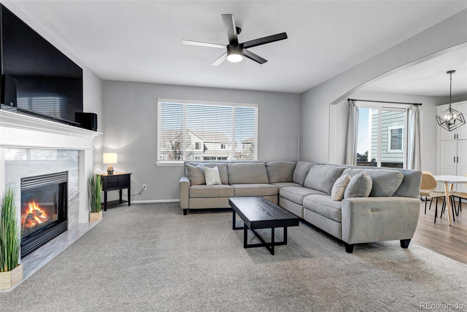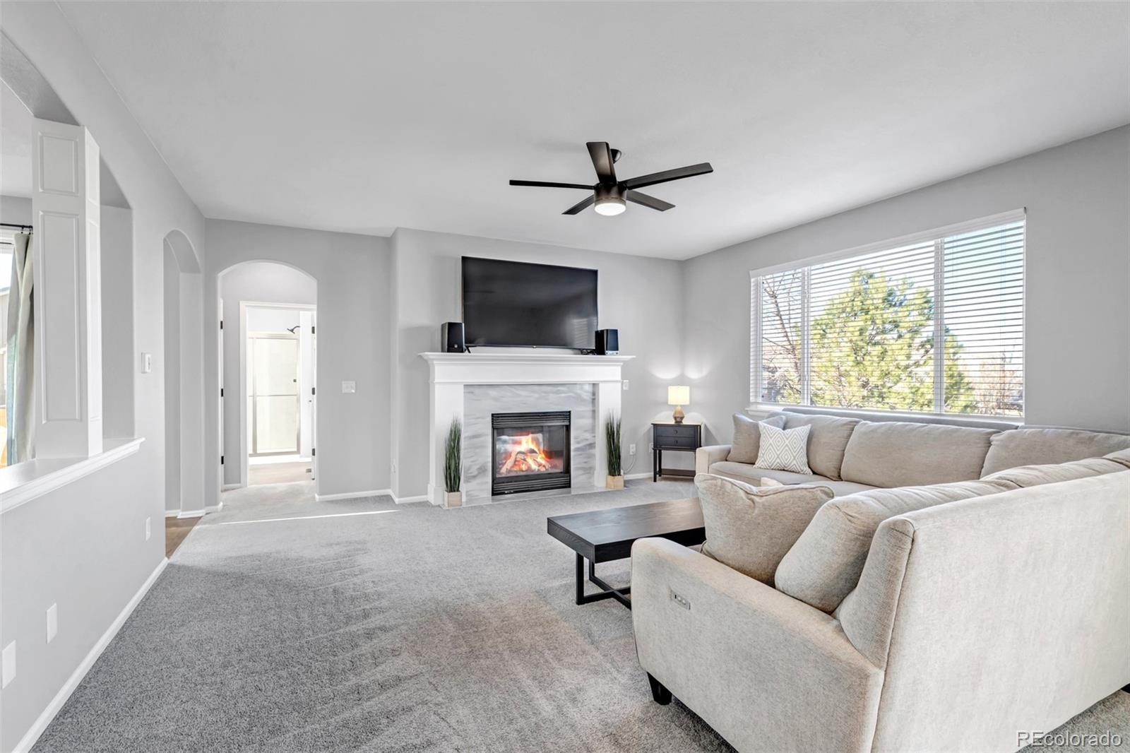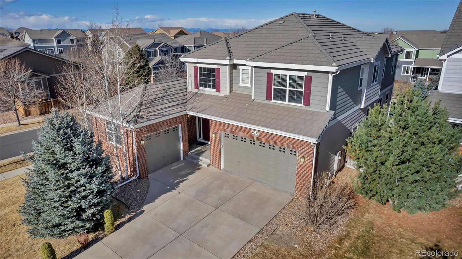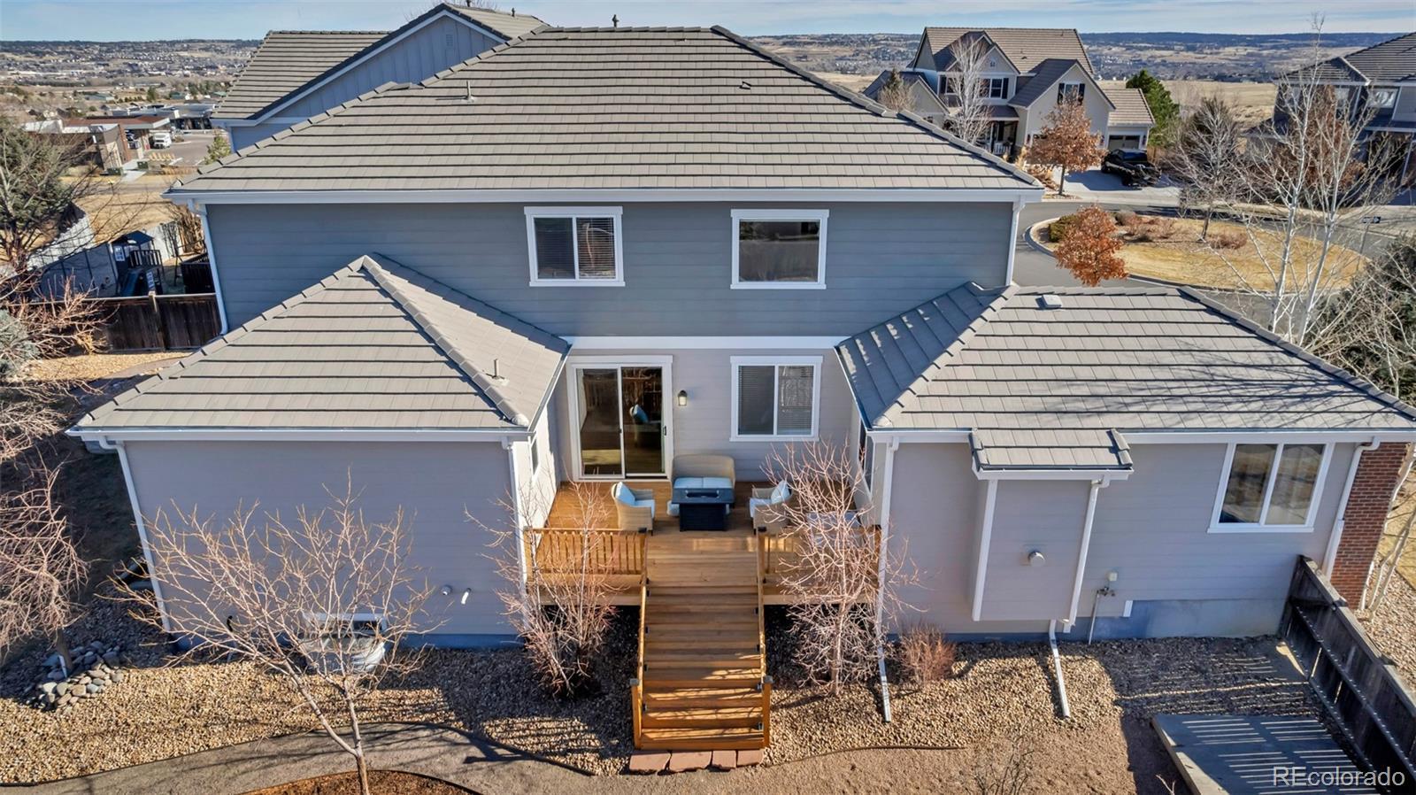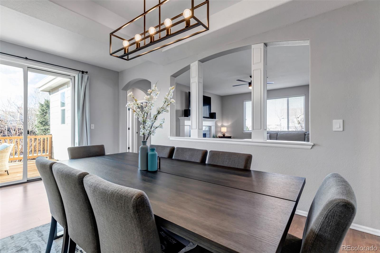 Prepare to fall in love with this impeccably updated 6-bed, 4.5-bath residence set on nearly a 1/4 acre in a peaceful cul-de-sac on a premium corner lot. Offering 4,344 sq ft of finished living space, this home showcases modern sophistication with nearly $100,000 in upgrades throughout. Pikes Peak views set the stage, while the south-facing driveway leads to a finished 2-car main garage and 1-car garage. The main garage is outfitted with polyaspartic flooring, water-resistant paint, and an EV charger for added functionality. Inside, sun-filled open-concept living with refinished hardwood floors (2023) and custom Marvin Infinity sliding doors (2023) seamlessly connects indoor and outdoor living. Entertain on the brand-new deck (2025) with accent lighting for unforgettable evenings, and enjoy the curved patio overlooking a lush, private backyard. The chef’s kitchen (2022) is a true showstopper featuring custom Italian quartz countertops, a premium Café induction cooktop, high-end appliances, and sleek modern finishes. Spa-inspired bathrooms (2022–2024) elevate daily living with Italian marble, designer paint, contemporary hardware, and statement lighting. Every detail has been curated for modern comfort, including updated fans, chandeliers, and smart-home features such as auto-dimmable lighting, smart thermostats, and exterior security enhancements (2022–2025). The professionally finished basement offers a recreation area, wet bar, and custom home theater. A durable concrete tile roof completes this exceptional property. Ideally located within walking distance to Gold Rush Elementary, parks and trails and just minutes from downtown Parker, shopping, dining, and major highways. This is elevated Parker living—where space, luxury, views, and smart design converge in a highly sought-after family-friendly community. Opportunities like this are rare—experience it in person and schedule your private showing before it’s gone.