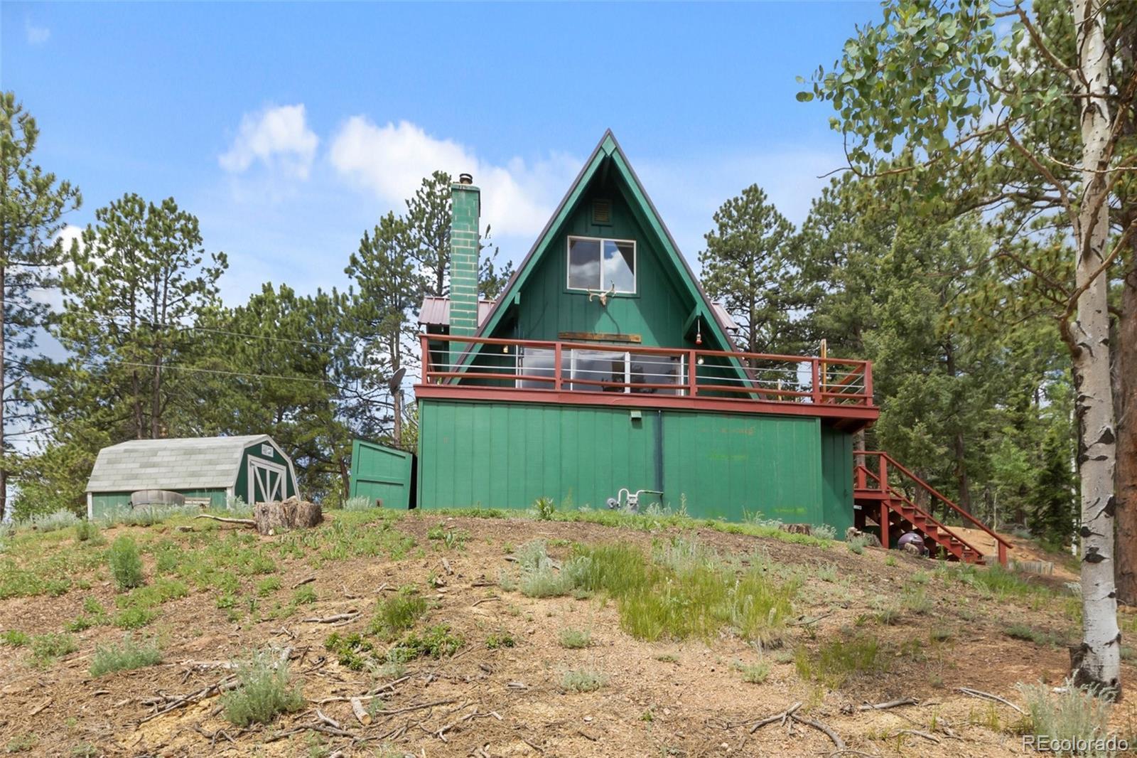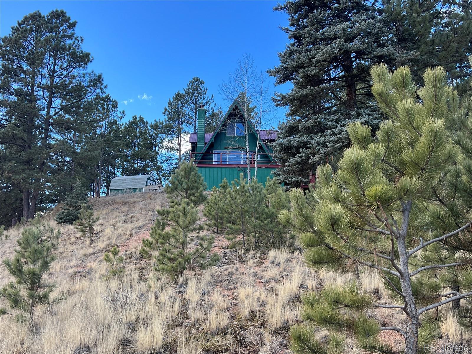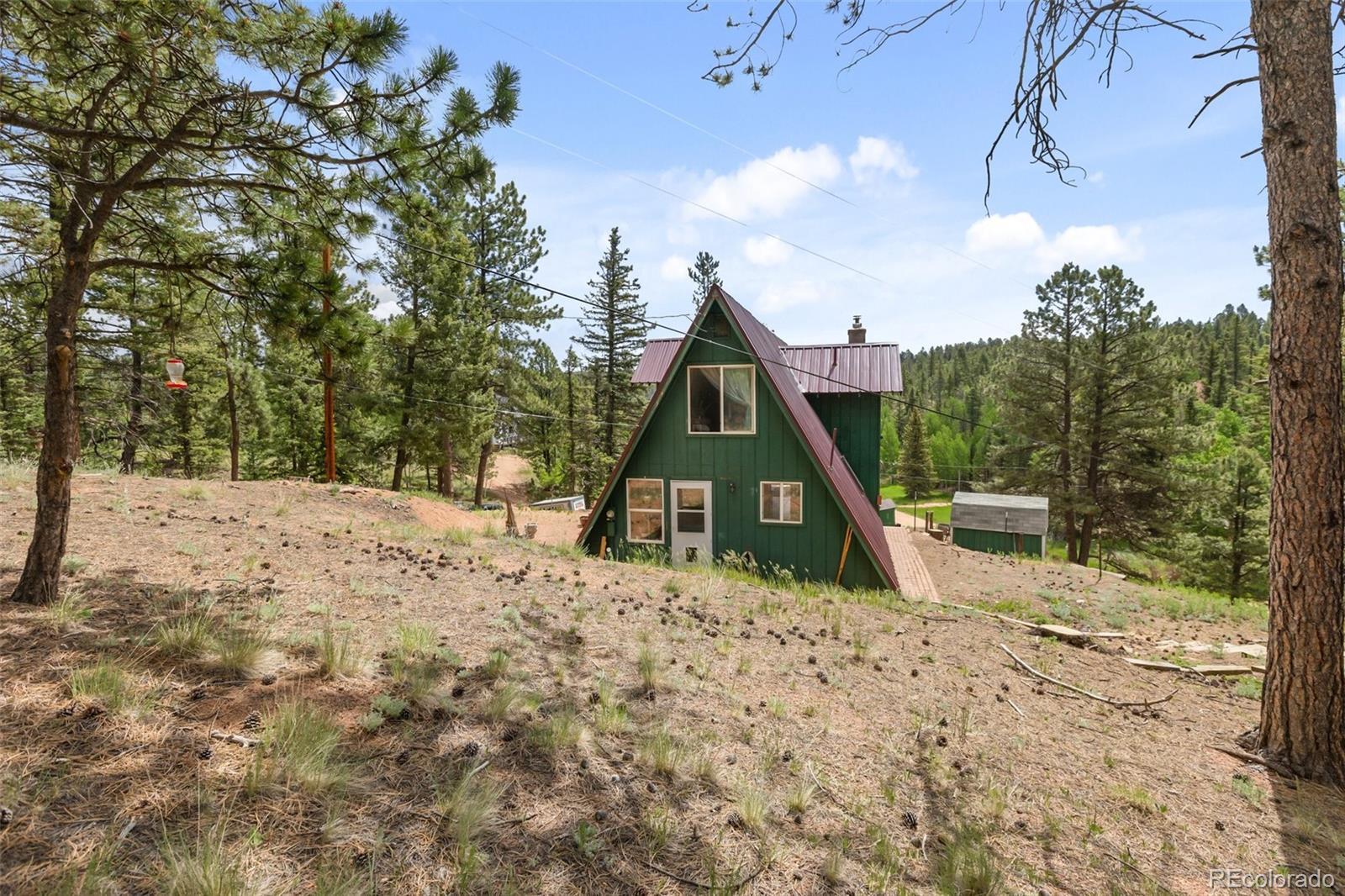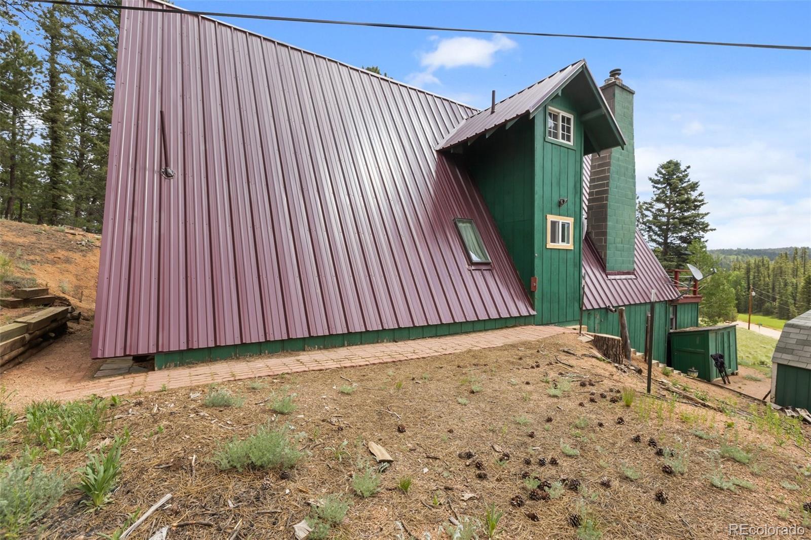 Well kept A Frame on 2 wooded acres located in Beautiful Spring Valley! Featuring 3 bedrooms and two newly remodeled sharp bathrooms that also include new plumbing! Attractive local milled hardwood is in the living room which features an expansive glass wall that takes in the beautiful wooded views. The living room has a sliding glass door that walks out to an expansive deck to enjoy the abundant wildlife from. There is also a wood burning fireplace to keep things cozy on those Colorado winter nights. Brand new class four metal roof that was just installed in 2025! Eat in kitchen has a dining area that also walks out to the private back yard. The lot was just professionally mitigated in 2024, helping with the homeowners insurance. Most properties in this subdivision have one acre, this property has two acres to enjoy life on! Walking distance to the gorgeous subdivision's Burgess Lake which provides stunning Pikes Peak Views! Located close to the National Forest which offers endless hiking, dirt biking and four wheeling. Spring Valley has 3 ponds and a gorgeous stocked lake. HOA Members can boat, fish, kayak, fish and ice fish. There is a club house that HOA members can use for family get togethers, parties, weddings, etc. Its a special place to live, rural , yet only 10 minutes from amenities and only 20 minutes from Woodland Park. Skiing is less than 2 hours away, along with many fishing/boating lakes and the famous Dream Stream. If you want mountain living in a well kept beautiful area, this is the place to be. This would make a great home, second home or long or short term rental. The septic has been cleaned and inspected. The deck and stairs have been recently painted.