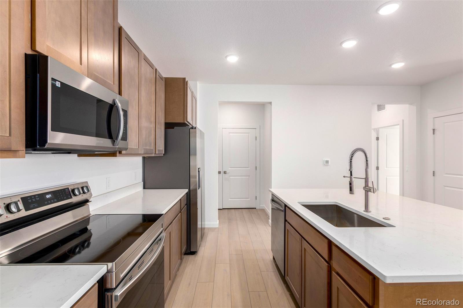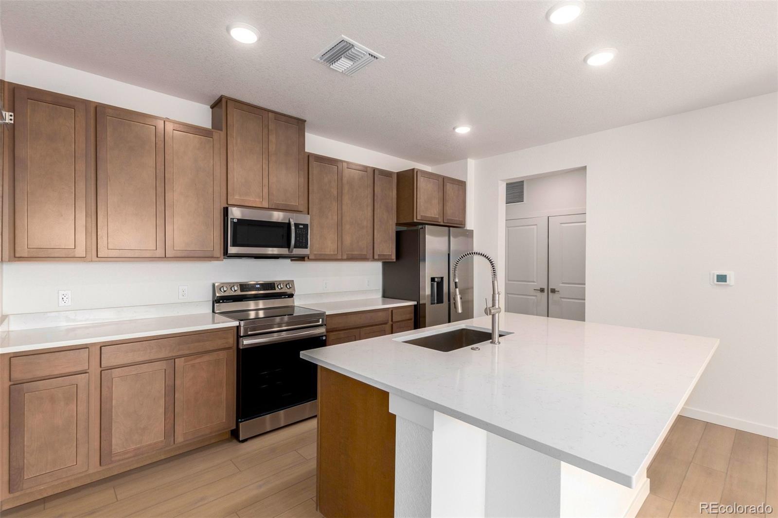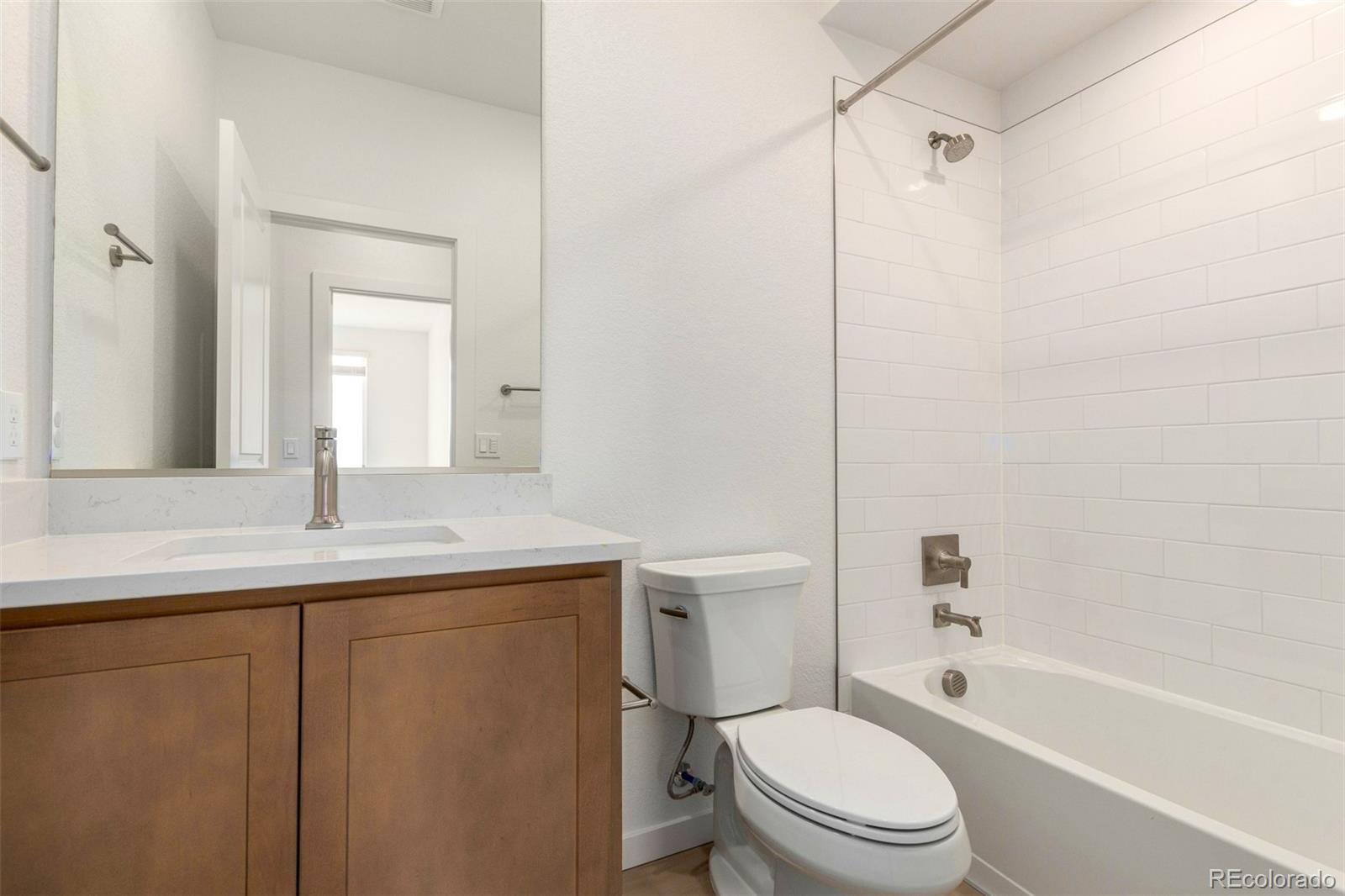 READY TODAY - BRAND NEW CONDO faces south for wonderful light! This light and bright unit features our sleek and modern Colorado Complete package including beautiful quartz countertops, neutral wood soft-close cabinets, stainless steel appliances (including refrigerator), full sized front-loading washer and dryer, and high quality LVP flooring throughout. Large kitchen island seats 4-5 and features oversized stainless steel sink and semi-professional Kohler faucet. Brushed nickel hardware and fixtures add to the contemporary feel. Oversized subway tile in both baths and dual lighted mirrors in the spacious primary bath. This unit is move-in ready including blinds, air conditioning, Navien tankless water hearter, Kwikset Smartcode deadbolt and more. Easy access to E-470, I-70 and DIA. Take advantage of the great financing incentives available through our affiliated lender! Visit www.lokalhomes.com for more information. Photos are an example, not the actual unit. Buyer shall be responsible for verifying property taxes as there is currently no available tax information for the units at the assessor's website.