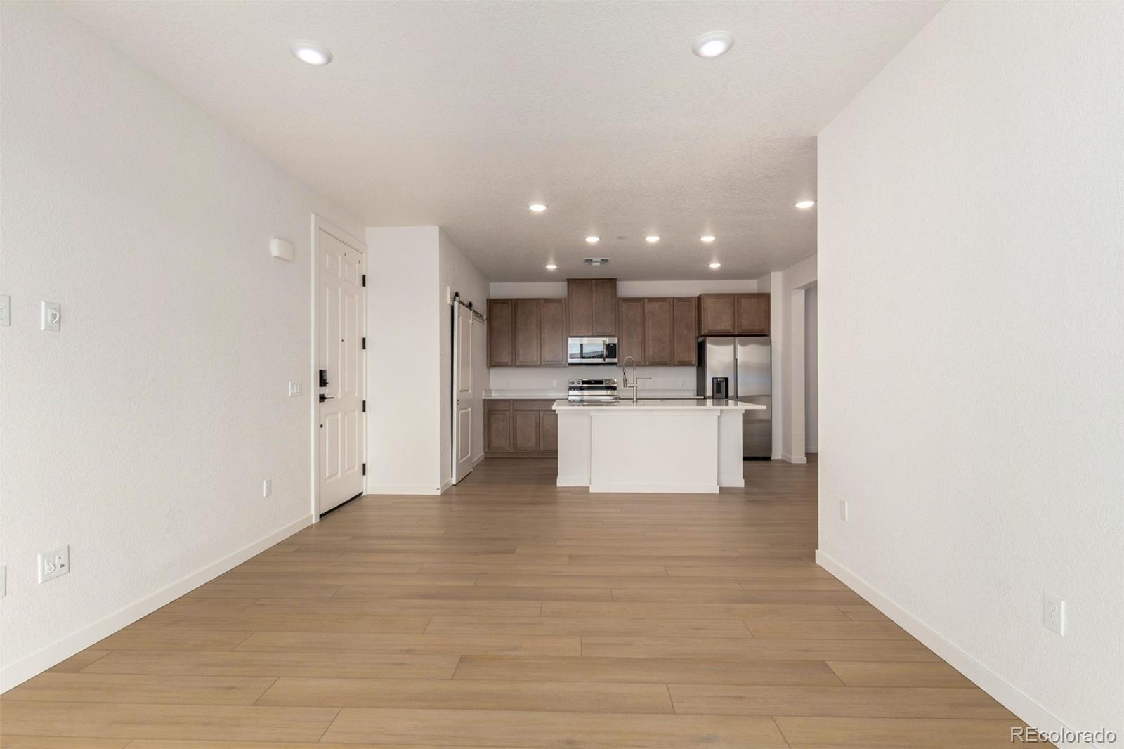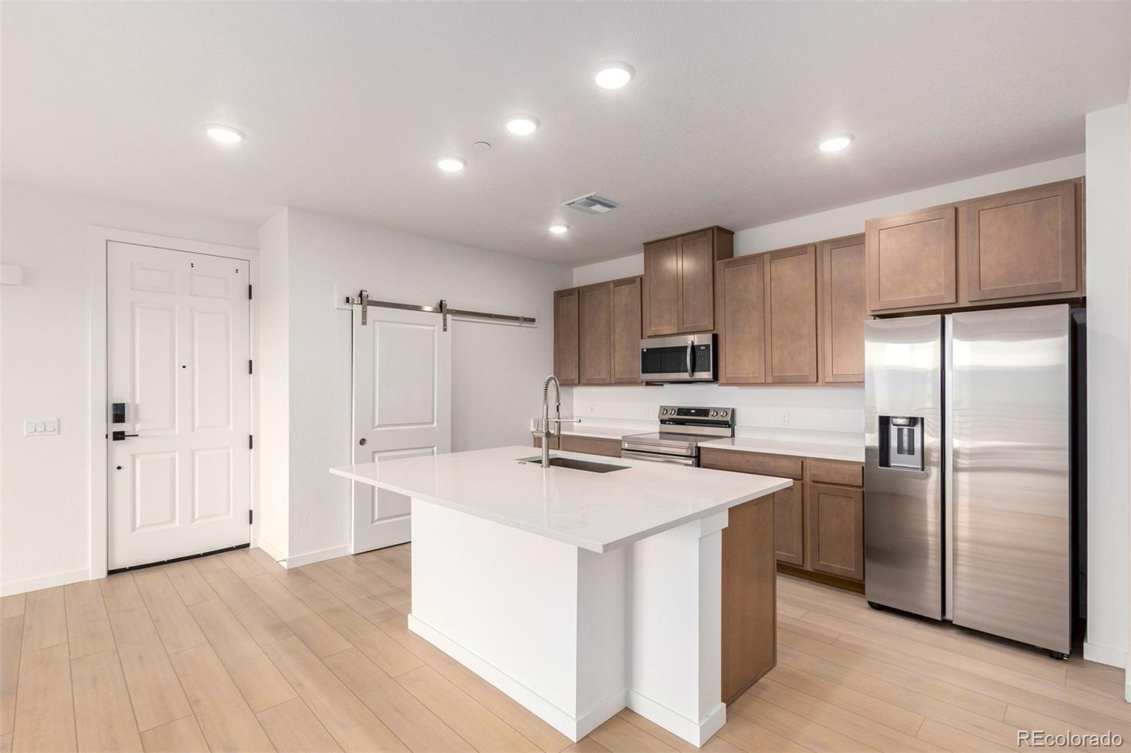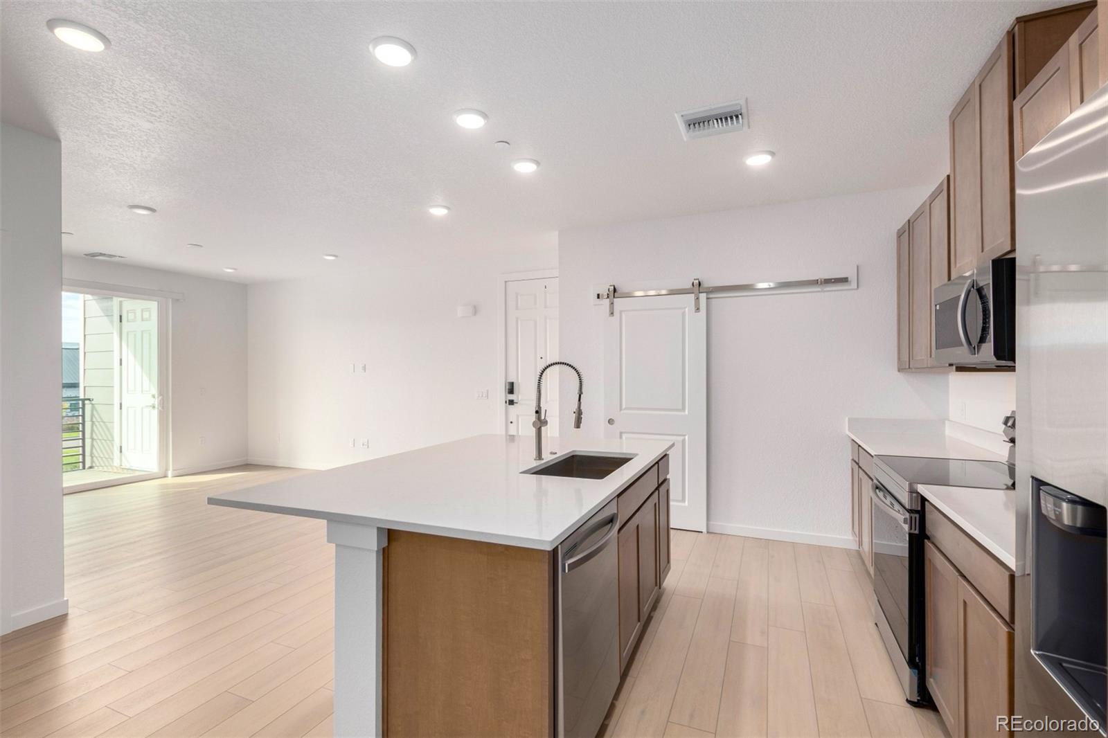 READY TODAY - BRAND NEW CONDO faces south for wonderful light! This light and bright unit features our sleek and modern Colorado Complete package including beautiful quartz countertops, neutral wood soft-close cabinets, stainless steel appliances (including refrigerator), full sized front-loading washer and dryer, and high quality LVP flooring throughout. Large kitchen island seats 4-5 and features oversized stainless steel sink and semi-professional Kohler faucet. Brushed nickel hardware and fixtures add to the contemporary feel. Oversized subway tile in both baths and dual lighted mirrors in the spacious primary bath. This unit is move-in ready including blinds, air conditioning, Navien tankless water hearter, Kwikset Smartcode deadbolt and more. Easy access to E-470, I-70 and DIA. Take advantage of the great financing incentives available through our affiliated lender! Visit www.lokalhomes.com for more information. Photos are an example, not the actual unit. Buyer shall be responsible for verifying property taxes as there is currently no available tax information for the units at the assessor's website.
