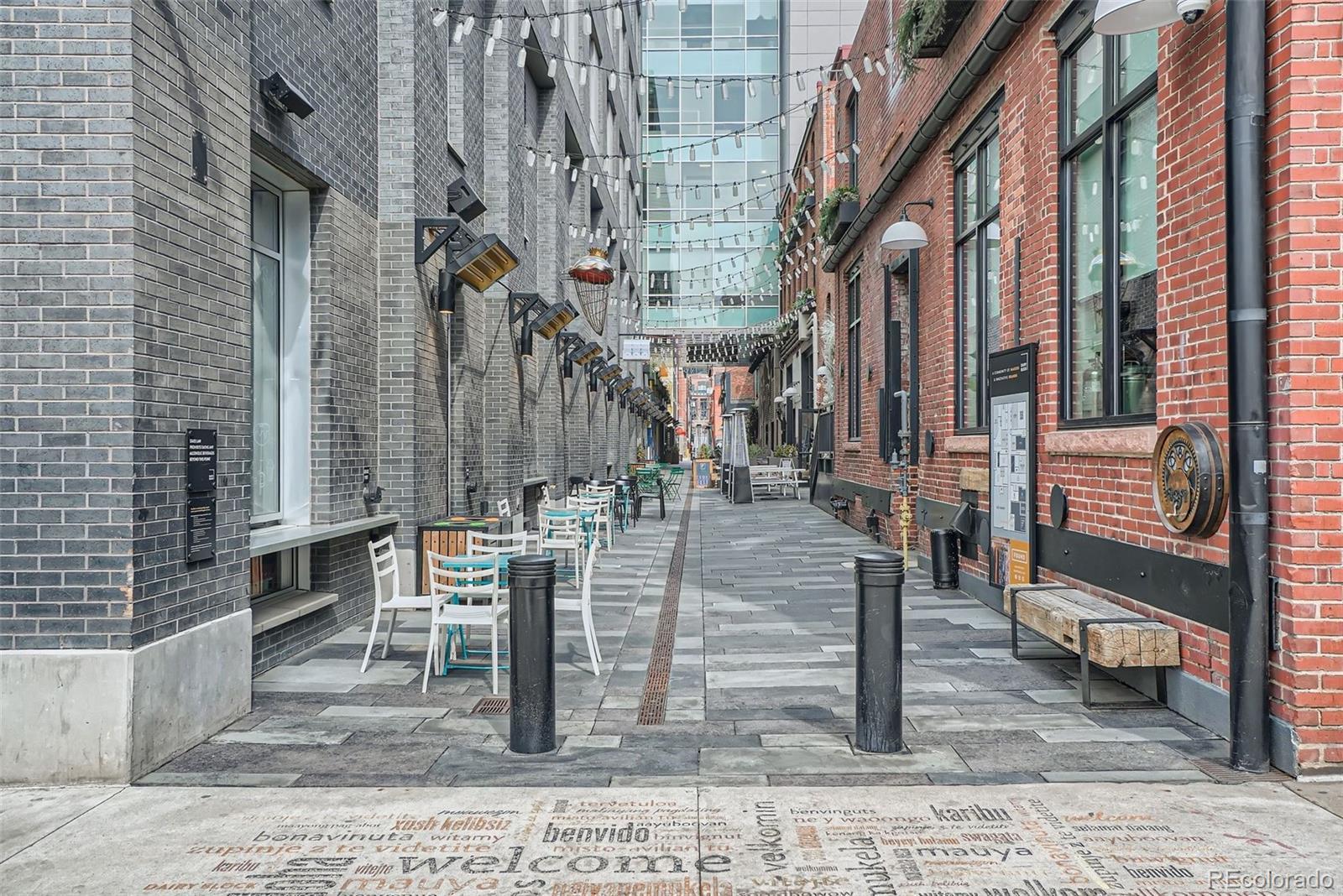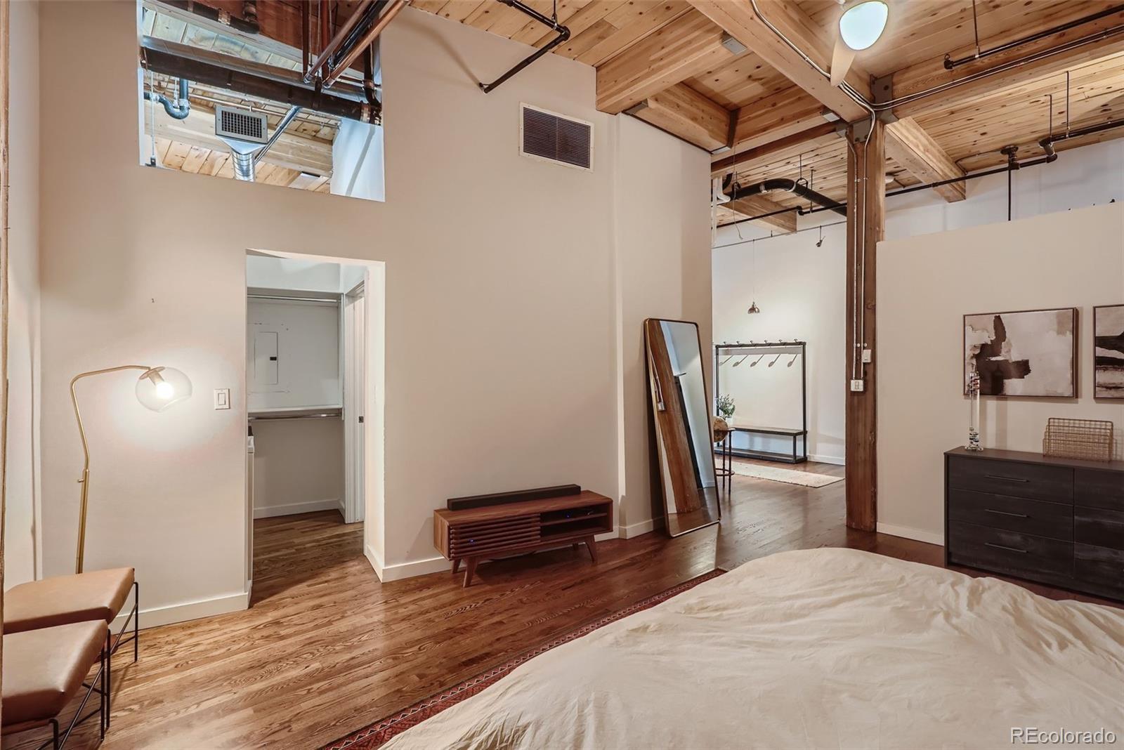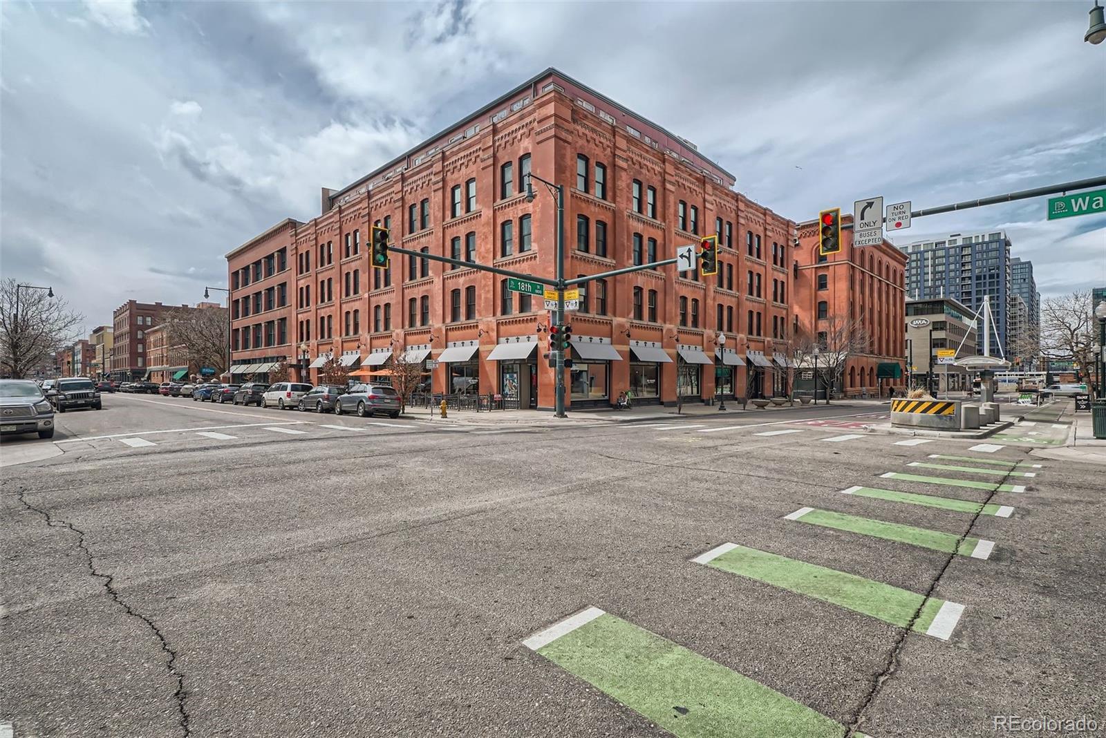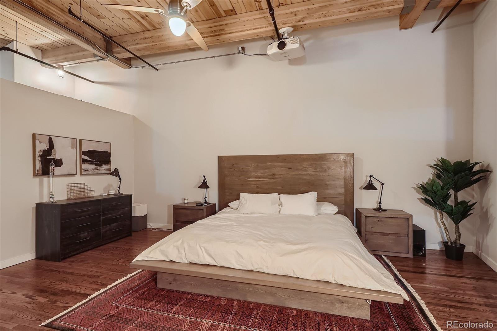 Discover this remarkable LoDo loft with high ceilings and exposed timber beams, situated in downtown. This one-bedroom, two-bathroom loft is truly impressive, featuring an open concept layout, a fully updated kitchen with stainless steel appliances, and a large dining area that also makes an ideal workspace or creative studio. The oversized bedroom accommodates a king-sized bed and even has a projection screen for cozy movie nights. The ensuite bathroom and walk-in closet are cleverly designed with dual sinks, a walk-in shower, and an in-unit washer and dryer, providing ample storage space. Visitors can take advantage of the built-in Murphy Bed located in the entryway/living room. Smart technology is integrated into the loft with a state-of-the-art lighting system and automated blackout shades. The energy efficiency of the unit is enhanced by the new custom black windows. This beautiful home is an absolute must-see for anyone seeking an urban living experience. It is conveniently located just a stone's throw from Coors Field and the new Dairy Block, as well as within walking distance to the light rail and Union Station, where you can catch a train to the airport. Ball Arena is just a short walk away, or you can take advantage of the free 16th Street MallRide. The surrounding neighborhoods of LoDo, Union Station, Riverfront Park, and downtown Denver offer a wealth of dining and entertainment options to explore. Finally, the unit comes with one covered parking space and a large storage unit.
