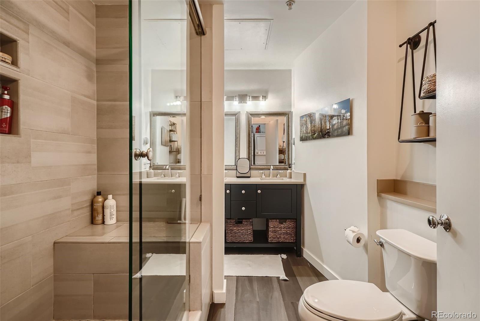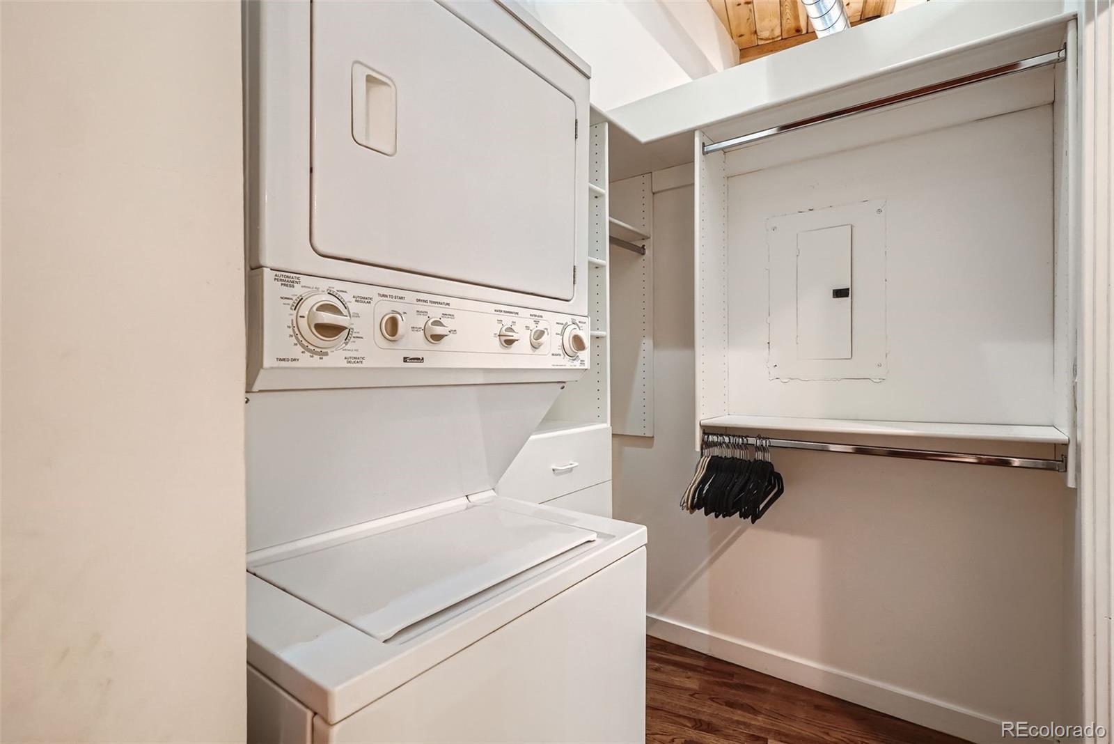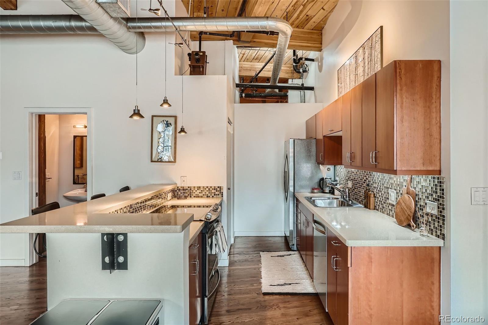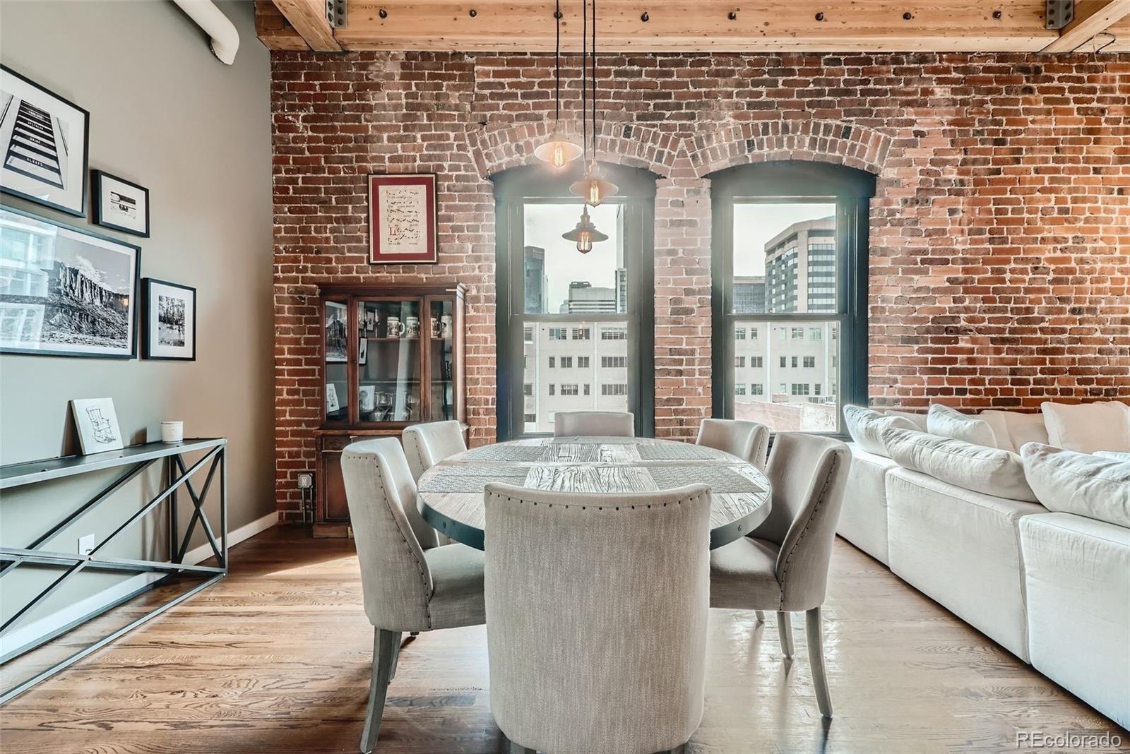 Discover this remarkable LoDo loft with high ceilings and exposed timber beams, situated in downtown. This one-bedroom, two-bathroom loft is truly impressive, featuring an open concept layout, a fully updated kitchen with stainless steel appliances, and a large dining area that also makes an ideal workspace or creative studio. The oversized bedroom accommodates a king-sized bed and even has a projection screen for cozy movie nights. The ensuite bathroom and walk-in closet are cleverly designed with dual sinks, a walk-in shower, and an in-unit washer and dryer, providing ample storage space. Visitors can take advantage of the built-in Murphy Bed located in the entryway/living room. Smart technology is integrated into the loft with a state-of-the-art lighting system and automated blackout shades. The energy efficiency of the unit is enhanced by the new custom black windows. This beautiful home is an absolute must-see for anyone seeking an urban living experience. It is conveniently located just a stone's throw from Coors Field and the new Dairy Block, as well as within walking distance to the light rail and Union Station, where you can catch a train to the airport. Ball Arena is just a short walk away, or you can take advantage of the free 16th Street MallRide. The surrounding neighborhoods of LoDo, Union Station, Riverfront Park, and downtown Denver offer a wealth of dining and entertainment options to explore. Finally, the unit comes with one covered parking space and a large storage unit.