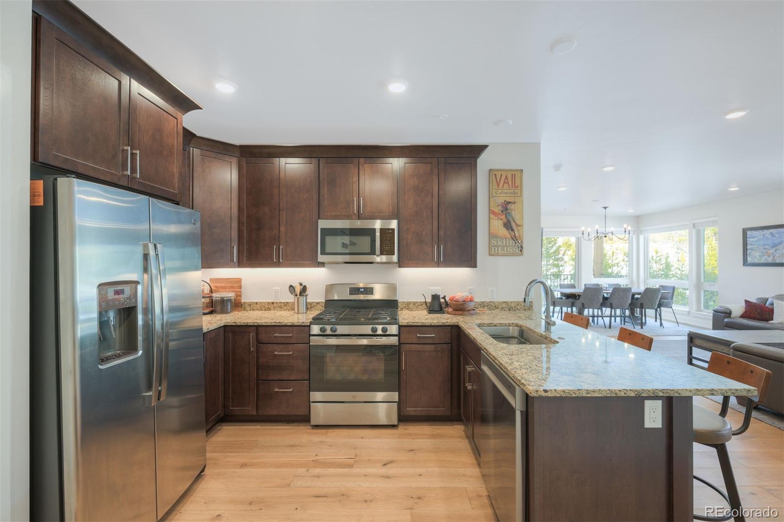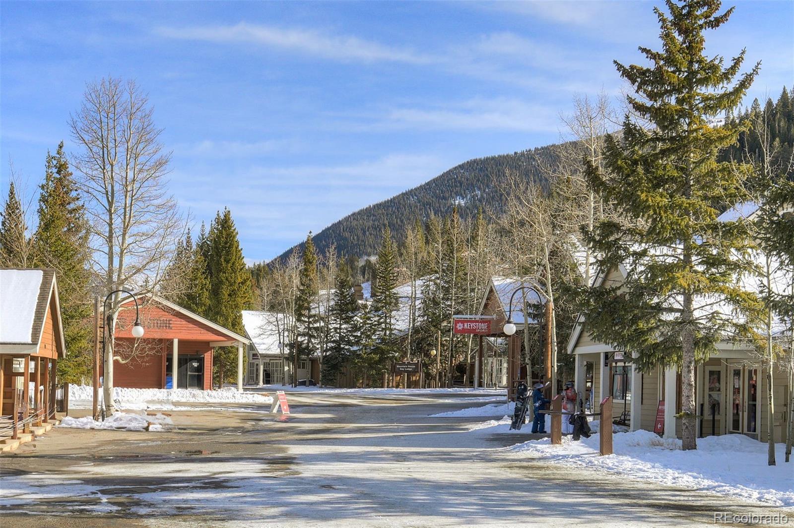 Step into this impressive corner two-bedroom condo in Keystone and be greeted by sweeping mountain and sunrise views. The oversized deck invites morning coffee with the mountains as your backdrop or evening sunsets shared with friends and family. Inside, sunlight fills the living and dining area, anchored by a cozy gas fireplace, while the kitchen features granite countertops, stainless steel appliances, and a breakfast bar that’s perfect for casual meals or entertaining. Both bedrooms offer private ensuite bathrooms, creating a true sense of retreat and privacy. Thoughtful touches include a mudroom area with a built-in bench and hooks, an in-unit full-size stackable washer and dryer, and an organized layout designed for comfort and convenience. The heated garage includes a 5.5’ x 10’ private storage space, plus additional outdoor parking and electric vehicle charging. Located in the vibrant Lakeside Village area, the condo is just steps from the Snake River and Keystone Lake, where ice skating, water sports, and riverside strolls are at your doorstep, and biking or shuttle access to Mountain House or River Run is effortless. Residents enjoy elevator access, ski locker storage, and two inviting hot tubs, all set within a development that captures panoramic mountain, wetland, ski slope, and river views. The sunny location across from the Conference Center ensures convenience while the surrounding natural beauty delivers serenity, making this home a rare opportunity to experience the best of Keystone living.