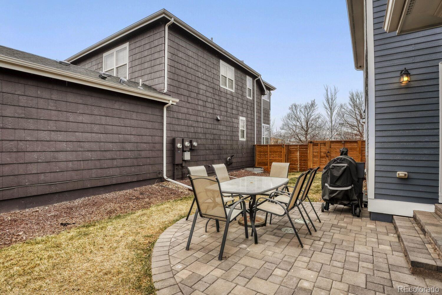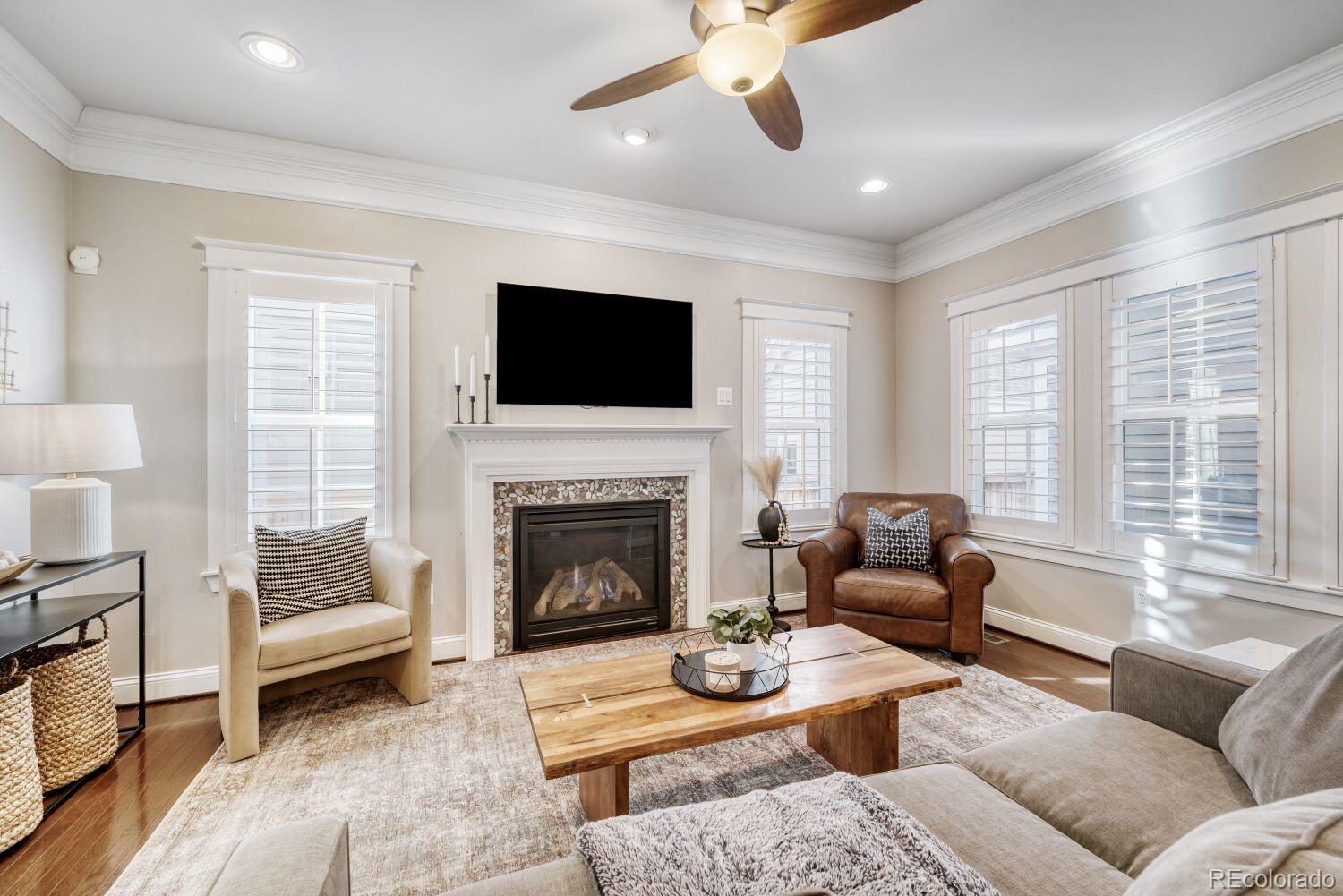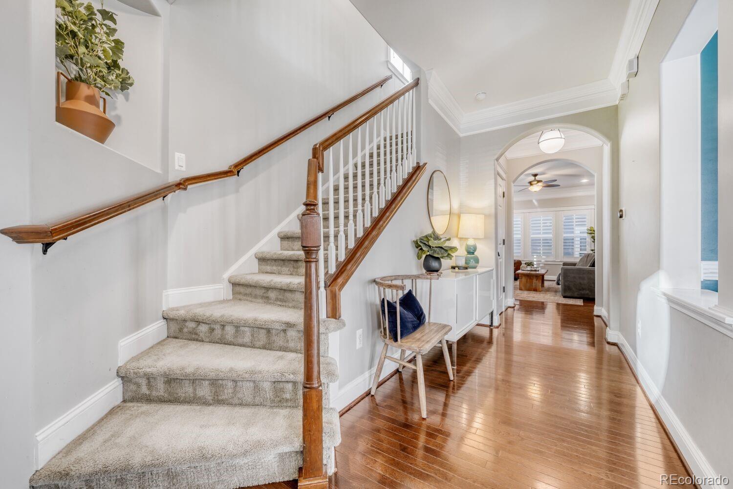 Experience refined comfort in this beautifully appointed Parkwood home in Central Park. Thoughtful upgrades shine throughout, including crown molding, hardwood floors, and louvered shutters. Professionally landscaped grounds lead to a welcoming front porch and foyer, opening to a home office and an inviting living room with a cozy gas fireplace. The seamless layout flows into the dining area and eat-in kitchen, featuring granite countertops, stainless steel appliances, and abundant cabinetry. A functional mudroom provides gear storage beside convenient powder bath. Outside, find a spacious backyard perfect for gatherings and outdoor dining on the patio, as well as an oversized EV compatible detached two-car garage with alley access and dog run. Upstairs, natural light fills the landing and guides you to a spacious primary suite with a five-piece bath, marble countertop and an oversized shower. Two additional bedrooms with generous closets, a full bath, and a convenient laundry closet complete the upper level. The recently remodeled basement offers exceptional versatility with a stylish wet bar, entertainment/study/gym area, conforming bedroom, bath with walk-in shower, and ample storage. Enjoy the peace of mind of a new roof (2025), and new exterior paint (2026), and smart Rachio sprinkler. Ideally located near Stanley Marketplace, Westerly Creek, Central Park Greenway, Central Park Town Center, Eastbridge and highly rated neighborhood schools.