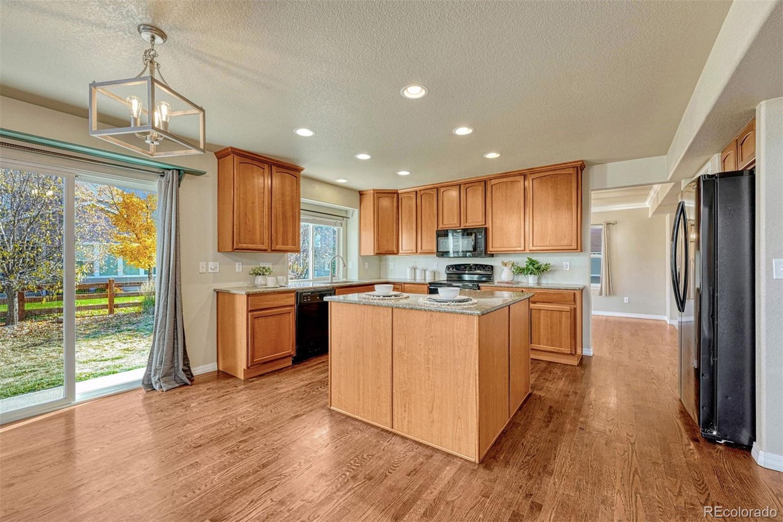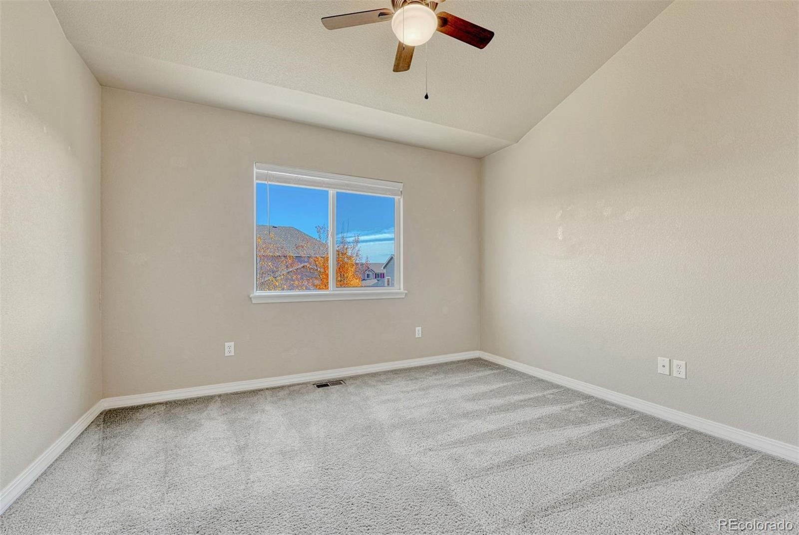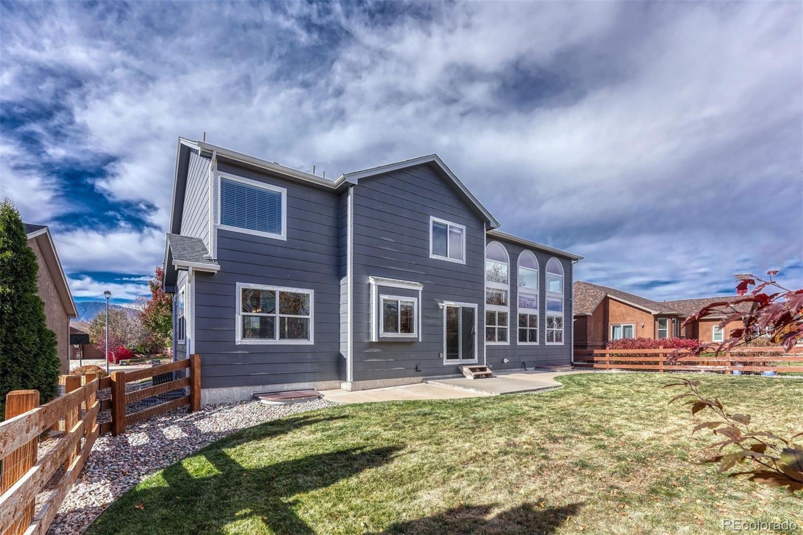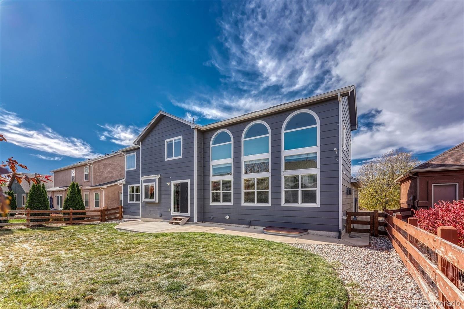 Discover this beautifully maintained two-story Classic-built home on a spacious fenced lot in desirable Barnstormers Landing. Ideally located near shopping, dining, and major employers—including Fort Carson, Peterson and Schriever Space Force Bases, Amazon, and the airport—this home offers both comfort and convenience. With easy access to I-25, downtown and all corners of the city are just minutes away. Step inside to an inviting two-story entry with grand ceilings and an elegant staircase. The open, light-filled layout flows effortlessly between the living and dining rooms, featuring hardwood floors, crown molding, and neutral paint tones throughout. The kitchen is a true centerpiece with granite countertops, ceiling-height cabinetry, and a window overlooking the backyard, seamlessly connecting to the dining and family spaces—perfect for gatherings. The adjoining family room impresses with 16-foot ceilings, a tile-surround gas fireplace, and built-in shelving that add warmth and style. Step outside to a beautifully landscaped backyard with an extended patio—ideal for entertaining, gardening, or relaxing on peaceful Colorado evenings. Upstairs, the primary suite offers a tranquil retreat with vaulted ceilings, a five-piece bath, and a walk-in closet. Two additional bedrooms and a full bath provide ample space for family or guests, while the loft landing overlooks the living area below. The finished basement adds a spacious second family room, guest bedroom with walk-in closet, and another full bath. The 3-car garage features an epoxy-coated floor, and the home includes a newer A/C for year-round comfort. Residents enjoy access to Barnstormers Park with a playground, basketball court, and open field—creating a true sense of community. This home combines an excellent location, thoughtful upgrades, and a welcoming neighborhood feel—making it the perfect place to call home.