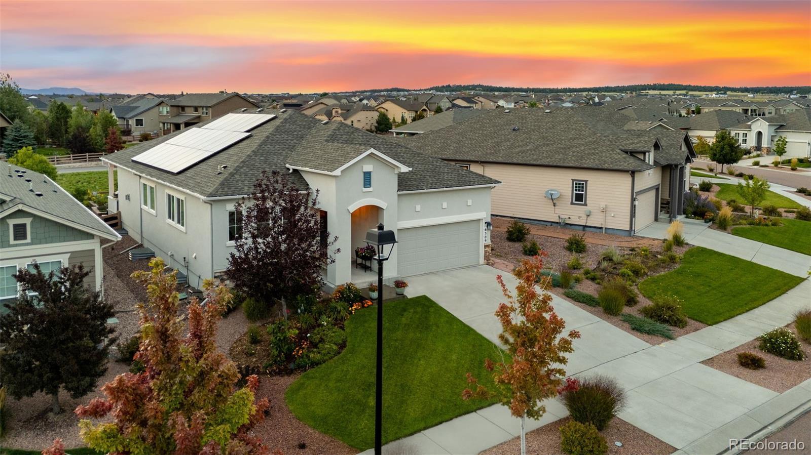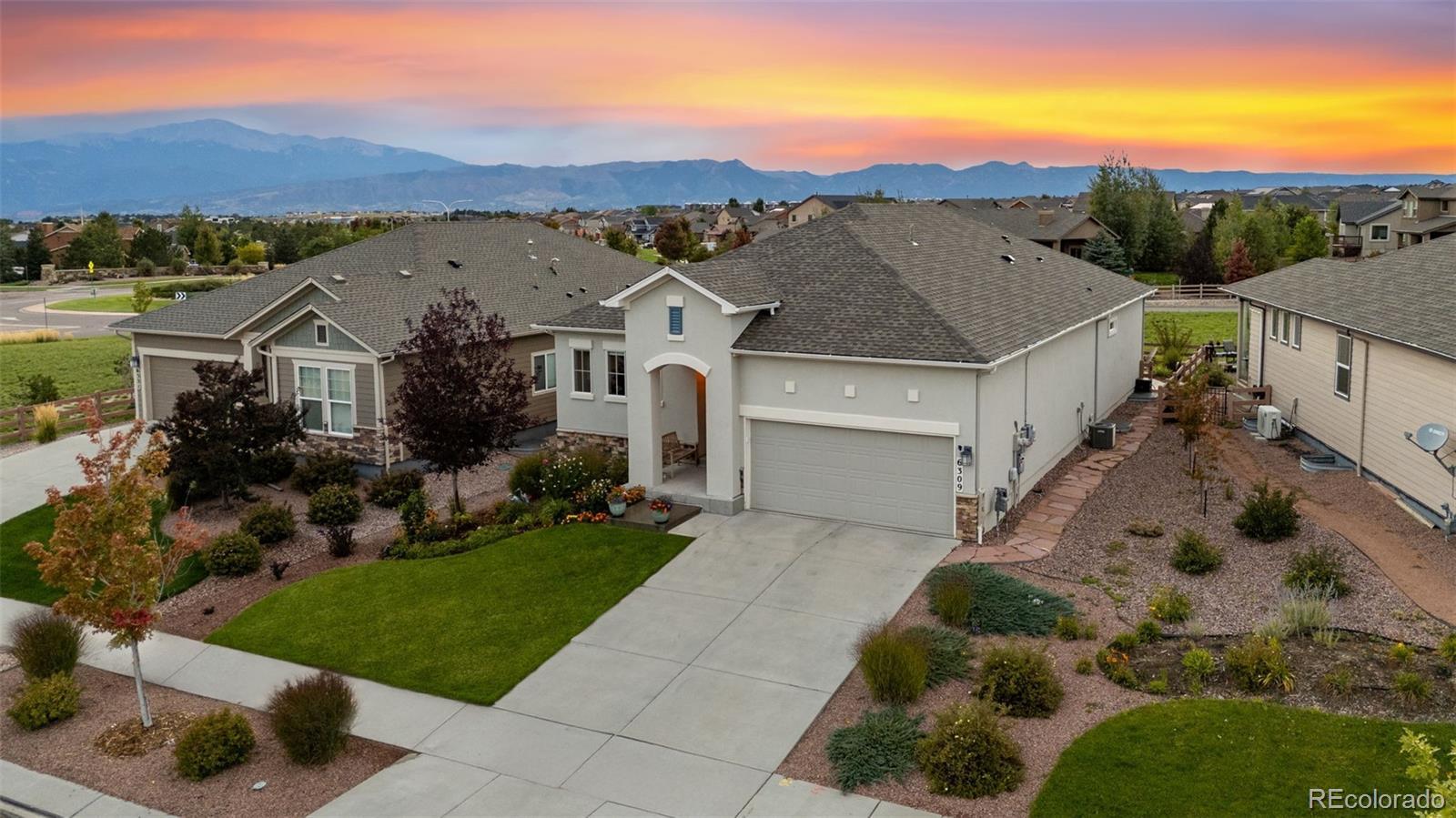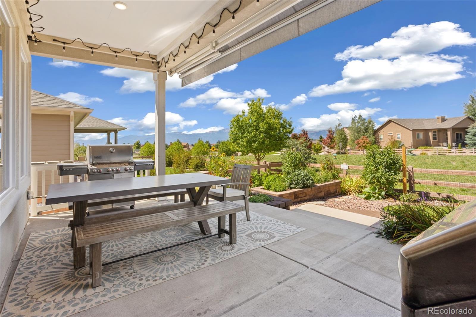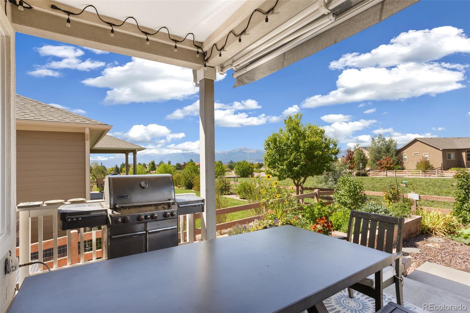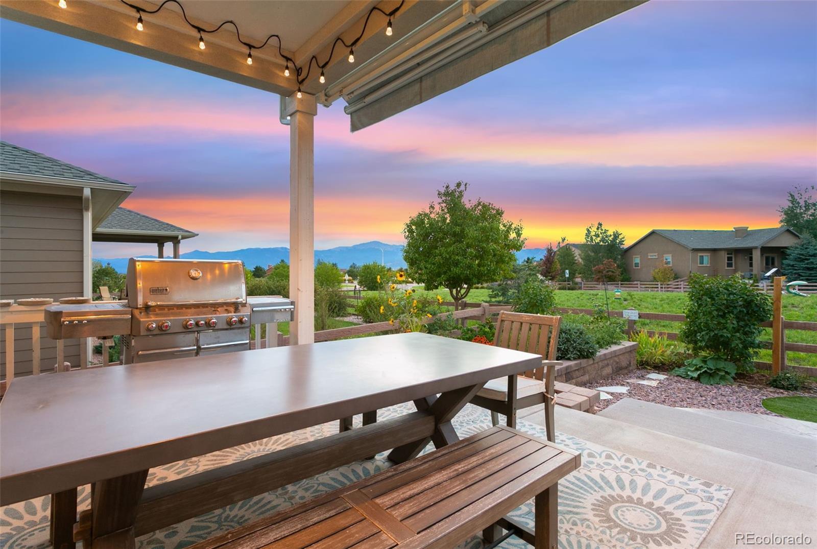 Set on a quiet street in the heart of the Wolf Ranch community, this home blends modern convenience with stunning Colorado scenery. From the back covered patio, enjoy sweeping views of Pikes Peak and the Front Range, framed by a fully landscaped, low-maintenance yard with native plants, a tranquil water feature, and a built-in gas fire pit. With a stucco exterior, paid-off solar panel system, and an east-facing driveway, the property is as practical as it is beautiful. Outdoor living is elevated with a retractable awning and gas grill hookup, while the lot backs to open space for privacy. A tandem three-car garage adds generous storage for vehicles, hobbies, or gear. Inside, main-level living is enhanced by natural light, hickory floors, and updated finishes throughout. The kitchen is both stylish and functional, featuring expanded cabinets, new lighting, and elegant dolomite counters. An open layout creates a warm and inviting atmosphere, while central vac adds convenience. From the great room and the master suite, soak in mountain views that make every day feel distinctly Colorado. The primary retreat includes a massive walk-in closet and a luxurious space with an oversized shower. A cozy gas fireplace anchors the main living space, adding charm and comfort. The basement expands the home’s versatility with soaring 9-foot ceilings, a massive wet bar designed for entertaining, and a large unfinished area that can serve as storage, a workshop, or future finished space. A rough-in is already in place for an additional bathroom, offering even more flexibility. Living in Wolf Ranch means access to highly regarded D20 schools just blocks away, along with seven miles of trails, a clubhouse, pool, dog park, and year-round community events. With nearby hospitals, shopping, dining, and quick access to Highways 21 and 83, this home offers an exceptional balance of natural beauty, modern updates, and community living.