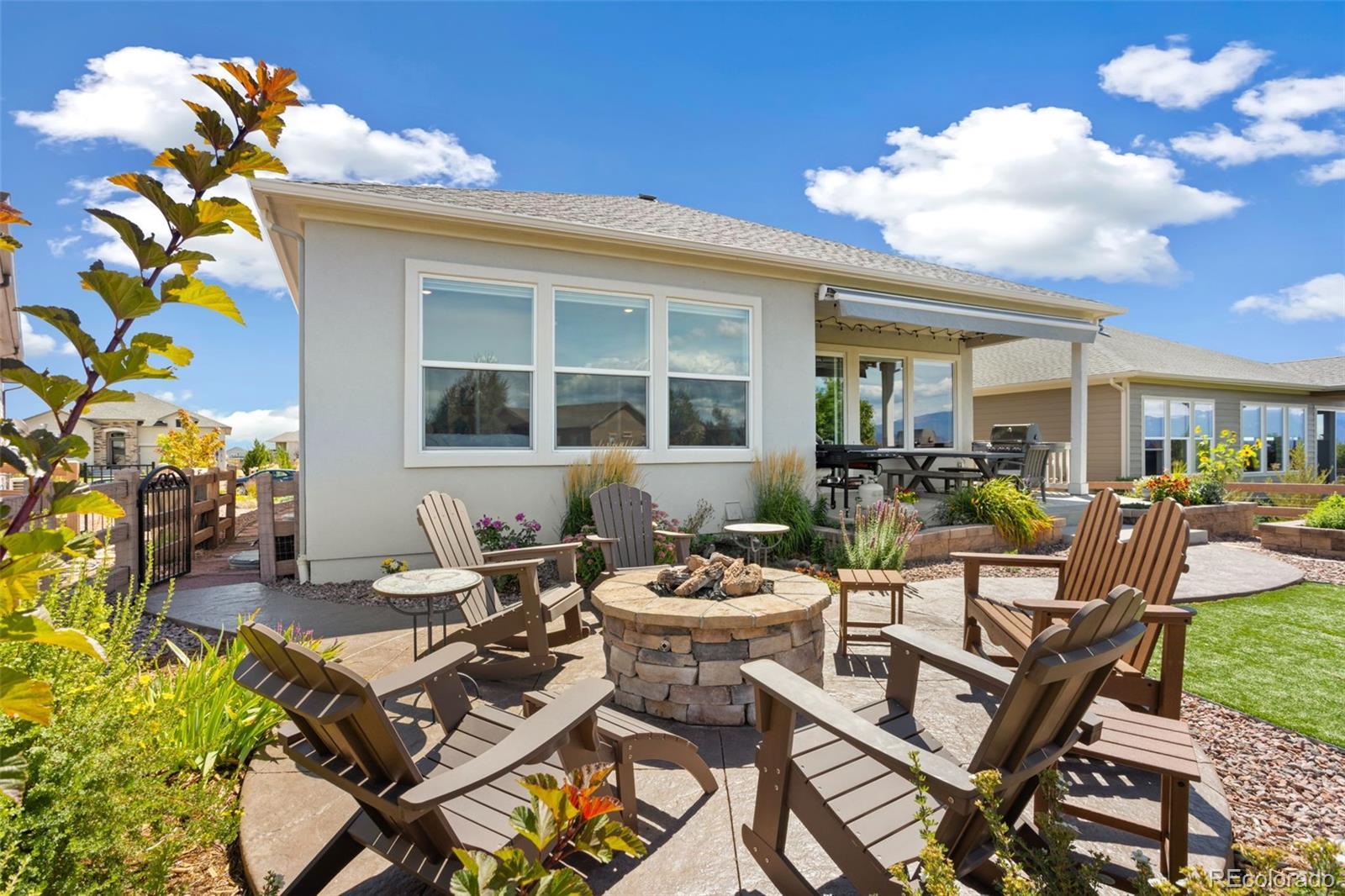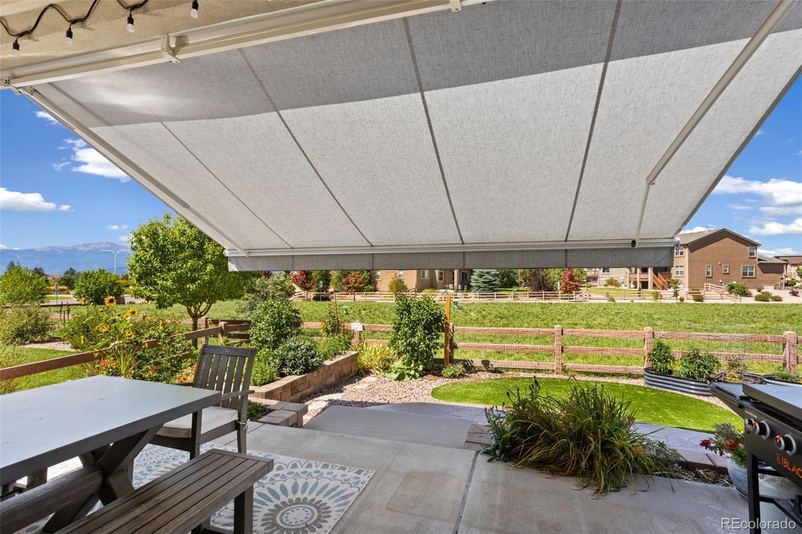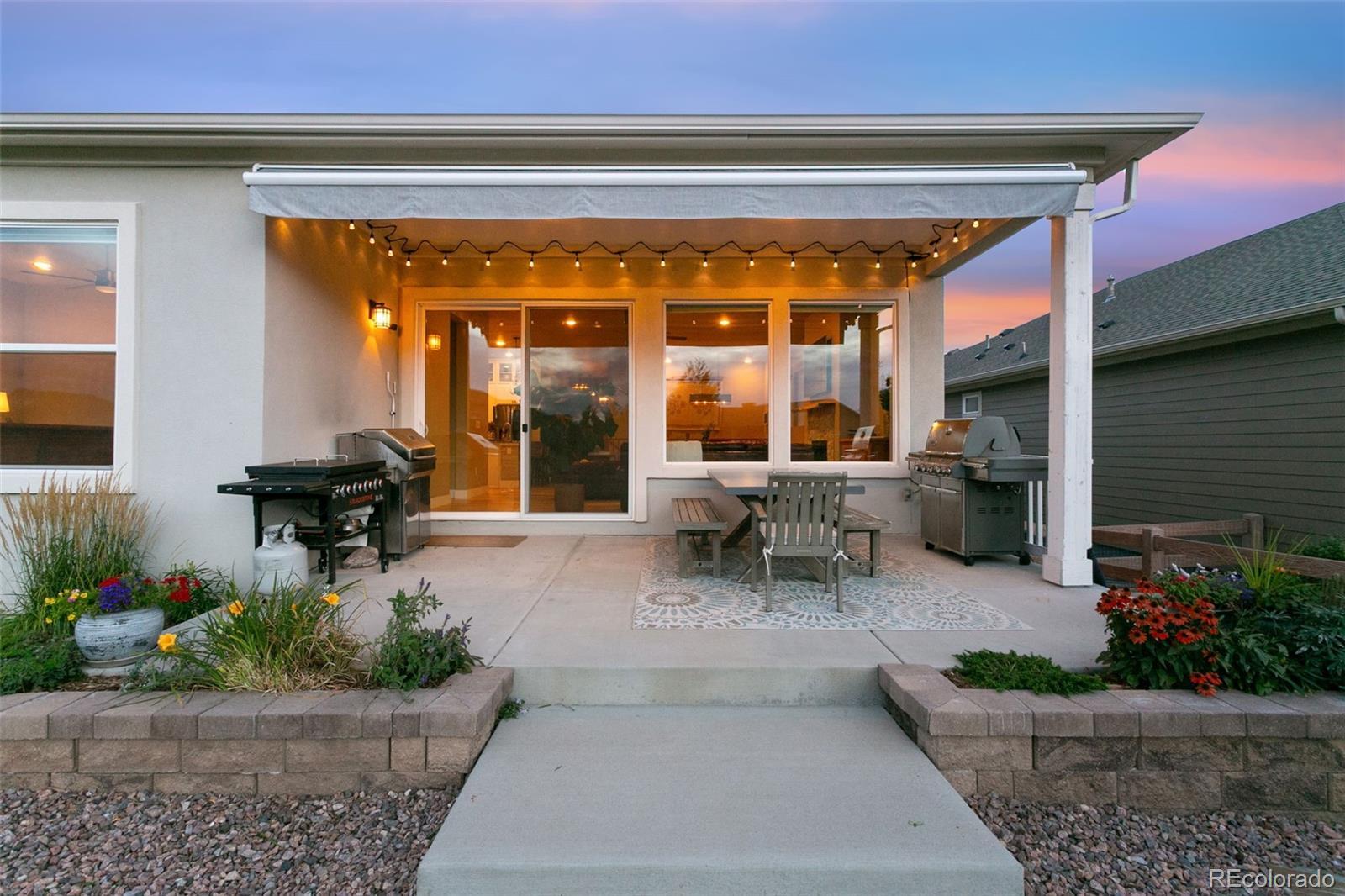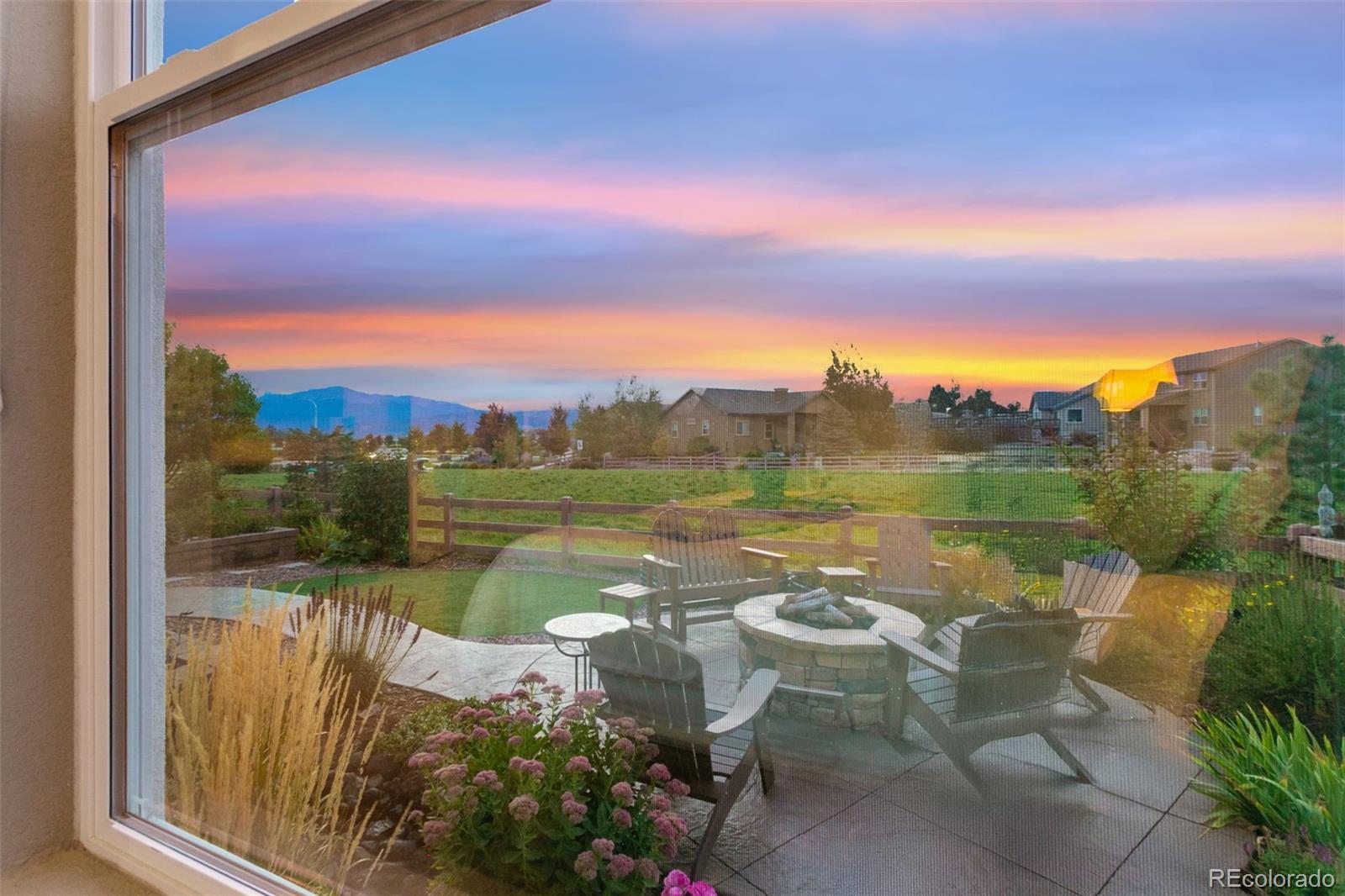 Set on a quiet street in the heart of the Wolf Ranch community, this home blends modern convenience with stunning Colorado scenery. From the back covered patio, enjoy sweeping views of Pikes Peak and the Front Range, framed by a fully landscaped, low-maintenance yard with native plants, a tranquil water feature, and a built-in gas fire pit. With a stucco exterior, paid-off solar panel system, and an east-facing driveway, the property is as practical as it is beautiful. Outdoor living is elevated with a retractable awning and gas grill hookup, while the lot backs to open space for privacy. A tandem three-car garage adds generous storage for vehicles, hobbies, or gear. Inside, main-level living is enhanced by natural light, hickory floors, and updated finishes throughout. The kitchen is both stylish and functional, featuring expanded cabinets, new lighting, and elegant dolomite counters. An open layout creates a warm and inviting atmosphere, while central vac adds convenience. From the great room and the master suite, soak in mountain views that make every day feel distinctly Colorado. The primary retreat includes a massive walk-in closet and a luxurious space with an oversized shower. A cozy gas fireplace anchors the main living space, adding charm and comfort. The basement expands the home’s versatility with soaring 9-foot ceilings, a massive wet bar designed for entertaining, and a large unfinished area that can serve as storage, a workshop, or future finished space. A rough-in is already in place for an additional bathroom, offering even more flexibility. Living in Wolf Ranch means access to highly regarded D20 schools just blocks away, along with seven miles of trails, a clubhouse, pool, dog park, and year-round community events. With nearby hospitals, shopping, dining, and quick access to Highways 21 and 83, this home offers an exceptional balance of natural beauty, modern updates, and community living.