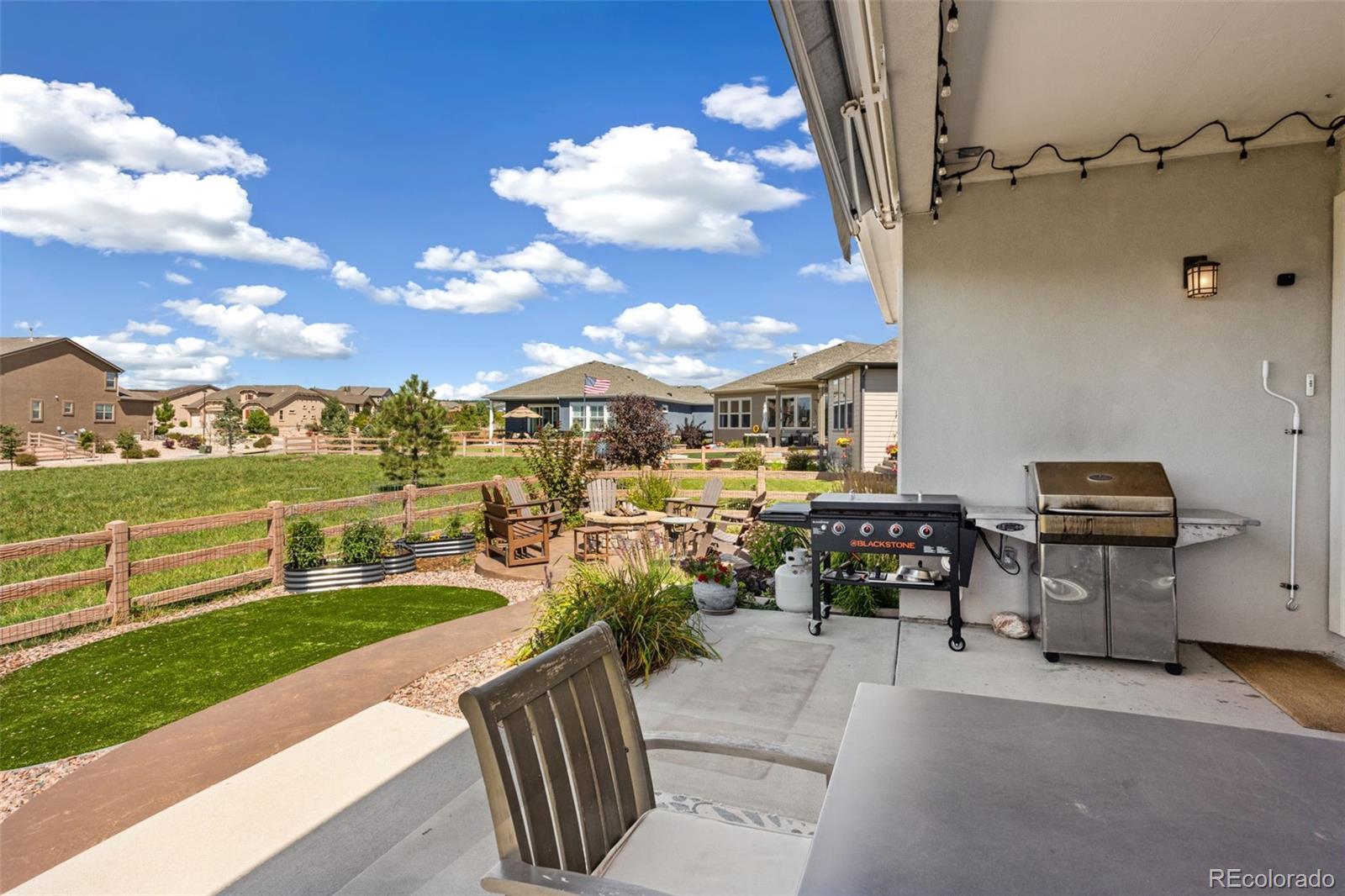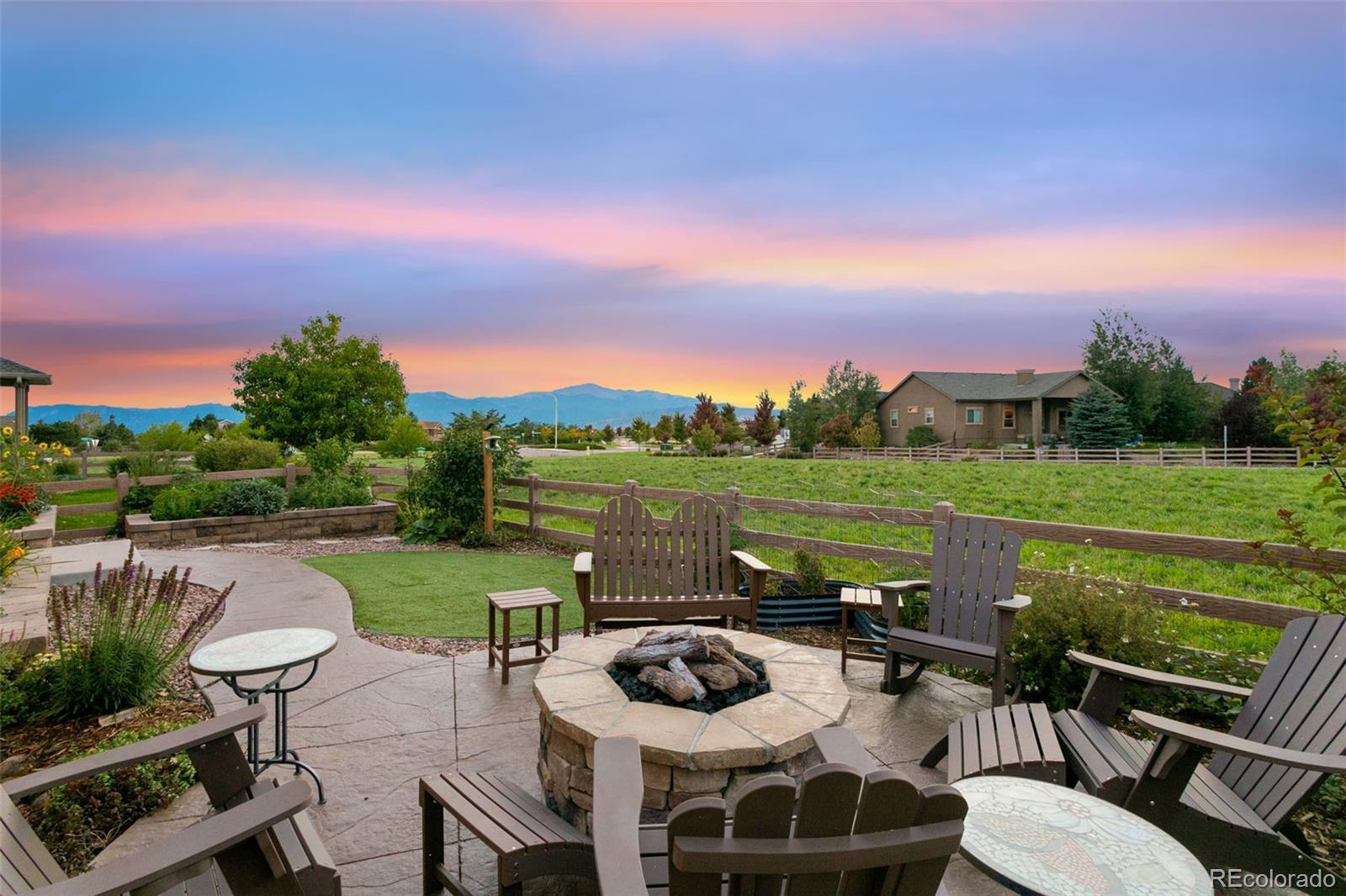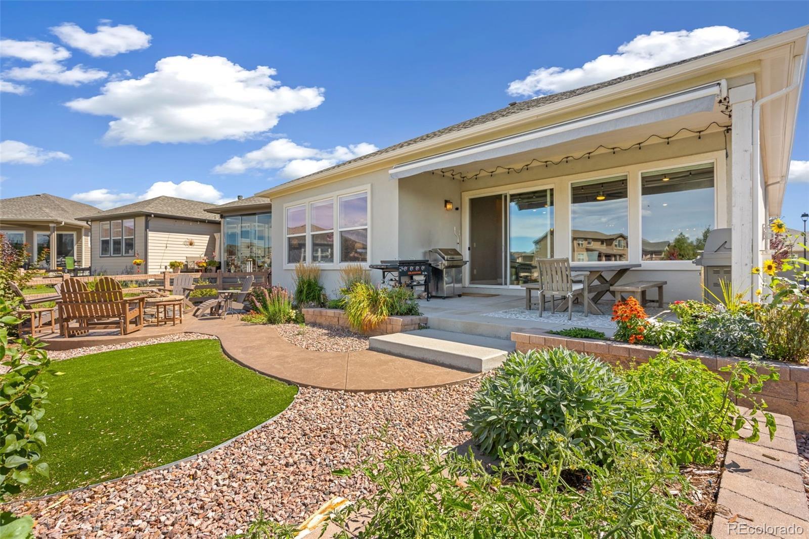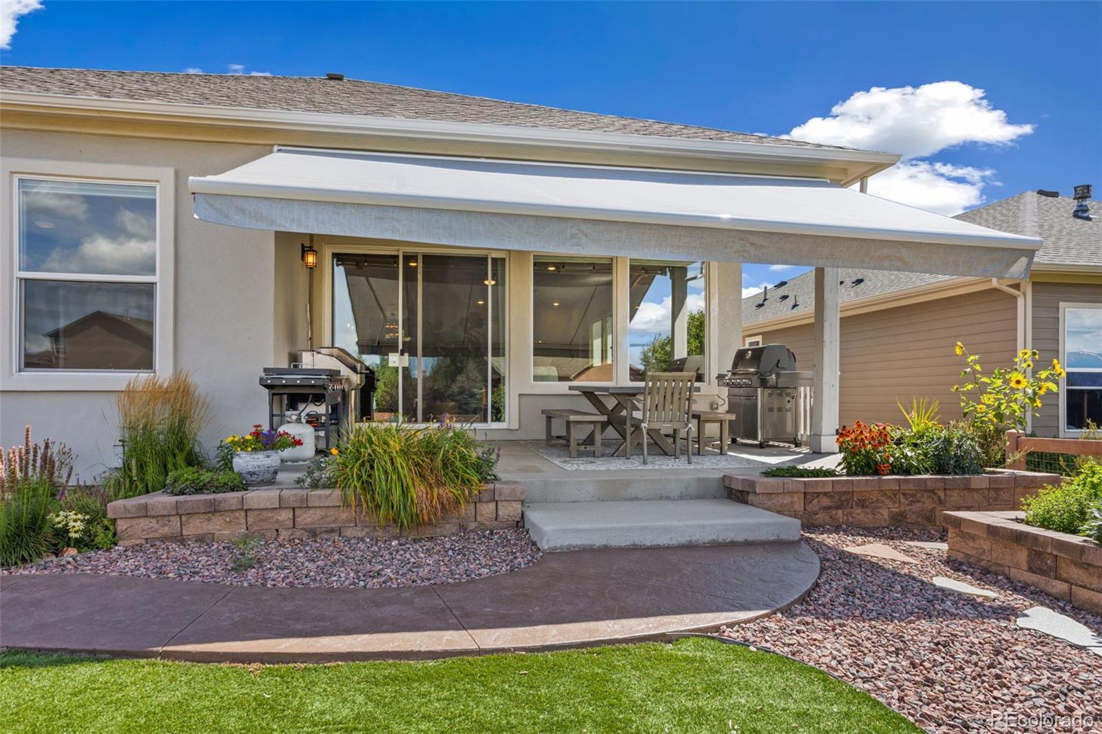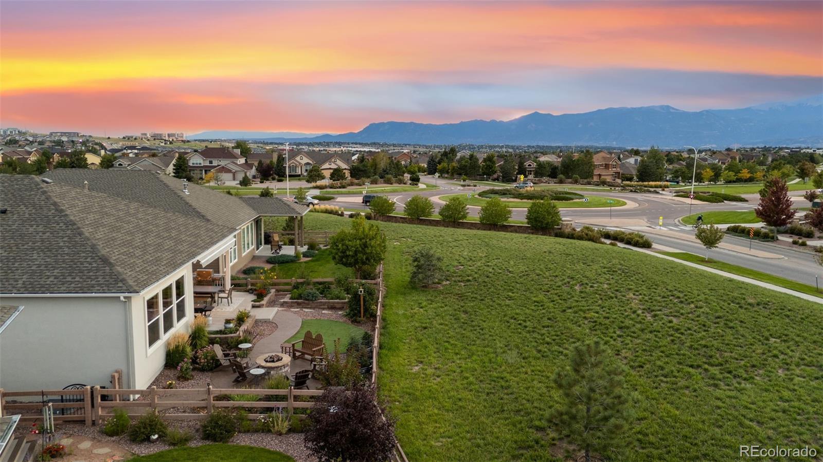 Set on a quiet street in the heart of the Wolf Ranch community, this home blends modern convenience with stunning Colorado scenery. From the back covered patio, enjoy sweeping views of Pikes Peak and the Front Range, framed by a fully landscaped, low-maintenance yard with native plants, a tranquil water feature, and a built-in gas fire pit. With a stucco exterior, paid-off solar panel system, and an east-facing driveway, the property is as practical as it is beautiful. Outdoor living is elevated with a retractable awning and gas grill hookup, while the lot backs to open space for privacy. A tandem three-car garage adds generous storage for vehicles, hobbies, or gear. Inside, main-level living is enhanced by natural light, hickory floors, and updated finishes throughout. The kitchen is both stylish and functional, featuring expanded cabinets, new lighting, and elegant dolomite counters. An open layout creates a warm and inviting atmosphere, while central vac adds convenience. From the great room and the master suite, soak in mountain views that make every day feel distinctly Colorado. The primary retreat includes a massive walk-in closet and a luxurious space with an oversized shower. A cozy gas fireplace anchors the main living space, adding charm and comfort. The basement expands the home’s versatility with soaring 9-foot ceilings, a massive wet bar designed for entertaining, and a large unfinished area that can serve as storage, a workshop, or future finished space. A rough-in is already in place for an additional bathroom, offering even more flexibility. Living in Wolf Ranch means access to highly regarded D20 schools just blocks away, along with seven miles of trails, a clubhouse, pool, dog park, and year-round community events. With nearby hospitals, shopping, dining, and quick access to Highways 21 and 83, this home offers an exceptional balance of natural beauty, modern updates, and community living.