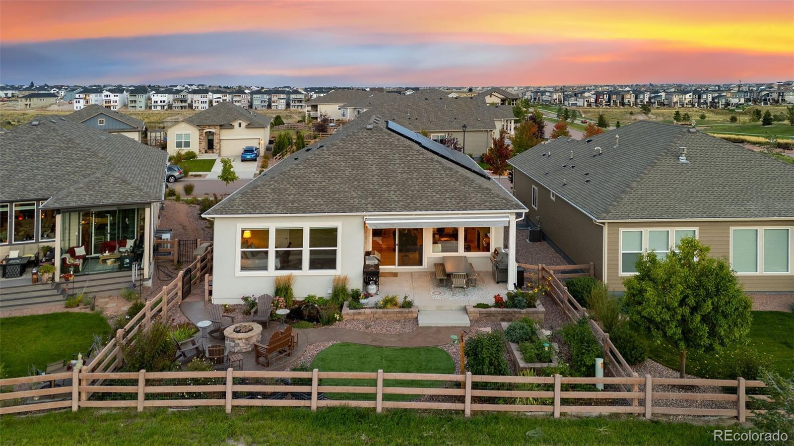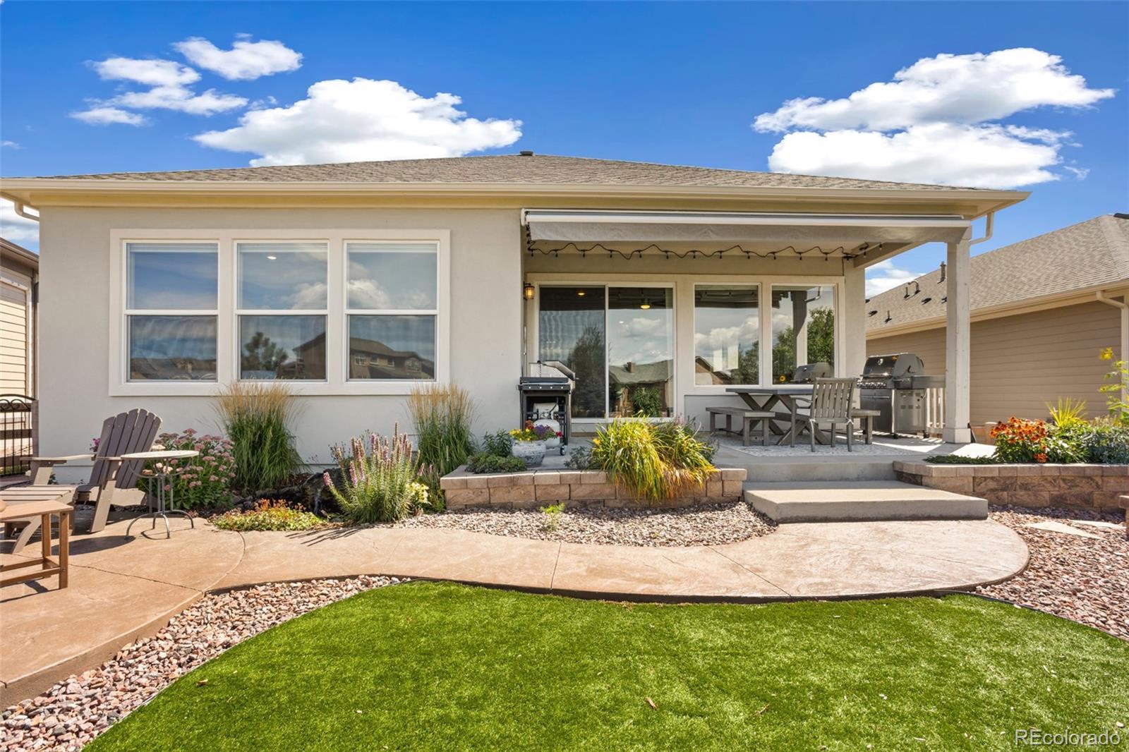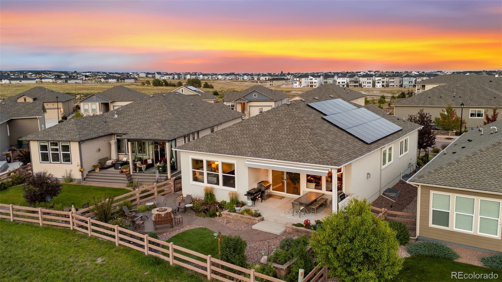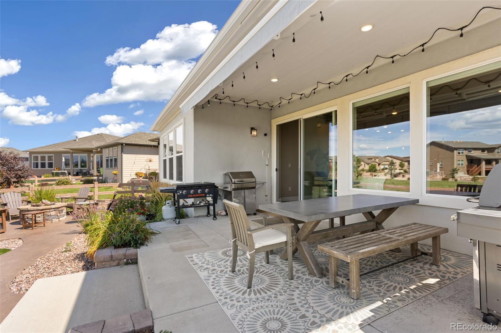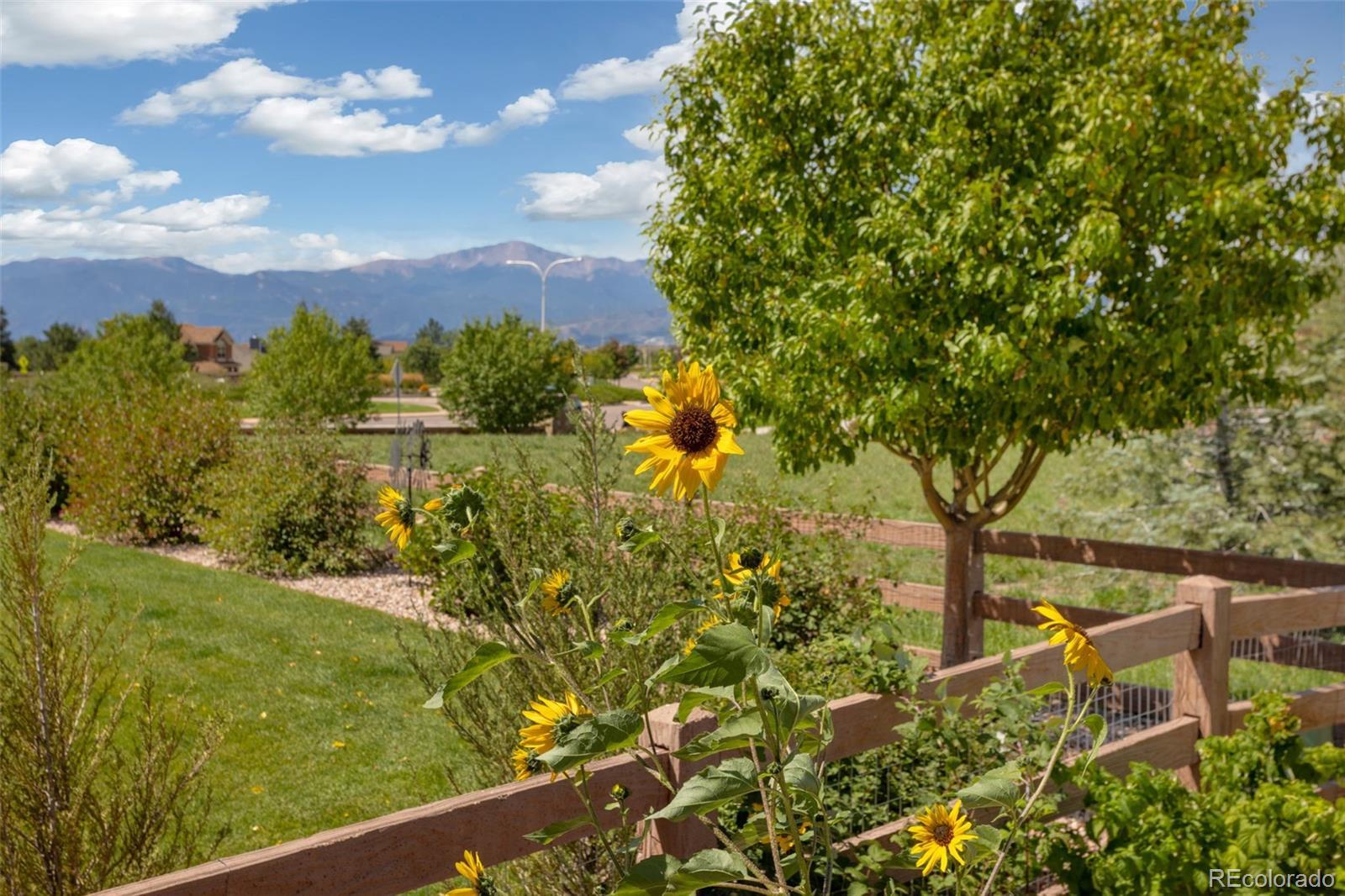 Set on a quiet street in the heart of the Wolf Ranch community, this home blends modern convenience with stunning Colorado scenery. From the back covered patio, enjoy sweeping views of Pikes Peak and the Front Range, framed by a fully landscaped, low-maintenance yard with native plants, a tranquil water feature, and a built-in gas fire pit. With a stucco exterior, paid-off solar panel system, and an east-facing driveway, the property is as practical as it is beautiful. Outdoor living is elevated with a retractable awning and gas grill hookup, while the lot backs to open space for privacy. A tandem three-car garage adds generous storage for vehicles, hobbies, or gear. Inside, main-level living is enhanced by natural light, hickory floors, and updated finishes throughout. The kitchen is both stylish and functional, featuring expanded cabinets, new lighting, and elegant dolomite counters. An open layout creates a warm and inviting atmosphere, while central vac adds convenience. From the great room and the master suite, soak in mountain views that make every day feel distinctly Colorado. The primary retreat includes a massive walk-in closet and a luxurious space with an oversized shower. A cozy gas fireplace anchors the main living space, adding charm and comfort. The basement expands the home’s versatility with soaring 9-foot ceilings, a massive wet bar designed for entertaining, and a large unfinished area that can serve as storage, a workshop, or future finished space. A rough-in is already in place for an additional bathroom, offering even more flexibility. Living in Wolf Ranch means access to highly regarded D20 schools just blocks away, along with seven miles of trails, a clubhouse, pool, dog park, and year-round community events. With nearby hospitals, shopping, dining, and quick access to Highways 21 and 83, this home offers an exceptional balance of natural beauty, modern updates, and community living.