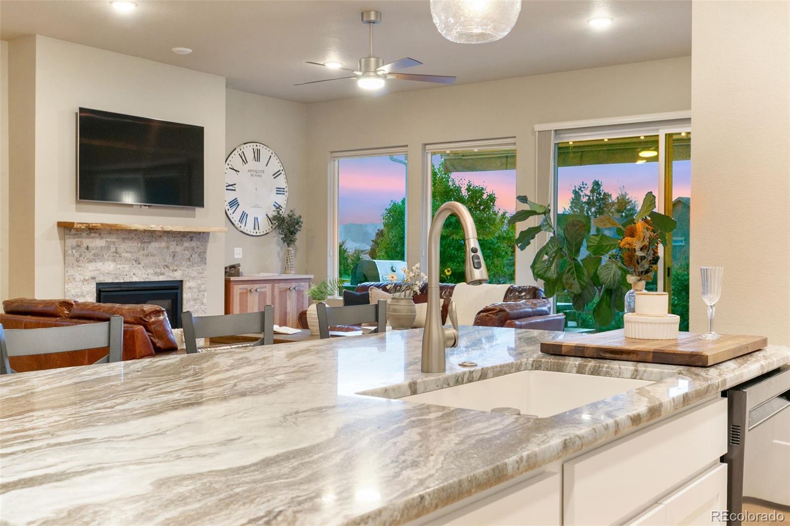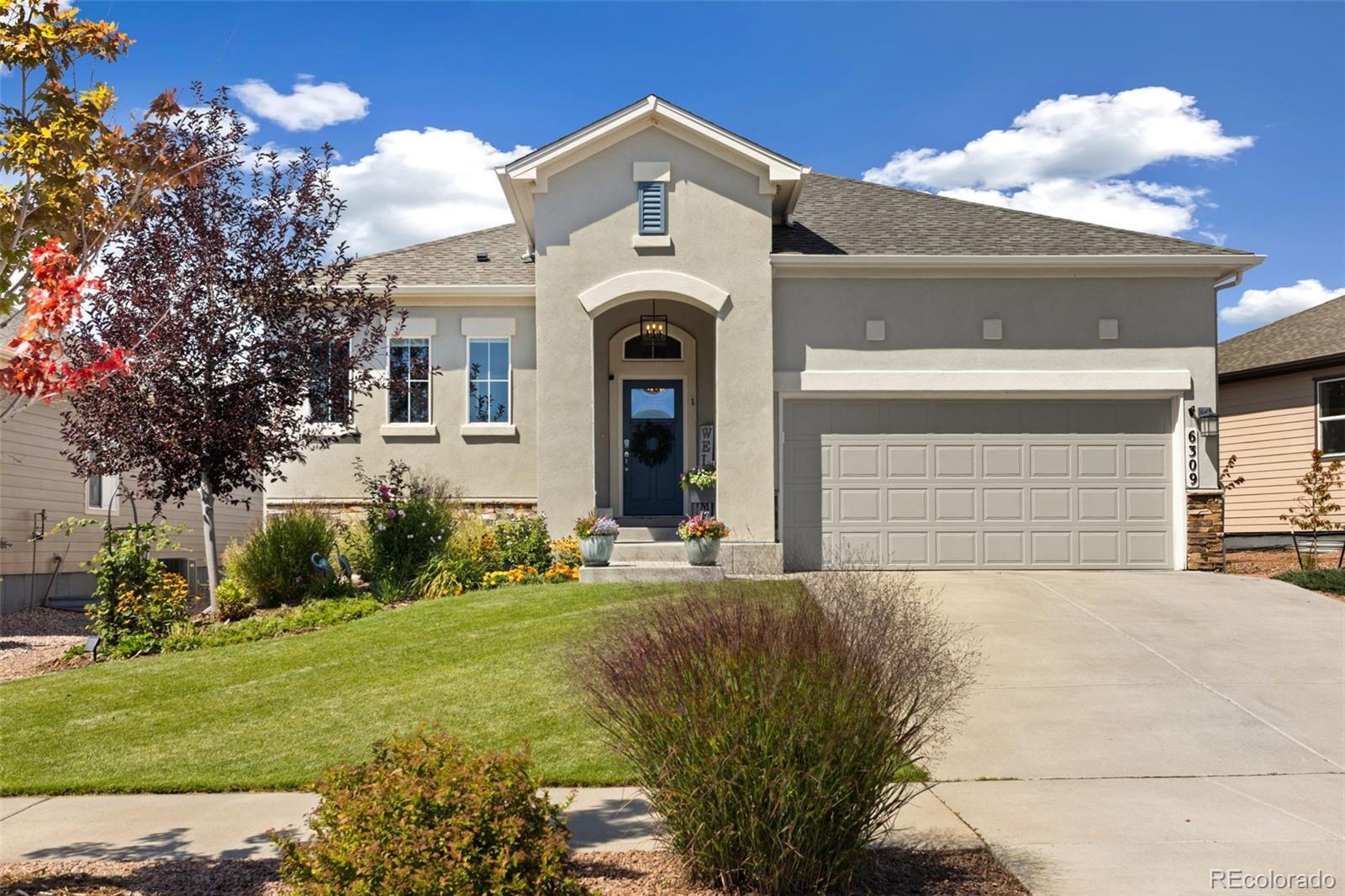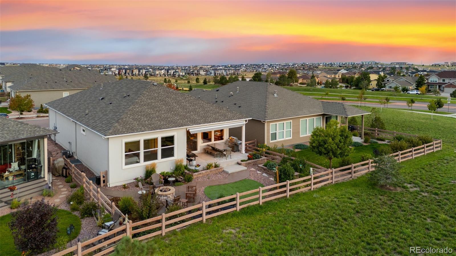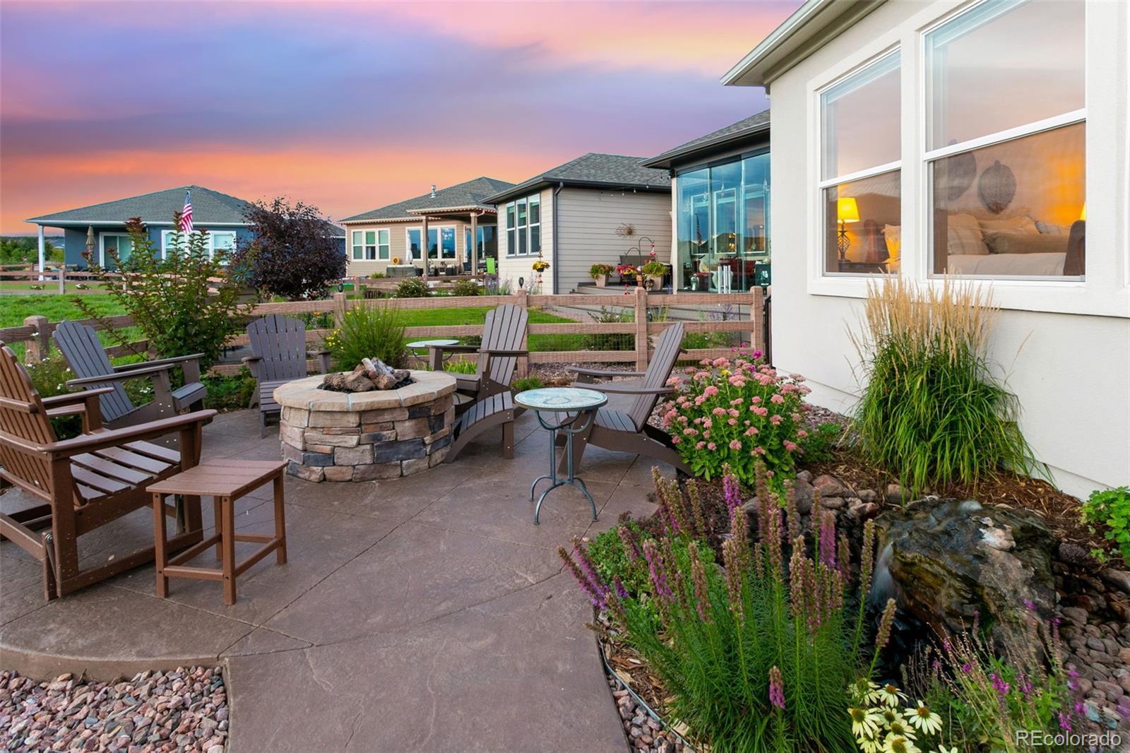 Set on a quiet street in the heart of the Wolf Ranch community, this home blends modern convenience with stunning Colorado scenery. From the back covered patio, enjoy sweeping views of Pikes Peak and the Front Range, framed by a fully landscaped, low-maintenance yard with native plants, a tranquil water feature, and a built-in gas fire pit. With a stucco exterior, paid-off solar panel system, and an east-facing driveway, the property is as practical as it is beautiful. Outdoor living is elevated with a retractable awning and gas grill hookup, while the lot backs to open space for privacy. A tandem three-car garage adds generous storage for vehicles, hobbies, or gear. Inside, main-level living is enhanced by natural light, hickory floors, and updated finishes throughout. The kitchen is both stylish and functional, featuring expanded cabinets, new lighting, and elegant dolomite counters. An open layout creates a warm and inviting atmosphere, while central vac adds convenience. From the great room and the master suite, soak in mountain views that make every day feel distinctly Colorado. The primary retreat includes a massive walk-in closet and a luxurious space with an oversized shower. A cozy gas fireplace anchors the main living space, adding charm and comfort. The basement expands the home’s versatility with soaring 9-foot ceilings, a massive wet bar designed for entertaining, and a large unfinished area that can serve as storage, a workshop, or future finished space. A rough-in is already in place for an additional bathroom, offering even more flexibility. Living in Wolf Ranch means access to highly regarded D20 schools just blocks away, along with seven miles of trails, a clubhouse, pool, dog park, and year-round community events. With nearby hospitals, shopping, dining, and quick access to Highways 21 and 83, this home offers an exceptional balance of natural beauty, modern updates, and community living.