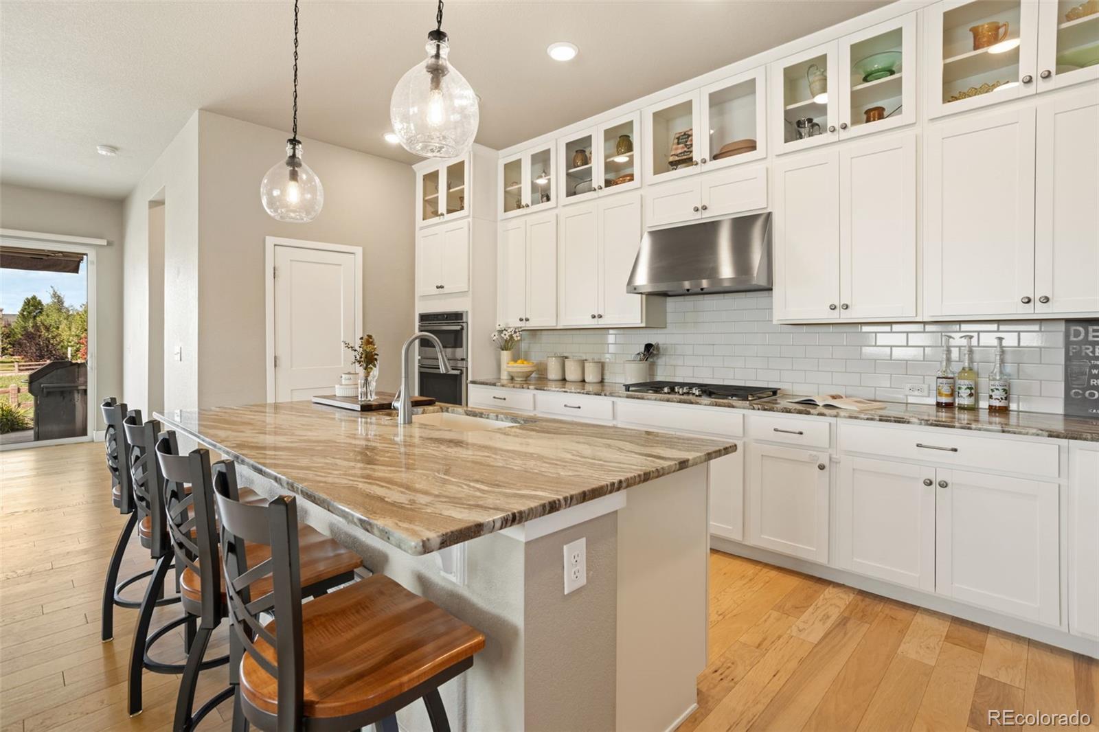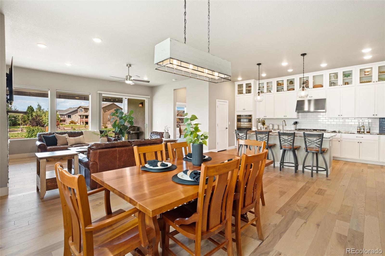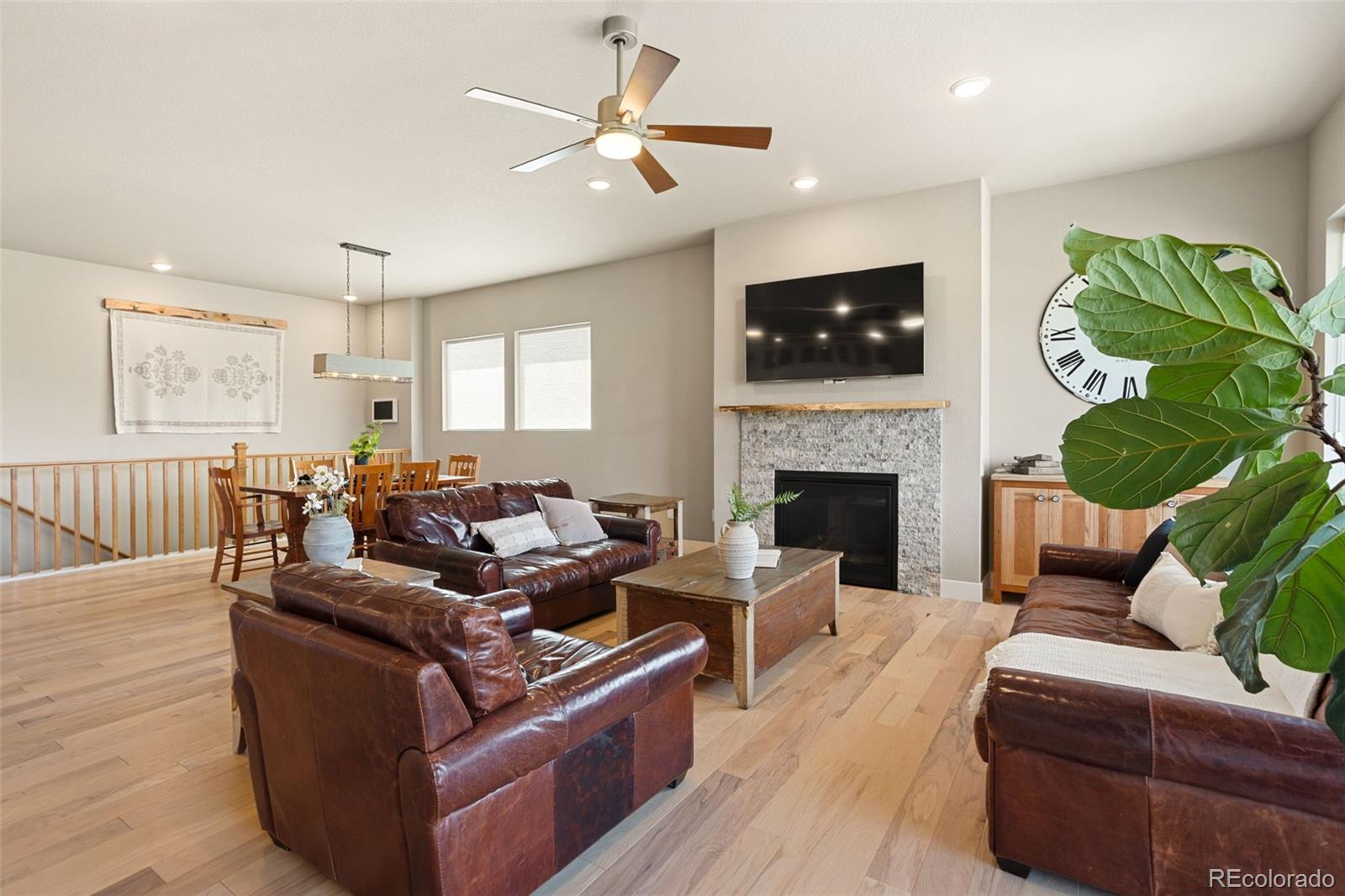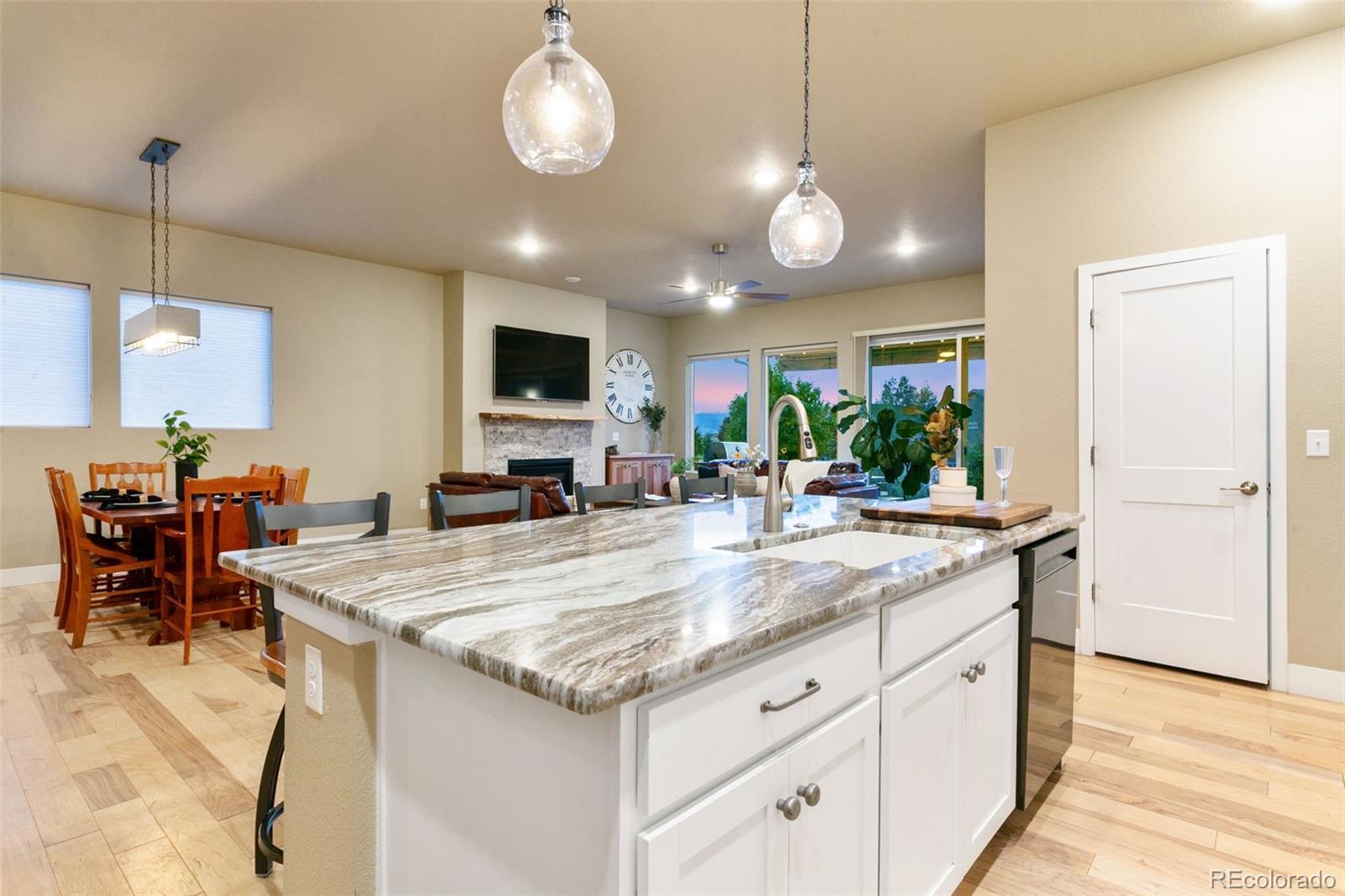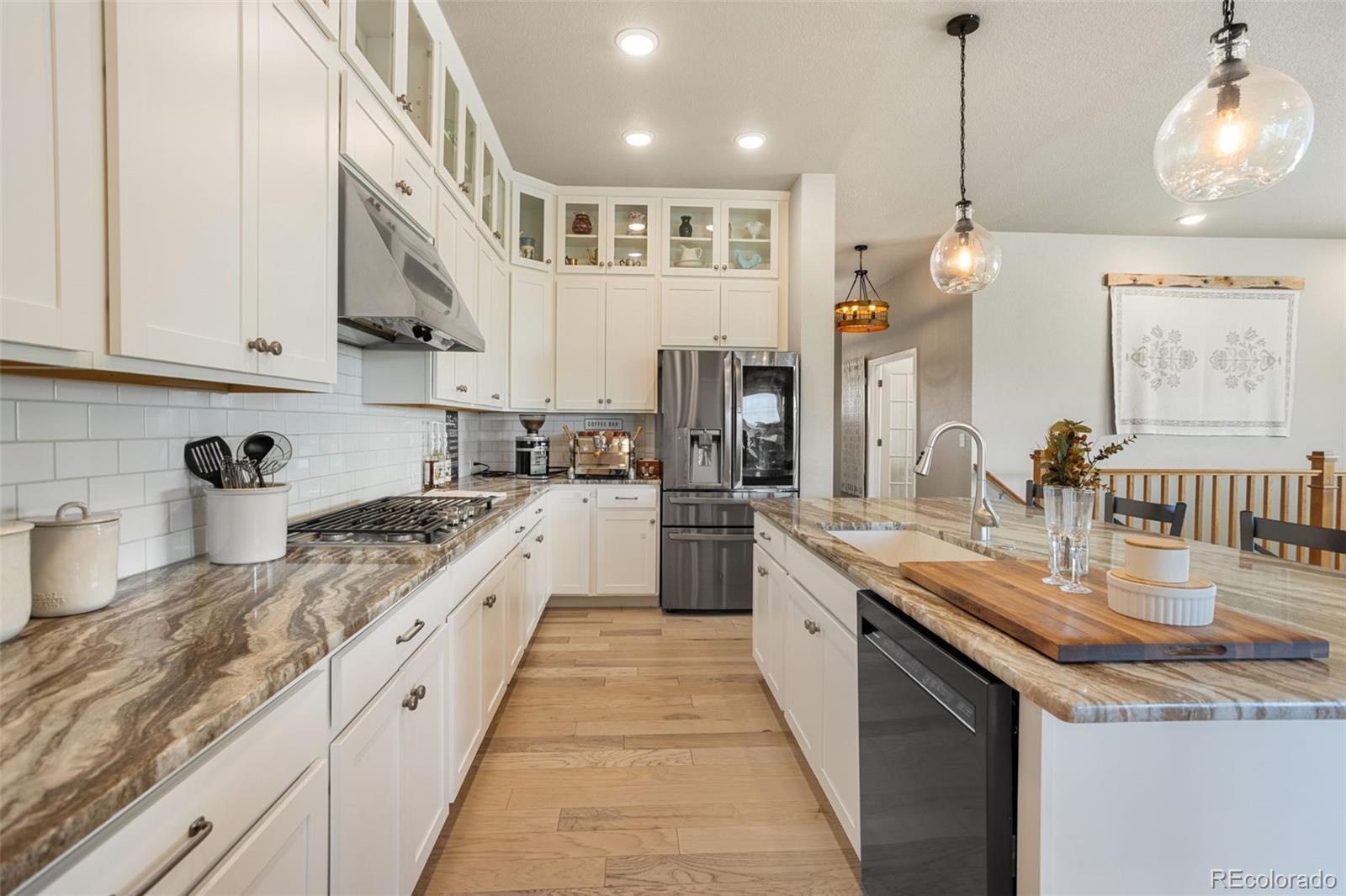 Set on a quiet street in the heart of the Wolf Ranch community, this home blends modern convenience with stunning Colorado scenery. From the back covered patio, enjoy sweeping views of Pikes Peak and the Front Range, framed by a fully landscaped, low-maintenance yard with native plants, a tranquil water feature, and a built-in gas fire pit. With a stucco exterior, paid-off solar panel system, and an east-facing driveway, the property is as practical as it is beautiful. Outdoor living is elevated with a retractable awning and gas grill hookup, while the lot backs to open space for privacy. A tandem three-car garage adds generous storage for vehicles, hobbies, or gear. Inside, main-level living is enhanced by natural light, hickory floors, and updated finishes throughout. The kitchen is both stylish and functional, featuring expanded cabinets, new lighting, and elegant dolomite counters. An open layout creates a warm and inviting atmosphere, while central vac adds convenience. From the great room and the master suite, soak in mountain views that make every day feel distinctly Colorado. The primary retreat includes a massive walk-in closet and a luxurious space with an oversized shower. A cozy gas fireplace anchors the main living space, adding charm and comfort. The basement expands the home’s versatility with soaring 9-foot ceilings, a massive wet bar designed for entertaining, and a large unfinished area that can serve as storage, a workshop, or future finished space. A rough-in is already in place for an additional bathroom, offering even more flexibility. Living in Wolf Ranch means access to highly regarded D20 schools just blocks away, along with seven miles of trails, a clubhouse, pool, dog park, and year-round community events. With nearby hospitals, shopping, dining, and quick access to Highways 21 and 83, this home offers an exceptional balance of natural beauty, modern updates, and community living.