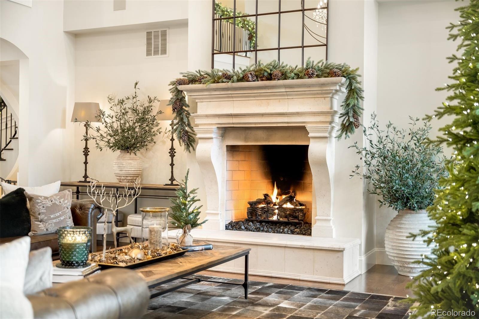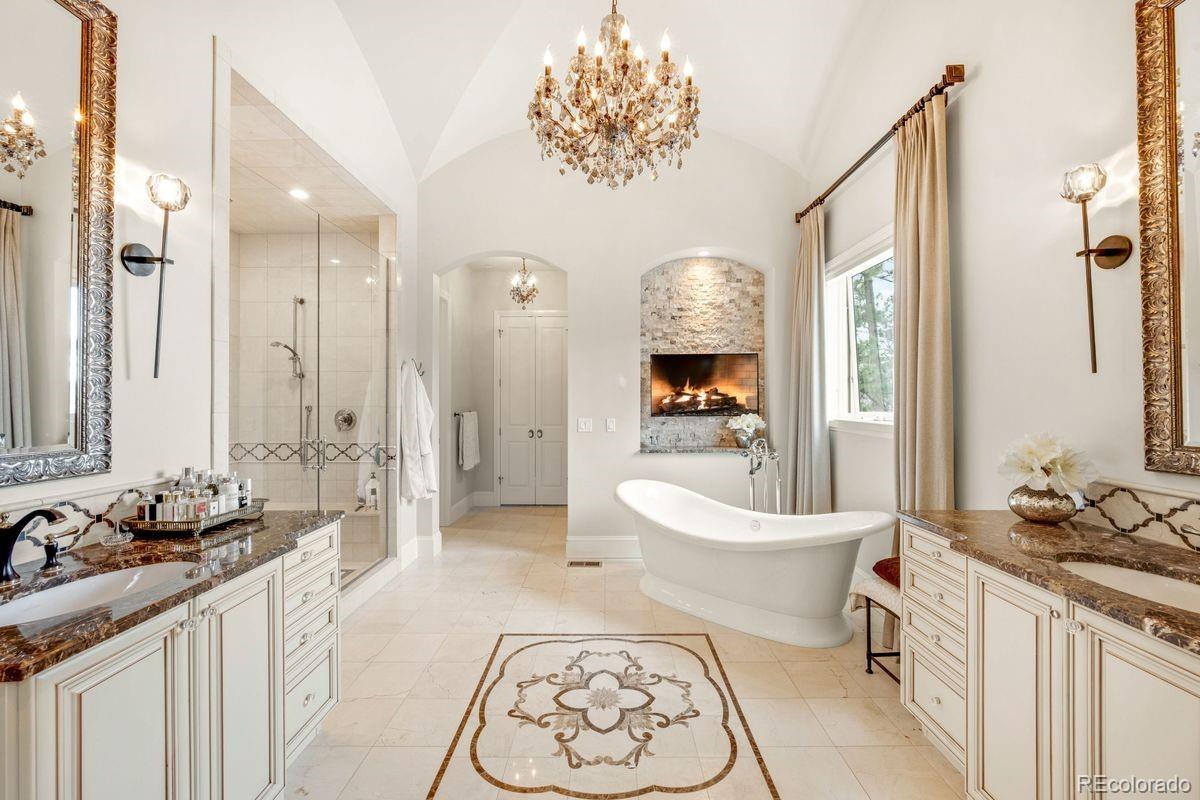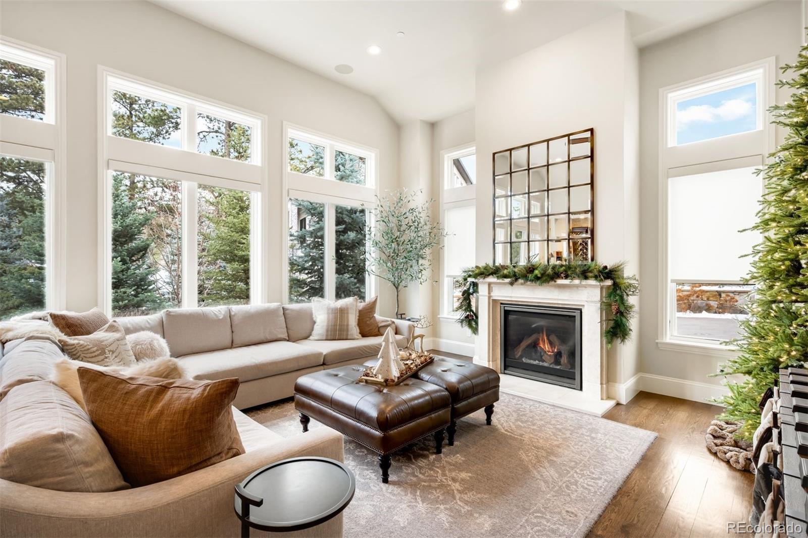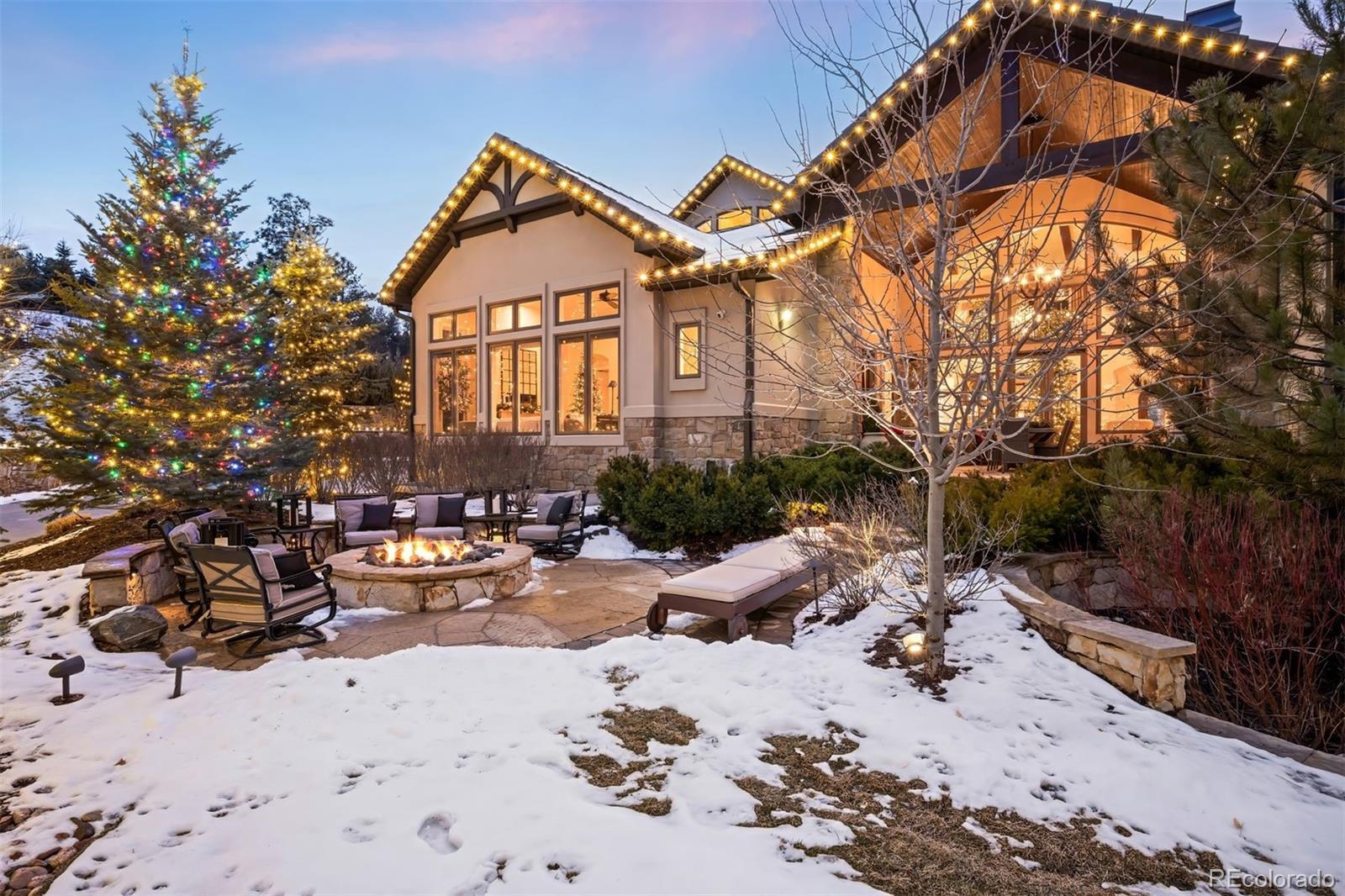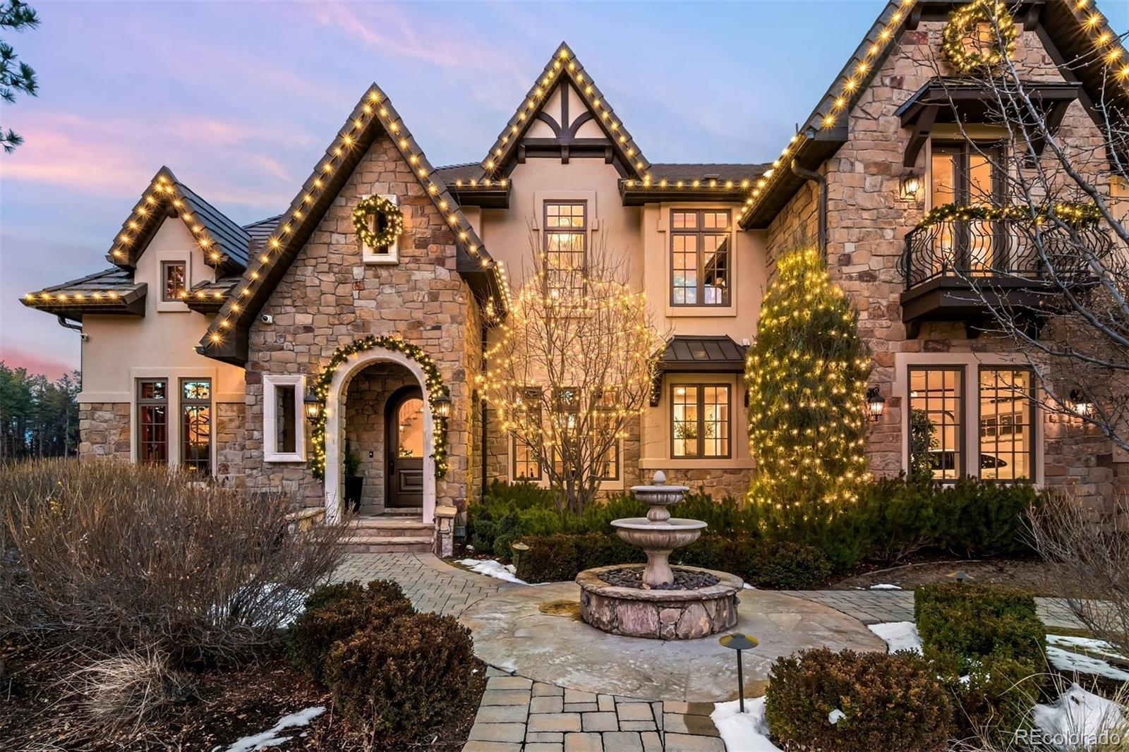 Envision arriving home to this opulent estate in Pinon Soleil, gracefully set among majestic 100-year-old pines. Designed by a renowned architect, this bespoke residence sits on a pristine acre, offering sweeping views, exceptional privacy, and a setting that harmonizes beautifully with its natural surroundings. Soaring ceilings, rich wood accents, and meticulously curated architectural details define an atmosphere of timeless luxury throughout. Expansive windows frame forested vistas and natural light throughout, creating a serene retreat that feels both grand and welcoming year-round. A distinguished main-level study welcomes you with quiet authority, featuring custom wood paneling, intricate flooring, dramatic ceiling heights, and its own fireplace. The great room unfolds in grand fashion, anchored by a striking fireplace and seamlessly connecting to the chef-inspired kitchen and outdoor living spaces. The kitchen blends culinary excellence with architectural beauty, showcasing Wolf, Sub-Zero, Thermador, and Bosch appliances, along with refined wood, marble, and granite finishes. A spacious butler’s pantry enhances functionality, while a 500-bottle wine cellar with a dedicated tasting room offers a gallery-like experience for collectors. The main-level primary suite is a private sanctuary, highlighted by a fireplace, vaulted beamed ceilings, and a spa-inspired bath with heated floors and a sculptural soaking tub. All five bedrooms feature private en-suites, while six fireplaces and lofty ceilings throughout add warmth and architectural presence. Outdoor living is elevated by a covered patio with a full kitchen and 85-inch Seura outdoor television. Savant smart-home technology, a heated-tile porte-cochere, circular drive, over $500,000 in custom landscaping, and a finished four-car garage complete this exceptional offering. Ideally located in Castle Rock with immediate access to I-25, shopping, and premier amenities, this residence defines Colorado luxury living.