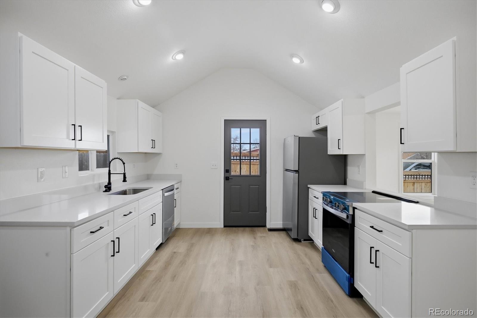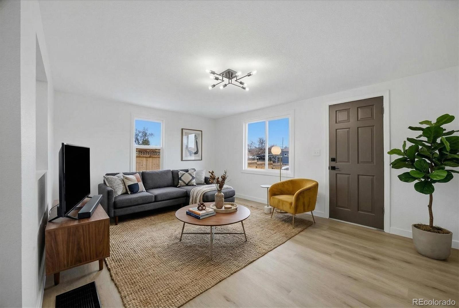Welcome to this fully remodeled and truly adorable home, ideally located with quick and easy access to Downtown Denver. Thoughtfully updated from top to bottom, this home offers modern comfort, fresh style, and peace of mind for years to come. Inside, you’ll find new flooring, fresh paint throughout, and all-new windows that fill the space with natural light. The kitchen has been completely transformed with new cabinets, new countertops, and brand-new appliances including a refrigerator, range, dishwasher, and disposal. Updated lighting, ceiling fans, plumbing fixtures, bathroom hardware, kitchen hardware, and door hardware add a clean and cohesive look throughout the home. The improvements extend well beyond the cosmetic updates. A new furnace, new hot water heater, and new sewer line provide important long-term upgrades, along with new baseboards and doors that tie everything together. Outside, the property has been refreshed with new landscaping, tree trimming, and all-new concrete, including the driveway, walkways, and a generous rear patio, perfect for outdoor gatherings or quiet evenings. With excellent proximity to Downtown Denver and a full list of high-quality updates, this beautifully renovated home is move-in ready and waiting for its next owner. Exterior photos are AI enhanced with green grass and leafed trees. Interior photos are virtually staged.