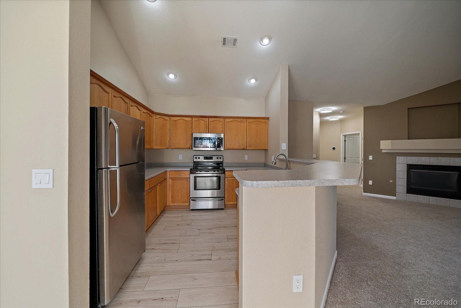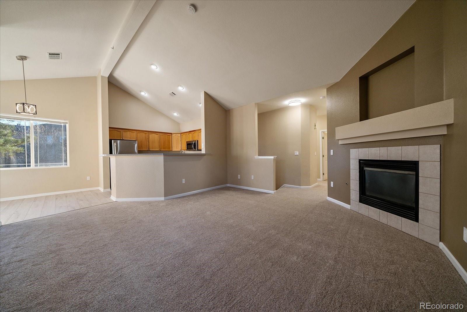 Price Reduced! Beautifully updated and meticulously maintained, this inviting two-bedroom, two-bath condominium is located in the desirable Deer Creek community. The home offers a private entrance with no unit above, providing added privacy, along with a detached garage conveniently located next door and ample additional parking nearby. Inside, you’ll find an open floor plan highlighted by vaulted ceilings, brand-new luxury vinyl flooring, and new carpet throughout. The open kitchen features stainless steel appliances and includes a washer and dryer, flowing seamlessly into the dining area and out to a private covered deck with extra storage. The spacious primary bedroom boasts a walk-in closet and an en-suite bathroom, while new lighting and hardware add a modern touch throughout the unit. A natural gas fireplace anchors the family room, creating a warm and welcoming space. Residents enjoy outstanding amenities including a community pool, spa/hot tub, and fitness center, with the HOA covering water, sewer, and trash. Ideally located near C-470, shopping, dining, and trails, this home also offers easy access to the Denver Tech Center and the mountains. Buyer and buyer agent to verify all information.