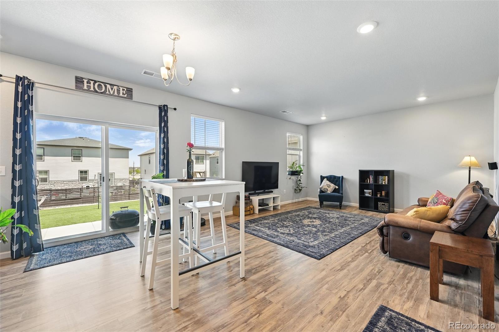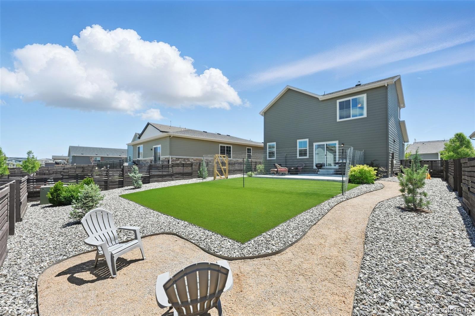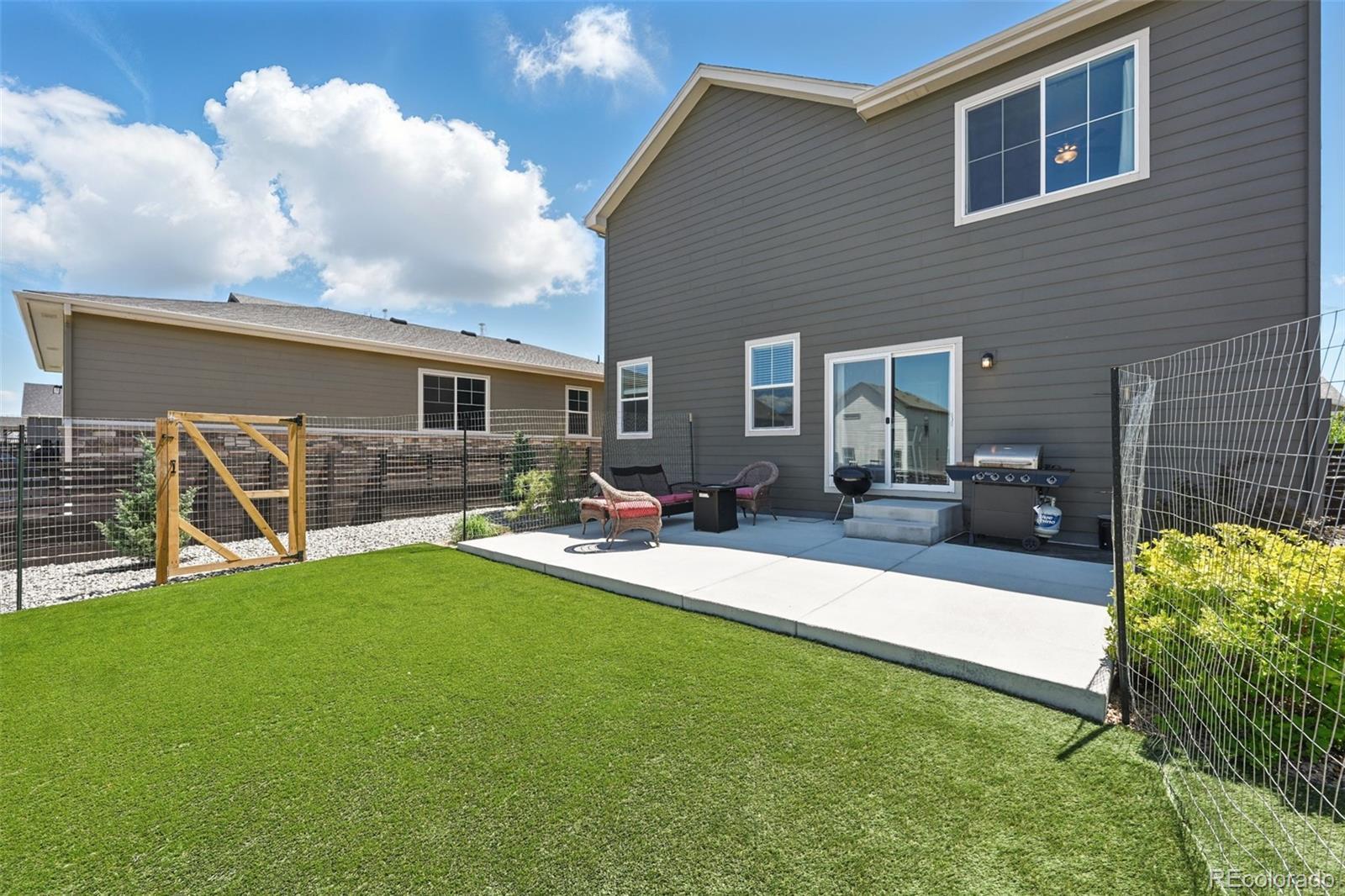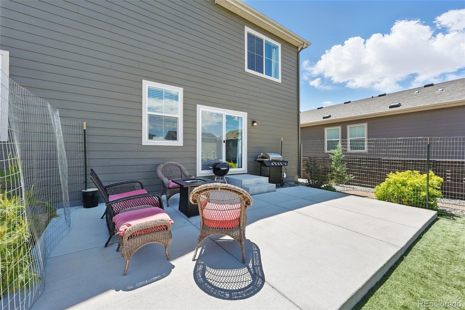 Two-story home built in 2020. No need to wait for completed construction when you can have this modern 5-year-old home with landscaping and window coverings, etc.. Located in Harmony Subdivision, near Buckley Air Force Base, Aurora. Minutes from DIA. 3 bedroom, 3 bathroom, open floor plan. The kitchen has Whirlpool appliances, granite countertops, and a hanging pot and pan rack above the Island. The double oven range is self-cleaning, and engineered flooring is throughout the main floor. Carpeting on the stairs and the second floor. The Primary Suite has a large walk-in closet and a linen closet. Laundry is upstairs. Also, a large crawl space for storage under the house. Landscaping in the front, astro turf, and water-wise plants in the backyard. The garage floor has been epoxied for a nicer surface. A storage rack over the garage door was added. The community center features a pool, a hot tub, a gym with cardio and weight training facilities, a golf simulator, and an event room available upon request. There are multiple playgrounds, walking and biking trails, and a dog park. The community is in an excellent location with access to schools, shopping, dining, entertainment, and DIA. It's a great family home and community; take a look. Smoke-free home. Price to sell don't pass this up. Has a VA assumable loan at 2.875% (Qualification requirements)