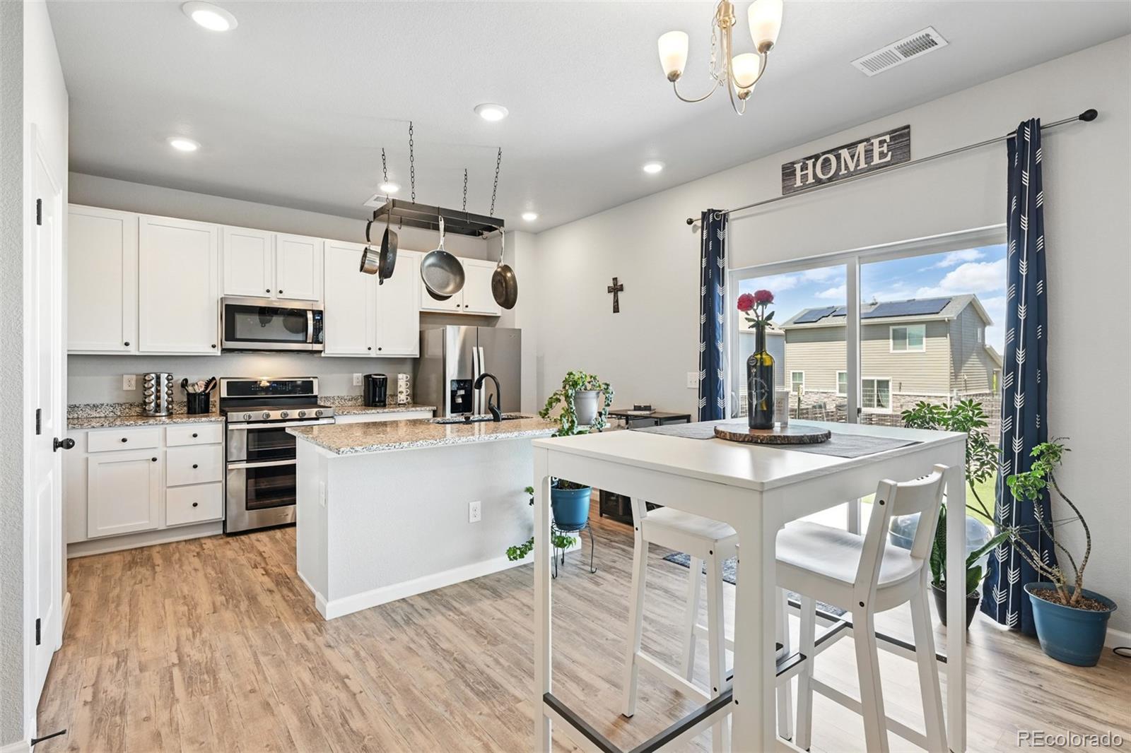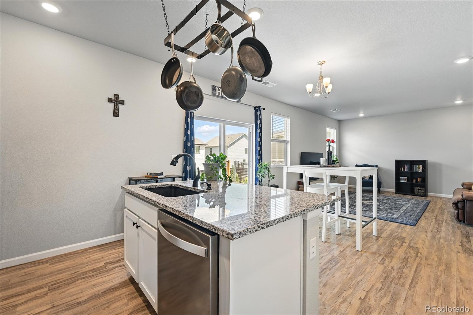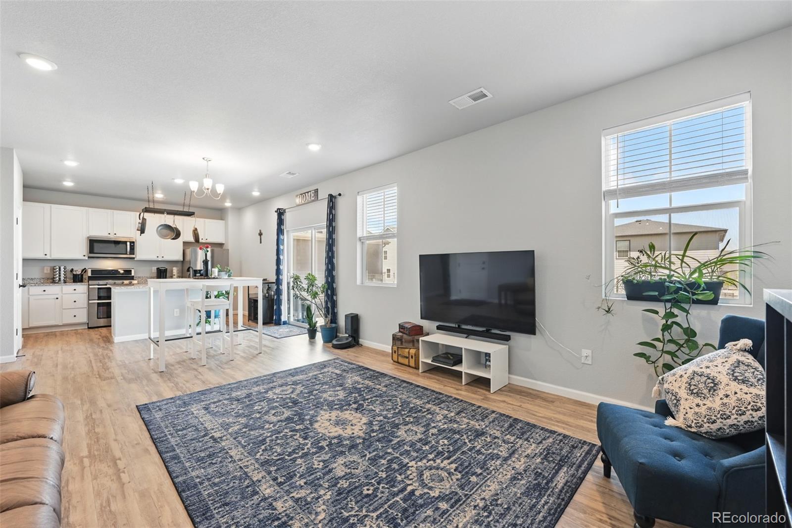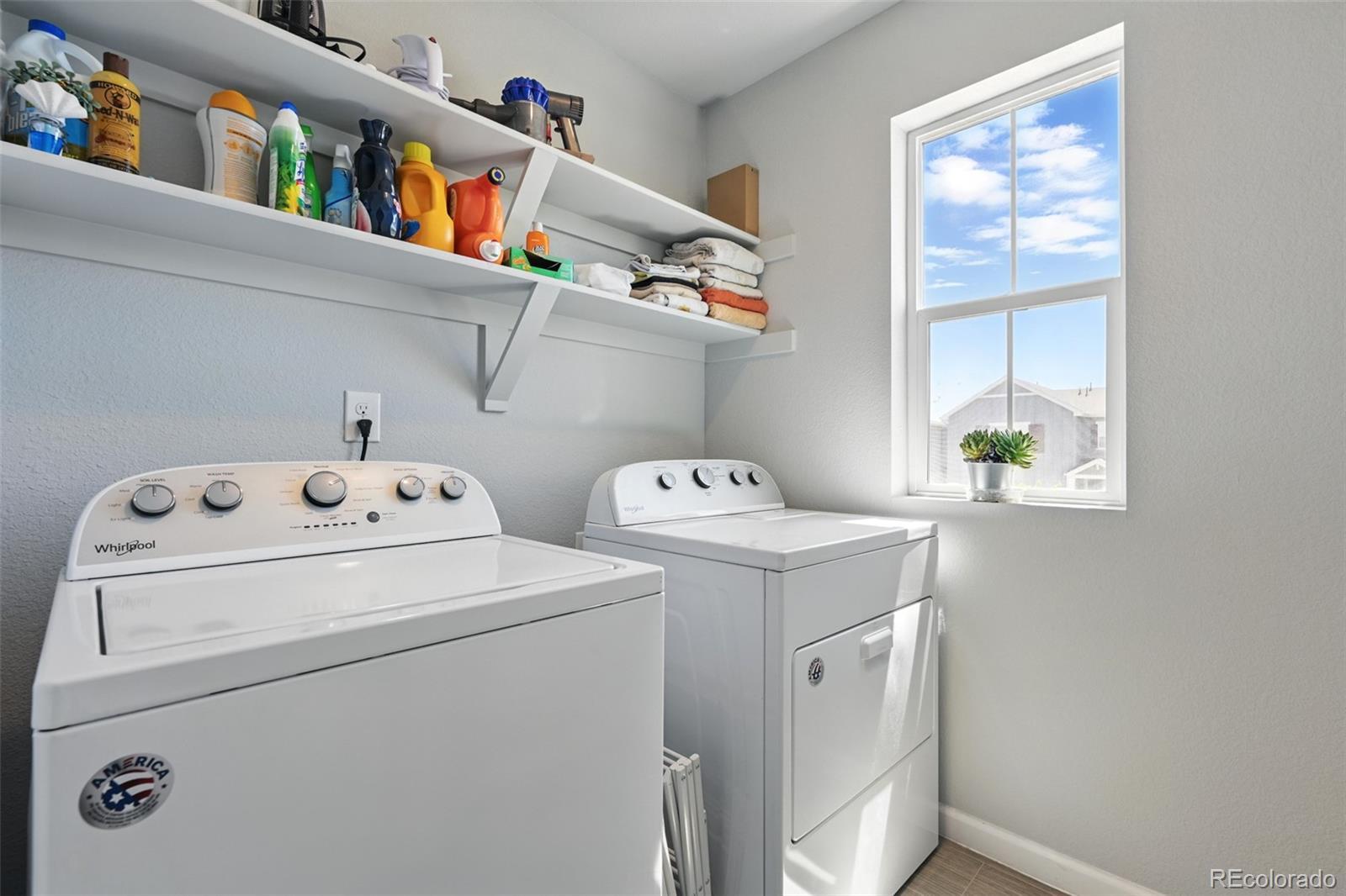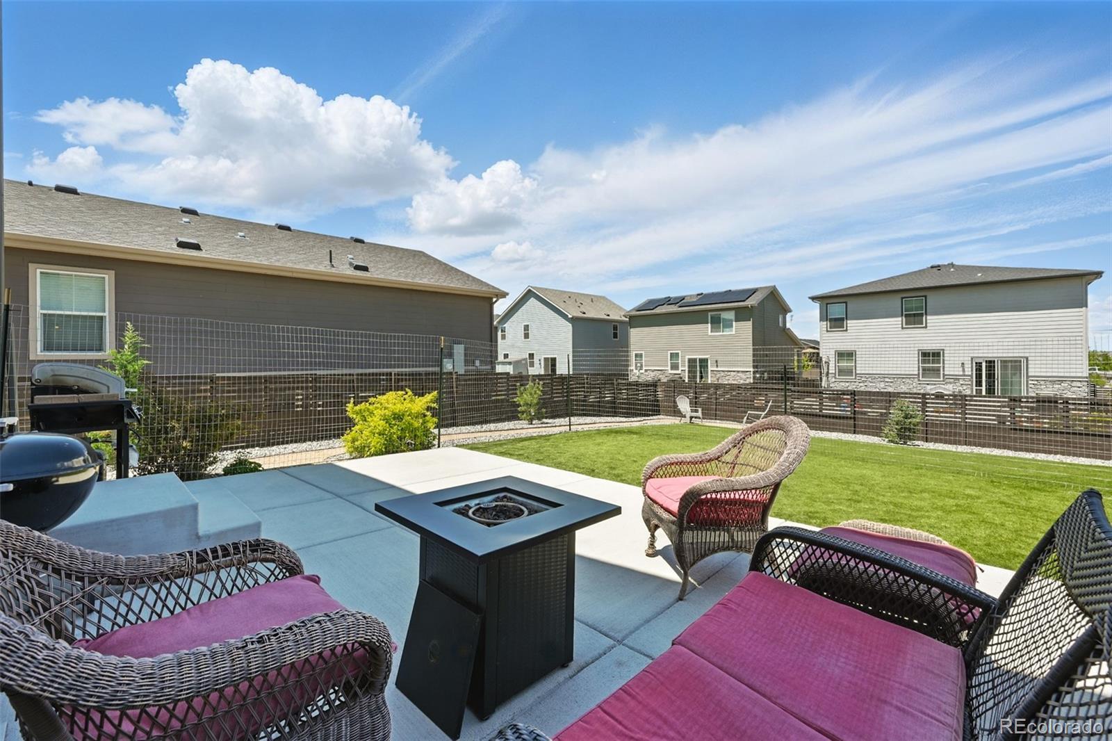 Two-story home built in 2020. No need to wait for completed construction when you can have this modern 5-year-old home with landscaping and window coverings, etc.. Located in Harmony Subdivision, near Buckley Air Force Base, Aurora. Minutes from DIA. 3 bedroom, 3 bathroom, open floor plan. The kitchen has Whirlpool appliances, granite countertops, and a hanging pot and pan rack above the Island. The double oven range is self-cleaning, and engineered flooring is throughout the main floor. Carpeting on the stairs and the second floor. The Primary Suite has a large walk-in closet and a linen closet. Laundry is upstairs. Also, a large crawl space for storage under the house. Landscaping in the front, astro turf, and water-wise plants in the backyard. The garage floor has been epoxied for a nicer surface. A storage rack over the garage door was added. The community center features a pool, a hot tub, a gym with cardio and weight training facilities, a golf simulator, and an event room available upon request. There are multiple playgrounds, walking and biking trails, and a dog park. The community is in an excellent location with access to schools, shopping, dining, entertainment, and DIA. It's a great family home and community; take a look. Smoke-free home. Price to sell don't pass this up. Has a VA assumable loan at 2.875% (Qualification requirements)