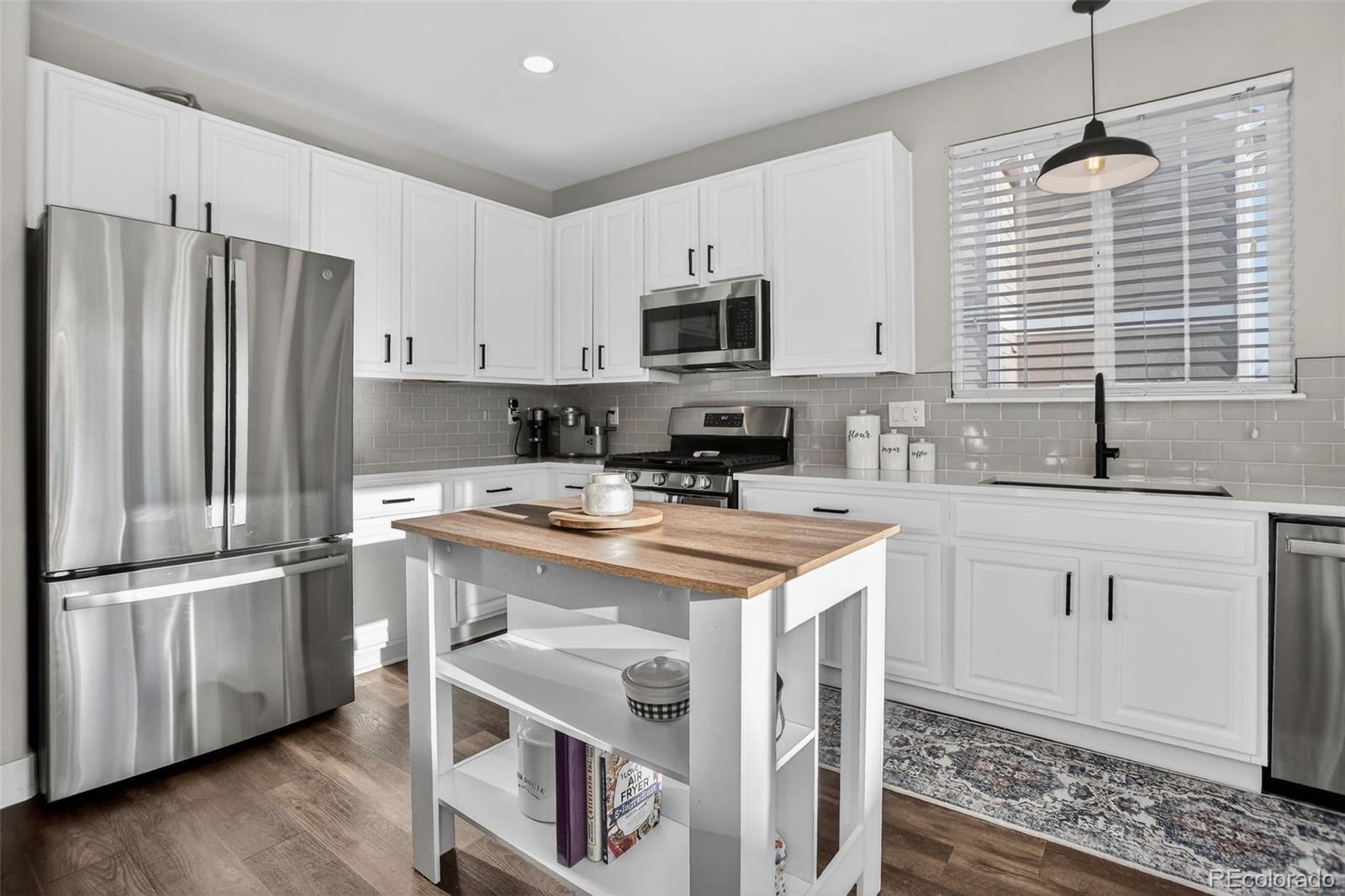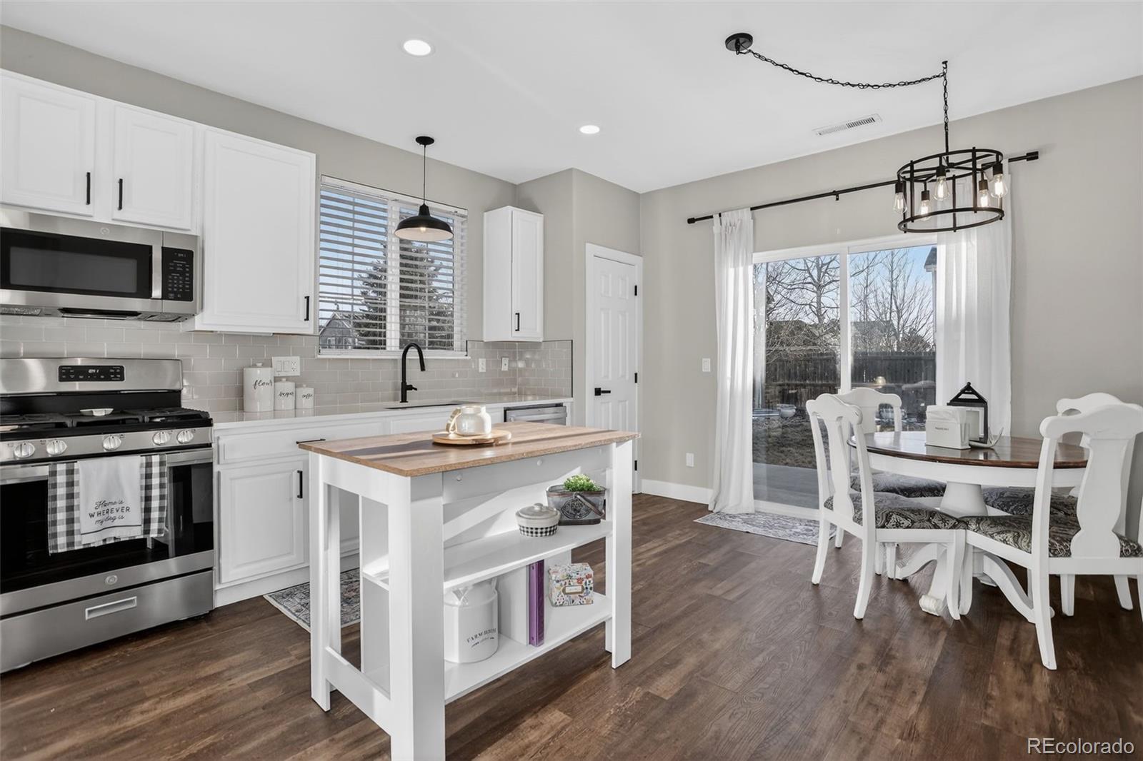 Welcome to this beautifully updated single-story 3-bedroom, 2-bathroom home that blends modern upgrades with comfortable living. Luxury vinyl plank flooring flows seamlessly throughout the entire home, complemented by upgraded baseboards, stylish light fixtures, and ceiling fans. The kitchen is a true highlight, offering abundant storage, elegant quartz countertops, a classic tile backsplash, and GE appliances, including a gas cooktop range/oven, perfect for everyday cooking and entertaining alike. Retreat to the primary bedroom, where a charming barn door leads to a newly renovated en-suite bathroom featuring a double vanity, beautifully tiled shower, and a walk-in closet. The garage with cabinetry, provides excellent storage and organization. Outside, enjoy the nice size lot with rose bushes, perennial peonies, garden bed pavers, sod with irrigation, LED exterior lighting, and three elevated garden beds, ideal for gardening enthusiasts or simply relaxing in your own outdoor oasis. This move-in-ready home offers quality upgrades throughout and offers both style and functionality! Truly a Must See!