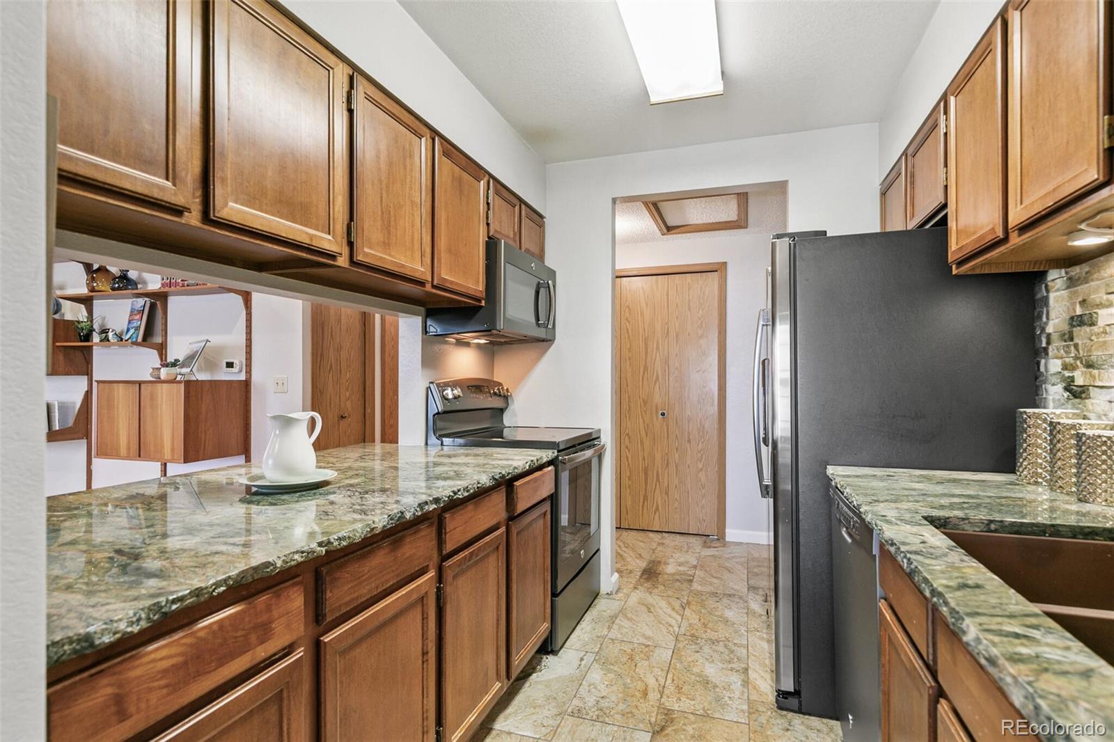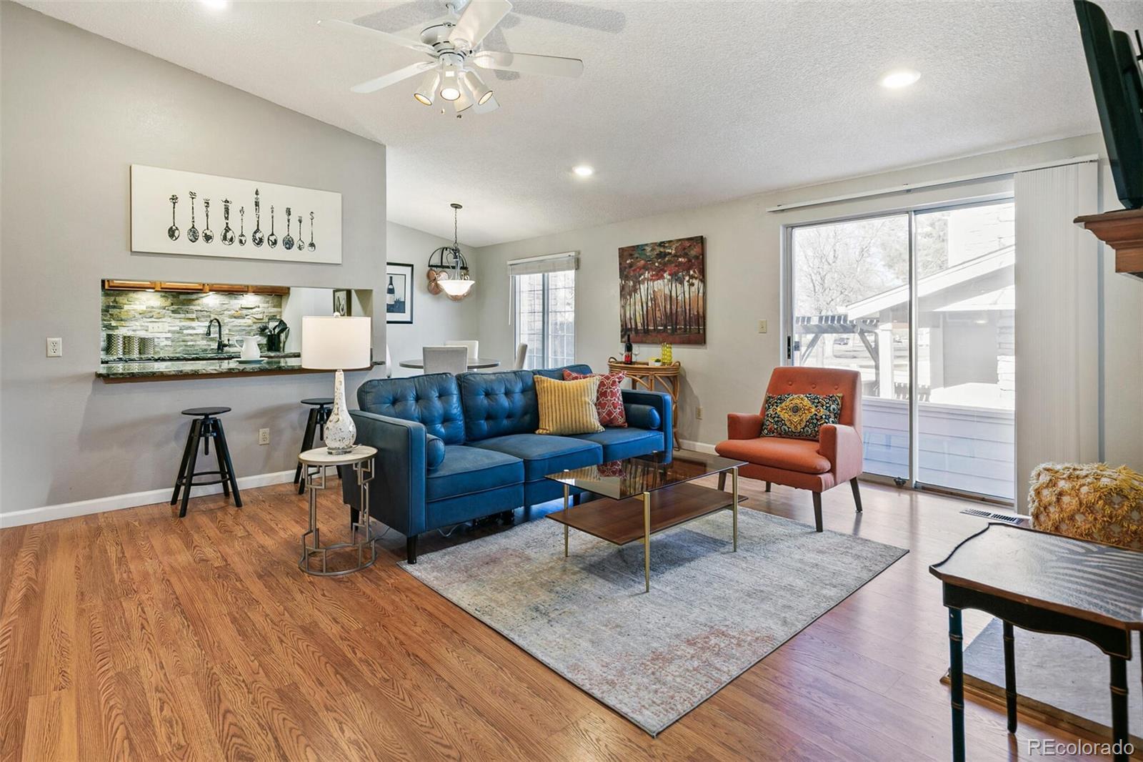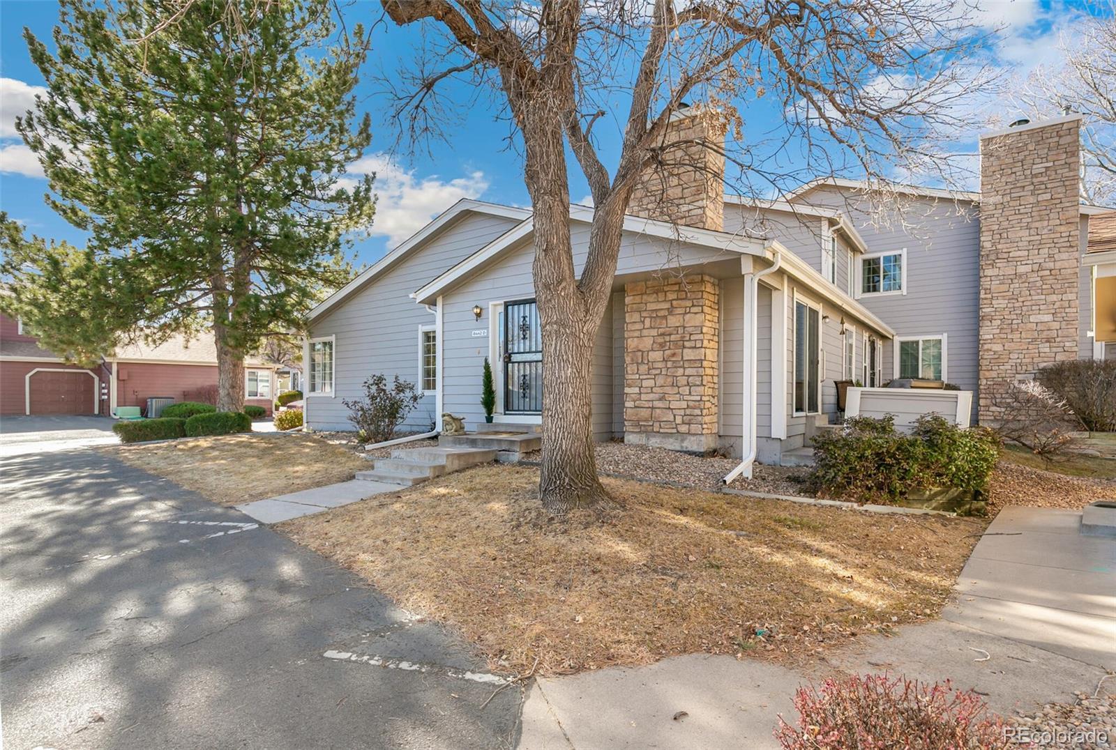 Nestled in the quiet tree-lined community, this well-maintained— lightly lived in, 2-bedroom, 2-bath end-unit in the Timbercove Condos offers comfort, convenience, and an excellent Arvada central location. Step inside to an open floor plan where the living and dining areas flow seamlessly together. The inviting living room centers around a cozy fireplace — perfect for crisp Colorado evenings — and opens directly onto your spacious private patio. Fire up the included BBQ grill and enjoy outdoor dining, morning coffee, or sunset lounging. With a small greenbelt right next door, you get an extra dose of openness and privacy rarely found in condo living. Just off the dining area, the updated kitchen shines with stainless steel appliances, generous cabinetry, and a stunning designer stone wall with granite counters that instantly elevates the space. A pantry and nearby laundry closet (with upper cabinets and included washer/dryer) keep everything organized and within reach. A secondary bedroom—ideal for guests or a home office—and a full hallway bath provide flexibility. The primary suite offers a peaceful retreat with a walk-in closet, updated lighting, and a beautifully finished ensuite featuring a custom-tiled walk-in shower and semi-frameless glass doors. Both bathrooms echo the same thoughtful upgrades and clean, modern feel. This home includes an ATTACHED one-car garage with a large storage closet and built-in shelving, plus an additional reserved parking space directly behind the garage. Guests will love the ample parking near your front door — which feels like your own private entrance thanks to the end-unit location. Live moments away from local favorites like Highland Tap & Burger, Sweet Bloom Coffee Roasters, and a variety of restaurants, parks, and everyday conveniences. It’s the perfect blend of suburban calm and urban access!