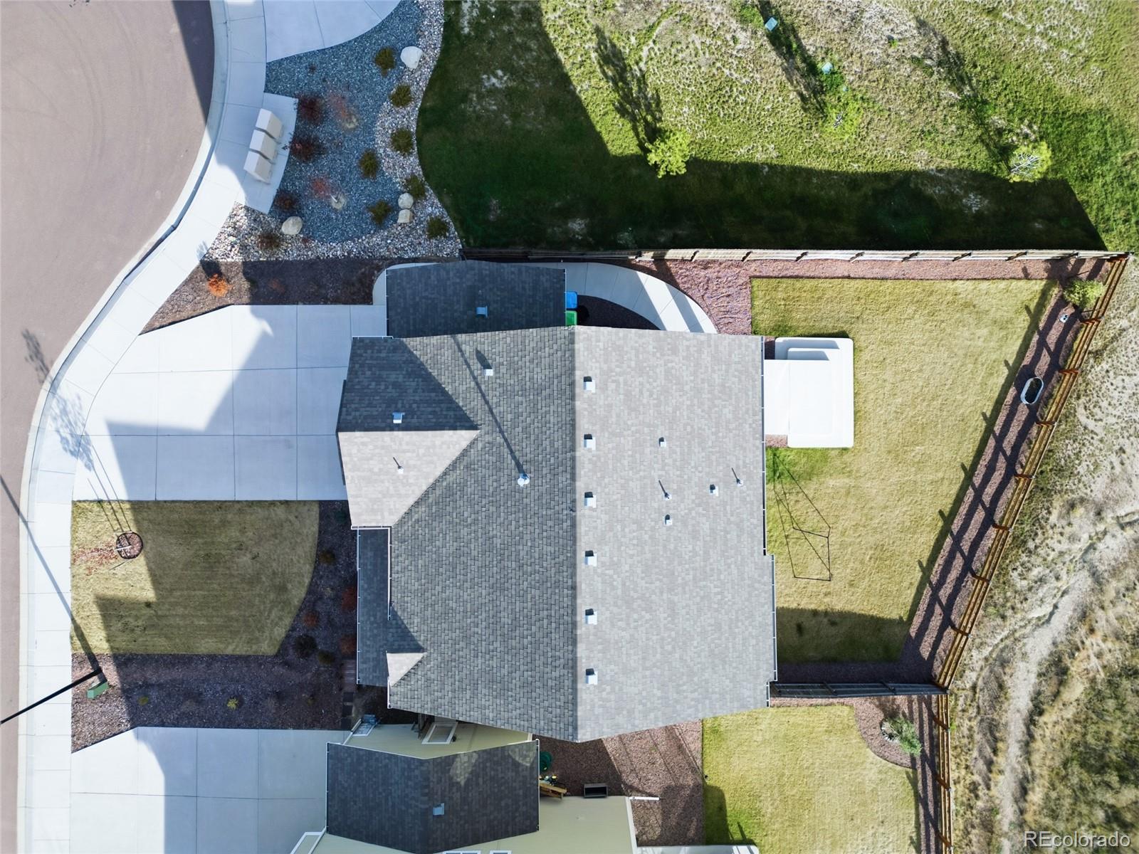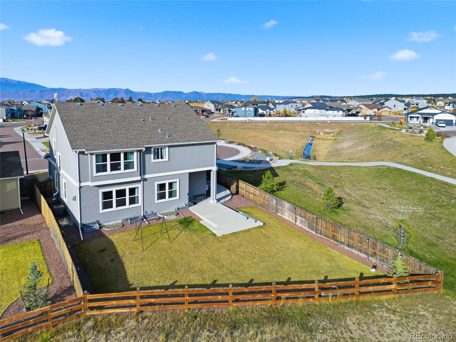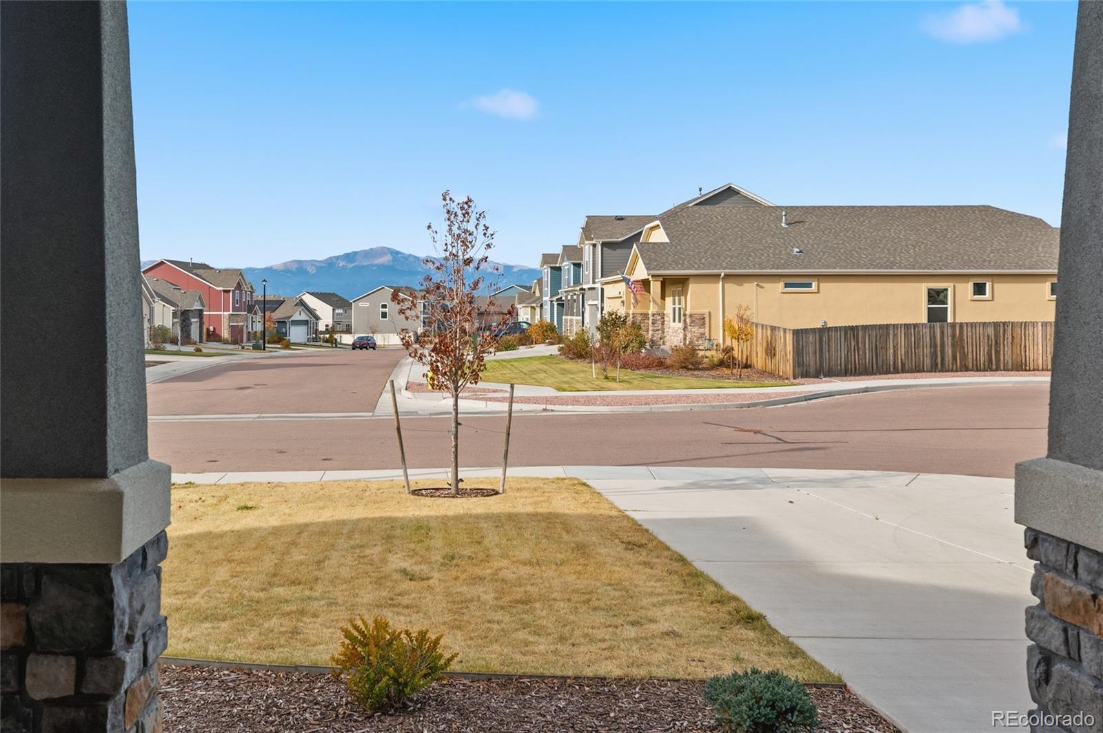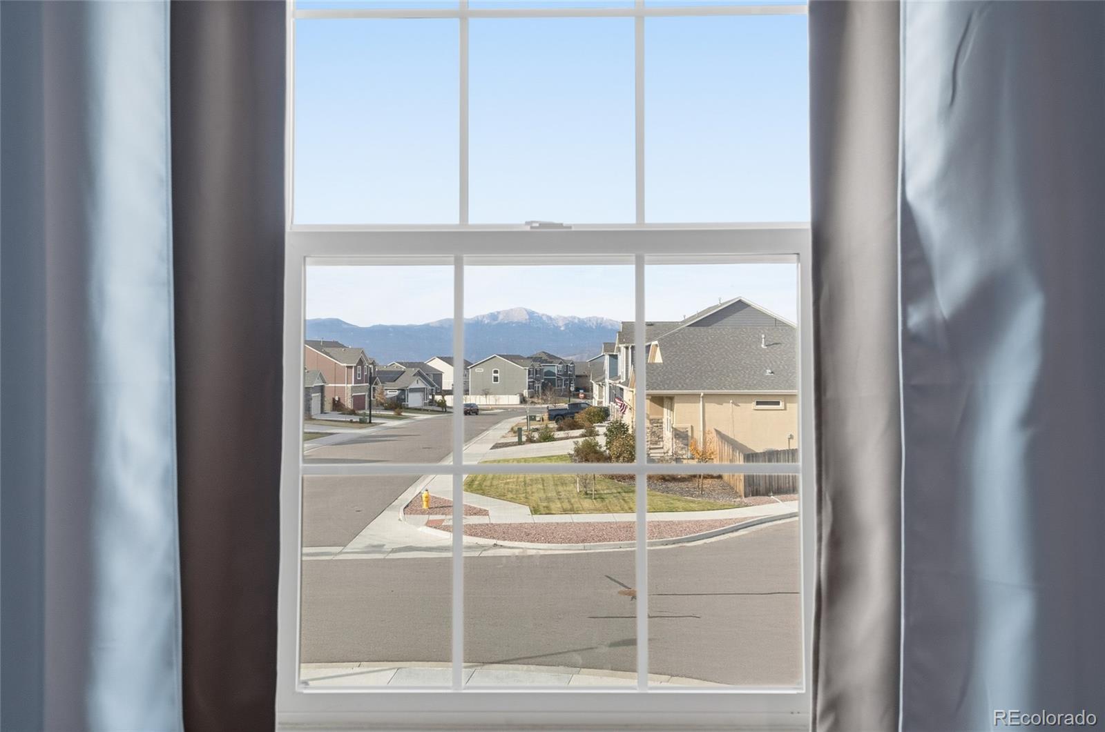 Welcome to this beautiful gem perfectly situated on a private end lot in a peaceful cul-de-sac. This remarkable property backs to open space, offering exceptional privacy, while mountain views from the front add to its Colorado charm. Enjoy serene surroundings with no homes to be built directly behind or across the green space, plus mountain views from the front, including a stunning view of Pikes Peak. Enjoy the quiet surroundings with minimal traffic and the friendly neighborhood atmosphere, complete with frequent community events and a nearby park and playground just steps away. Inside, you’ll find a light-filled, open layout that seamlessly connects the kitchen, dining, and living areas. The chef-worthy kitchen features abundant white cabinetry, double ovens, quartz countertops, a spacious pantry, and a large center island perfect for casual meals or gatherings. The cozy living room invites relaxation with its custom floor-to-ceiling stacked stone fireplace. A private main-level home office provides the perfect space for remote work or study. Upstairs, the home continues to impress with stunning Pikes Peak and mountain views. The expansive loft offers flexible space for a second living area or playroom, while three generously sized bedrooms each have walk-in closets. A thoughtfully placed upper-level laundry room adds to the home’s practical design. The newly finished basement features 9-foot ceilings—taller than most—and multiple egress windows for ample natural light. Currently set up as a professional-quality home gym, this space can easily be converted into a family room or recreation area. The basement also includes a full bedroom and bathroom, making it ideal for guests. The property includes an extra-deep four-car garage with custom overhead storage. This move-in-ready stunner offers a rare combination of tranquility, luxury, and community. Nestled in a quiet setting yet just minutes from modern amenities, this Sterling Ranch home truly has it all.