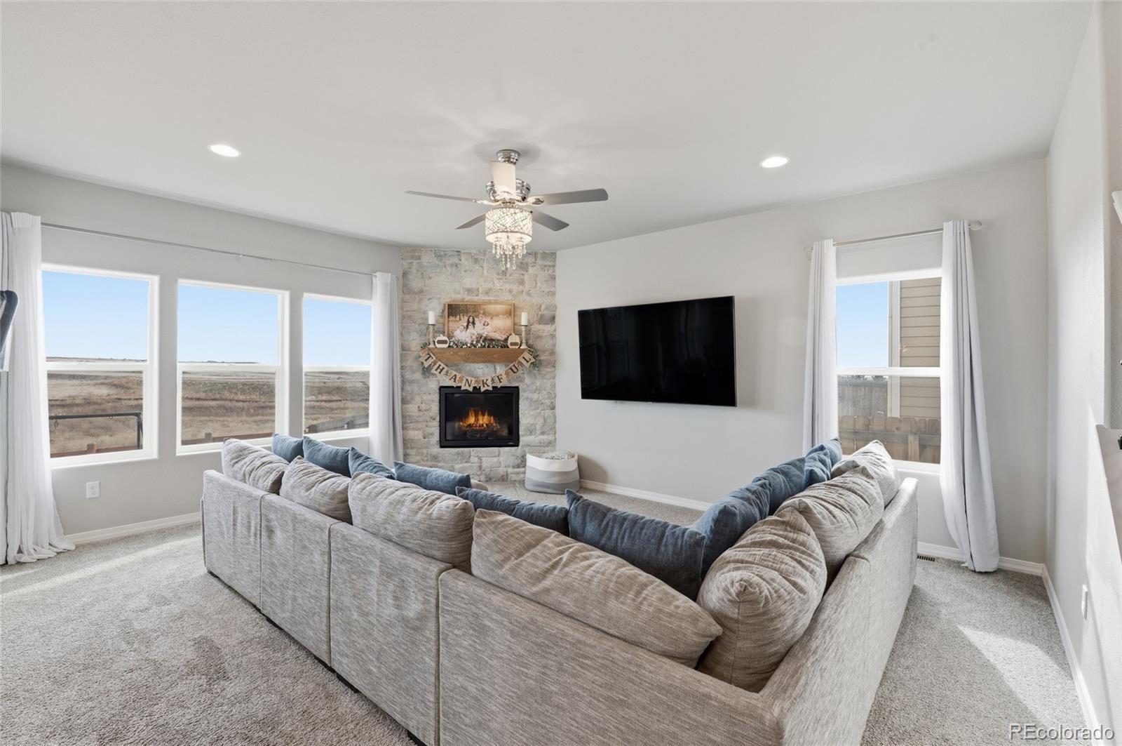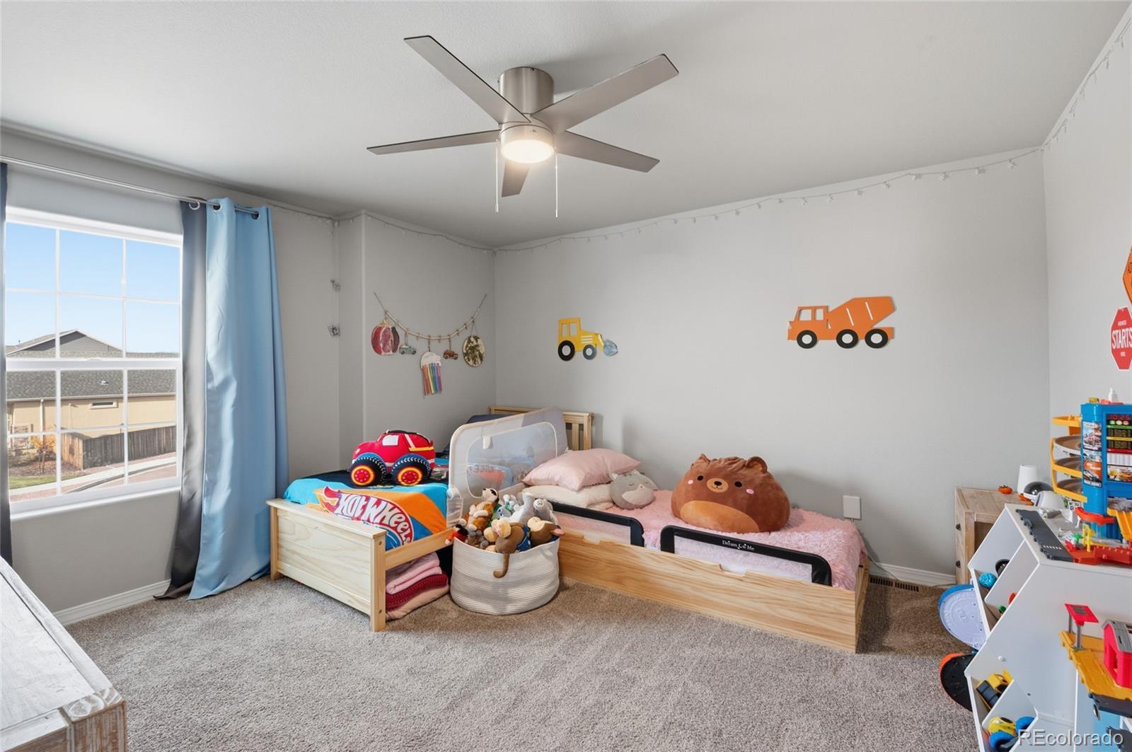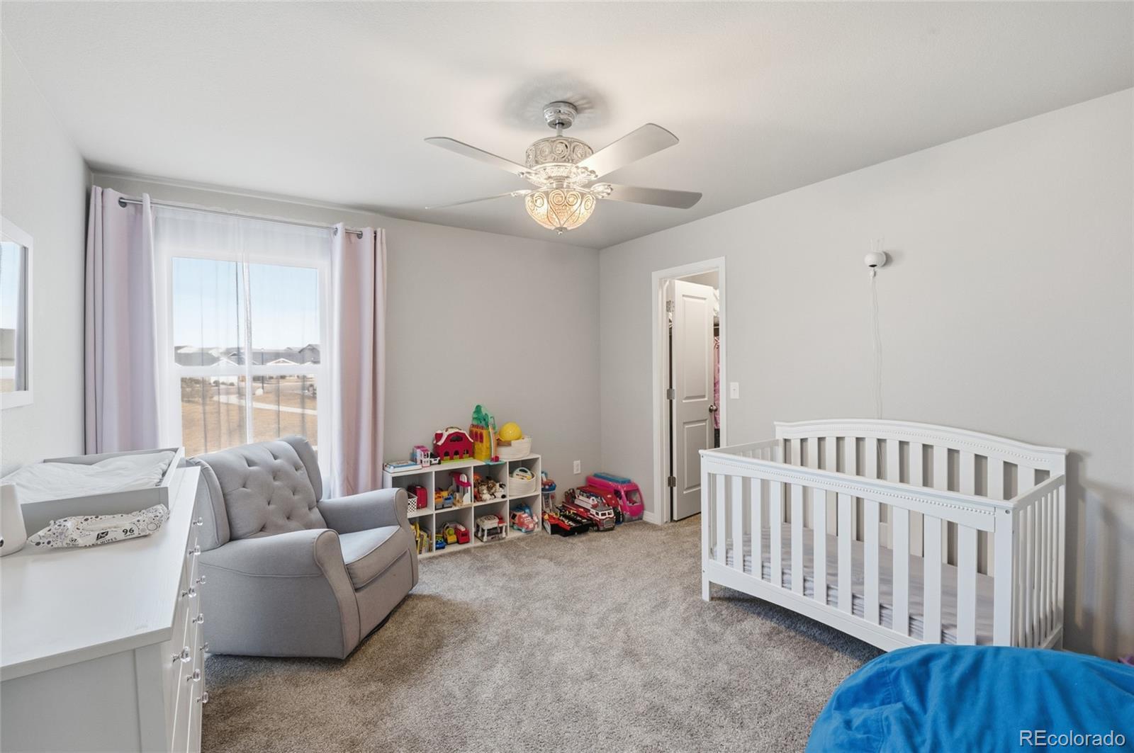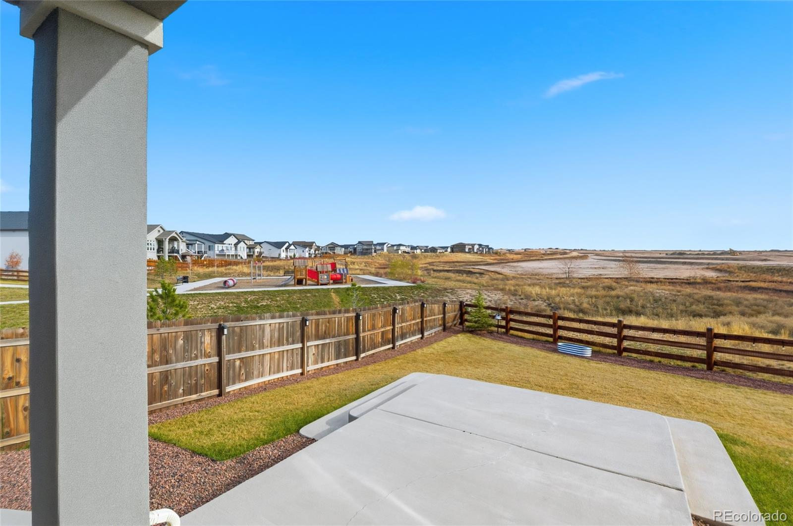 Welcome to this beautiful gem perfectly situated on a private end lot in a peaceful cul-de-sac. This remarkable property backs to open space, offering exceptional privacy, while mountain views from the front add to its Colorado charm. Enjoy serene surroundings with no homes to be built directly behind or across the green space, plus mountain views from the front, including a stunning view of Pikes Peak. Enjoy the quiet surroundings with minimal traffic and the friendly neighborhood atmosphere, complete with frequent community events and a nearby park and playground just steps away. Inside, you’ll find a light-filled, open layout that seamlessly connects the kitchen, dining, and living areas. The chef-worthy kitchen features abundant white cabinetry, double ovens, quartz countertops, a spacious pantry, and a large center island perfect for casual meals or gatherings. The cozy living room invites relaxation with its custom floor-to-ceiling stacked stone fireplace. A private main-level home office provides the perfect space for remote work or study. Upstairs, the home continues to impress with stunning Pikes Peak and mountain views. The expansive loft offers flexible space for a second living area or playroom, while three generously sized bedrooms each have walk-in closets. A thoughtfully placed upper-level laundry room adds to the home’s practical design. The newly finished basement features 9-foot ceilings—taller than most—and multiple egress windows for ample natural light. Currently set up as a professional-quality home gym, this space can easily be converted into a family room or recreation area. The basement also includes a full bedroom and bathroom, making it ideal for guests. The property includes an extra-deep four-car garage with custom overhead storage. This move-in-ready stunner offers a rare combination of tranquility, luxury, and community. Nestled in a quiet setting yet just minutes from modern amenities, this Sterling Ranch home truly has it all.