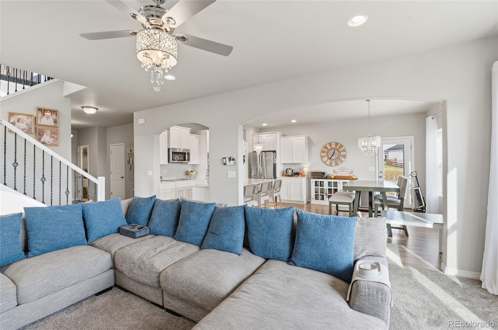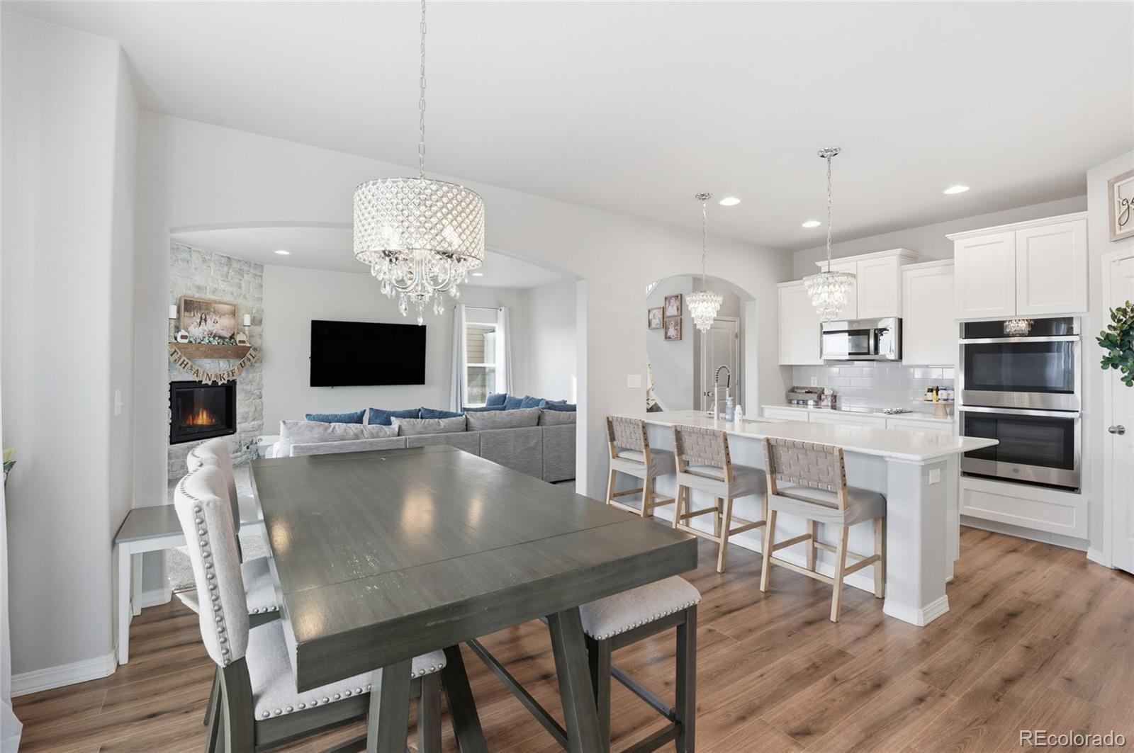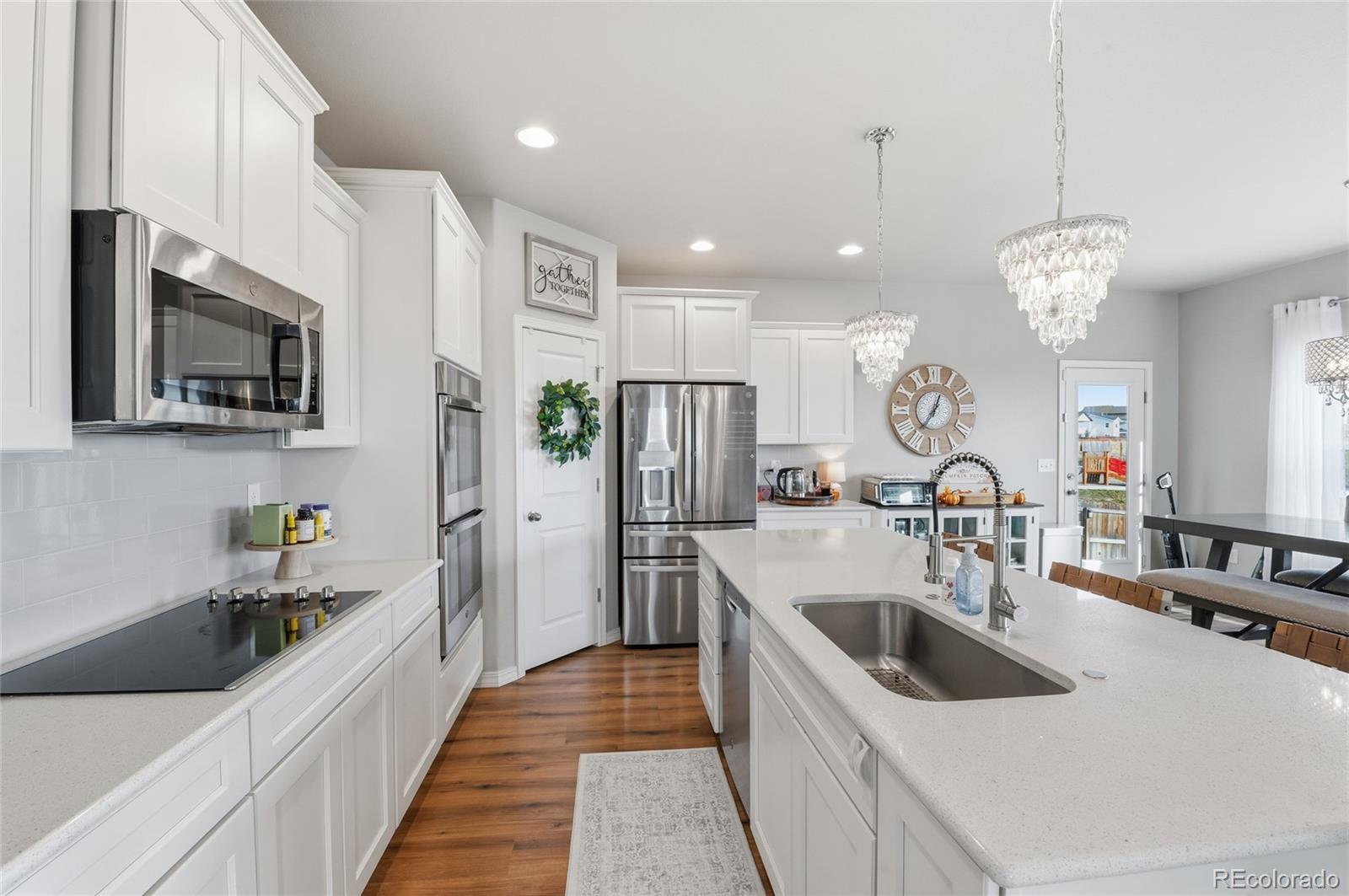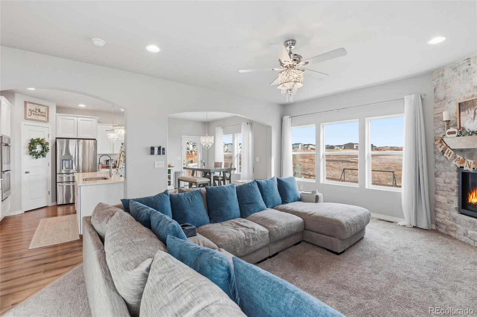 Welcome to this beautiful gem perfectly situated on a private end lot in a peaceful cul-de-sac. This remarkable property backs to open space, offering exceptional privacy, while mountain views from the front add to its Colorado charm. Enjoy serene surroundings with no homes to be built directly behind or across the green space, plus mountain views from the front, including a stunning view of Pikes Peak. Enjoy the quiet surroundings with minimal traffic and the friendly neighborhood atmosphere, complete with frequent community events and a nearby park and playground just steps away. Inside, you’ll find a light-filled, open layout that seamlessly connects the kitchen, dining, and living areas. The chef-worthy kitchen features abundant white cabinetry, double ovens, quartz countertops, a spacious pantry, and a large center island perfect for casual meals or gatherings. The cozy living room invites relaxation with its custom floor-to-ceiling stacked stone fireplace. A private main-level home office provides the perfect space for remote work or study. Upstairs, the home continues to impress with stunning Pikes Peak and mountain views. The expansive loft offers flexible space for a second living area or playroom, while three generously sized bedrooms each have walk-in closets. A thoughtfully placed upper-level laundry room adds to the home’s practical design. The newly finished basement features 9-foot ceilings—taller than most—and multiple egress windows for ample natural light. Currently set up as a professional-quality home gym, this space can easily be converted into a family room or recreation area. The basement also includes a full bedroom and bathroom, making it ideal for guests. The property includes an extra-deep four-car garage with custom overhead storage. This move-in-ready stunner offers a rare combination of tranquility, luxury, and community. Nestled in a quiet setting yet just minutes from modern amenities, this Sterling Ranch home truly has it all.
