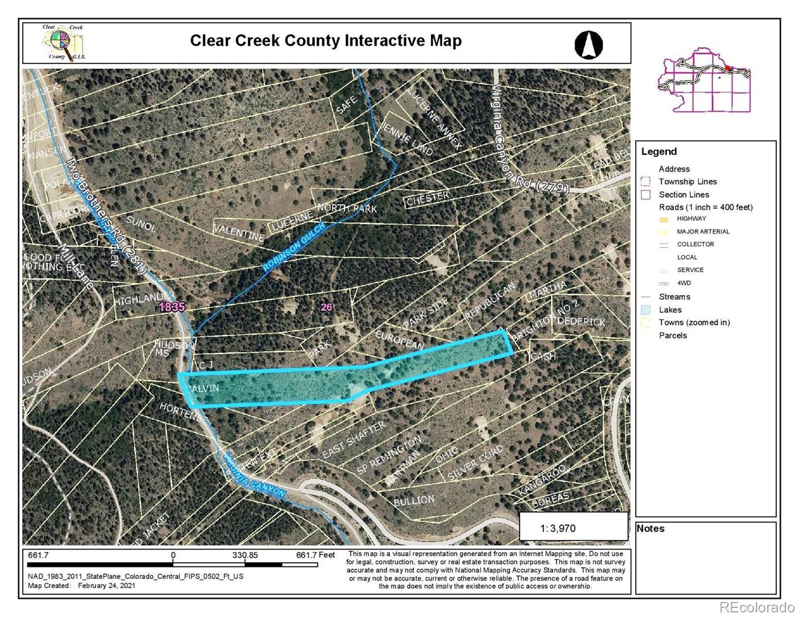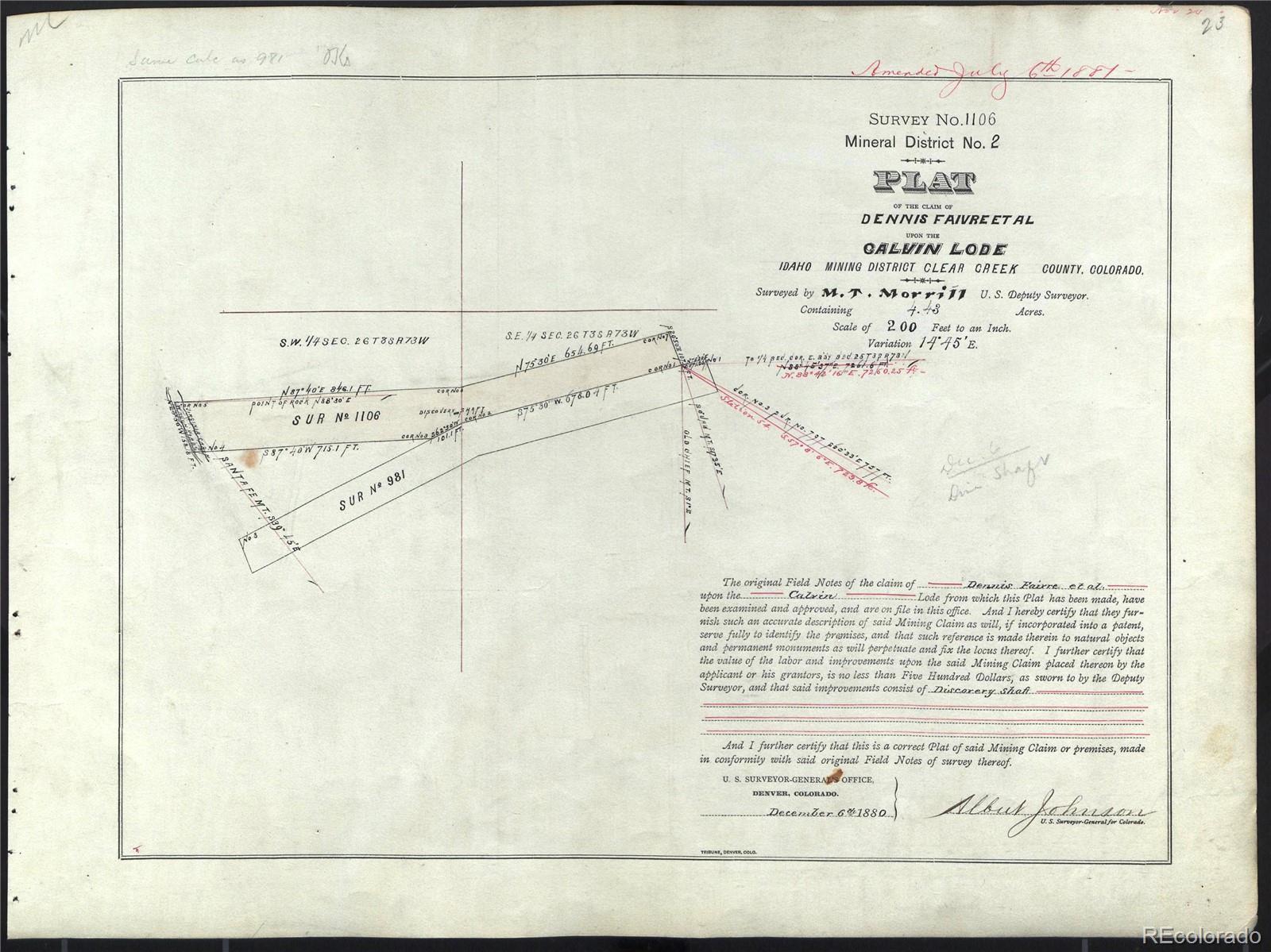 Rich in mining history, the Calvin Lode 1106 sits one mile above historic Idaho Springs where the gold rush began. Amazing views, peace and quiet, year round access and bright southern exposure await you. Patented in 1860 by Dennis Fairre, the Calvin Load has a rich history in the Gold and Silver deposits. Surrounded by History, you will be able to step back in time and feel like one of the old-time miners as you pick thru the earth to strike it rich! This property is perfect for camping or prospections or build one's dream home. Because of the bountiful sun and slope and the economy, an earth ship style home would be ideal here. Close to Denver and great skiing, shopping and all the activities Historic Clear Creek County and Gilpin County has to offer. Don't let this 4.43 Acre Gold mine pass you by. More pictures and drone footage to come. Please bring all offers.