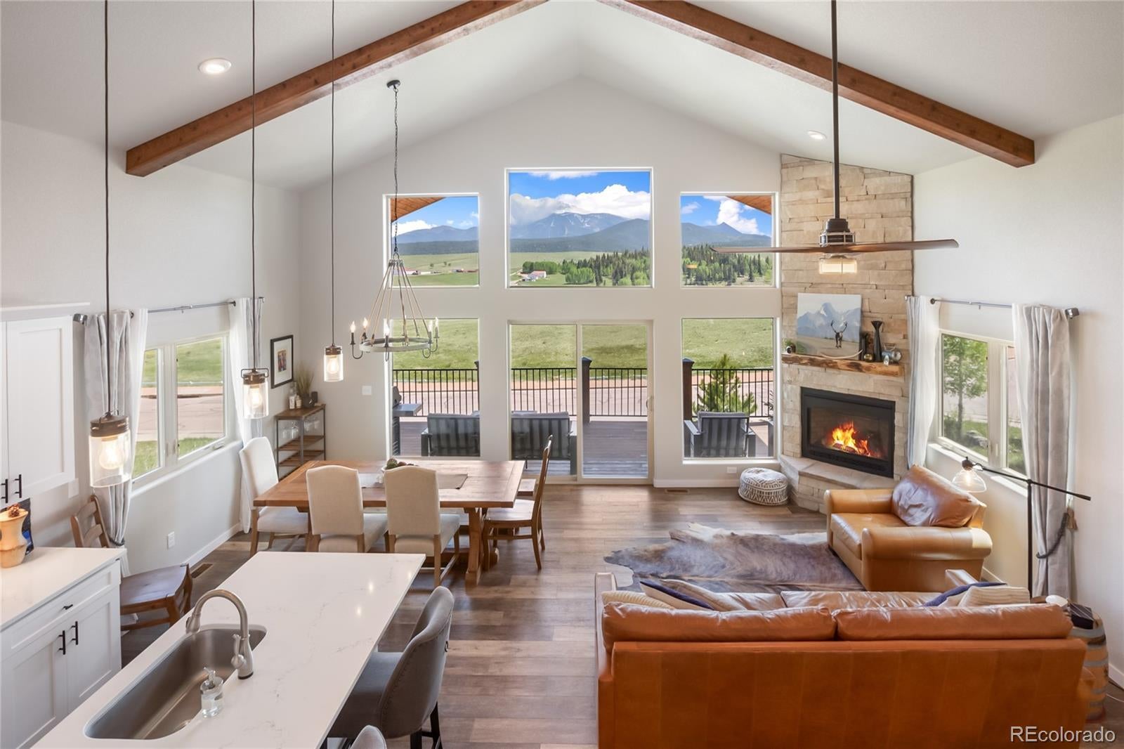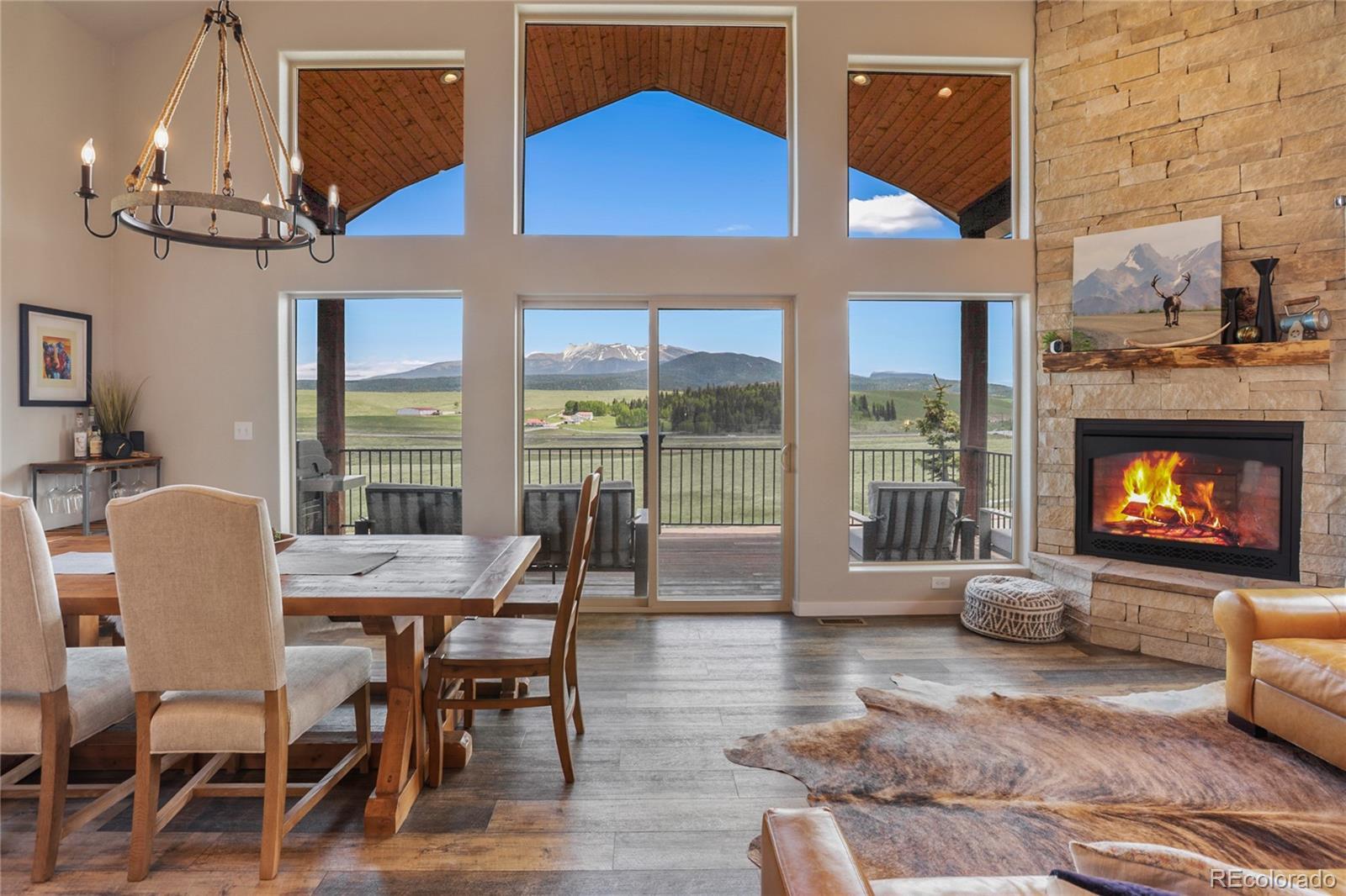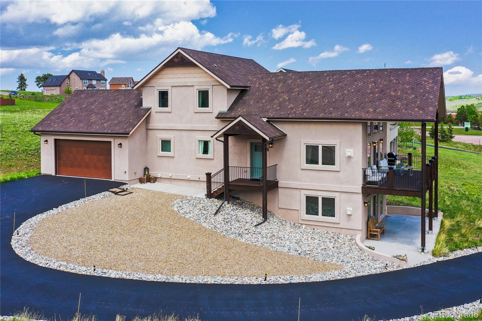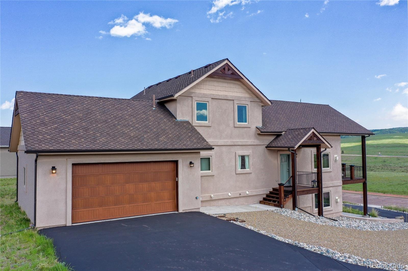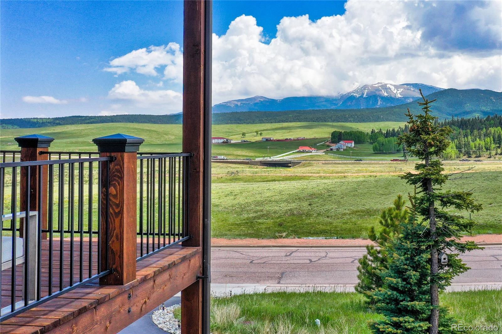 Stunning, like-new custom home, move-in condition! Nestled on over half an acre with unobstructed Pikes Peak views, this gem is just 7 minutes from Woodland Park and 35 minutes from Colorado Springs. Enjoy proximity to adventure—only 1.25 hours from snow-skiing and the Continental Divide, and 20 minutes from gold-medal trout fishing! Soaring south-facing windows, a spacious covered deck, and beamed, vaulted ceilings in the great room. The low-maintenance stucco exterior complements xeriscaped landscaping and wildflower meadows. Inside, discover 5 bedrooms: a main-level owner’s suite, 2 upstairs bedrooms, and 2 in the lower level—perfect for entertaining family and friends. The gourmet kitchen features quartz countertops, stainless appliances, and a center island with bar seating. The great room impresses with a corner gas fireplace, 20-foot ceilings, Cortec vinyl plank floors, and panoramic windows. The owner’s suite offers a private deck, a luxurious 5-piece bath, and dual closets. Upstairs, a lofted den creates a cozy secondary entertaining space, adjacent to two bedrooms and a full bath. The expansive lower-level family room includes another gas fireplace, Pikes Peak views, and a walk-out patio under the deck, plus two bedrooms, a bath, and a secondary laundry area. Thoughtfully designed with three distinct living areas, this home ensures privacy for guests. Upgraded features include: Pella windows; spray foam insulation; 2 x 6 inch construction; covered "outdoor" living space; tankless on demand hot water heater; Views of Pikes Peak! Conveniently located with easy access to schools, shopping, paved county roads, and municipal water and sewer, this Divide retreat is worth the short 7-minute drive from Woodland Park!