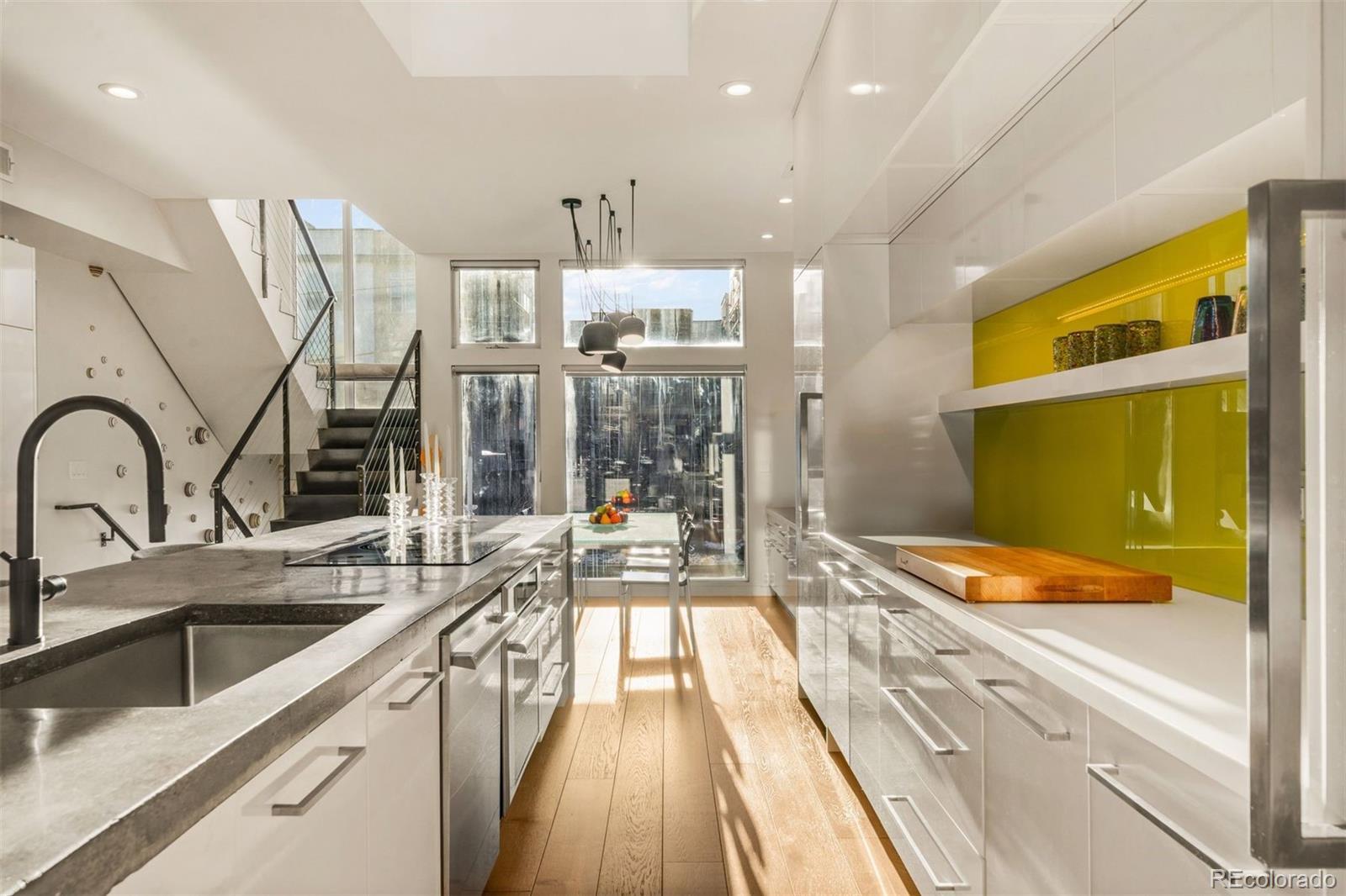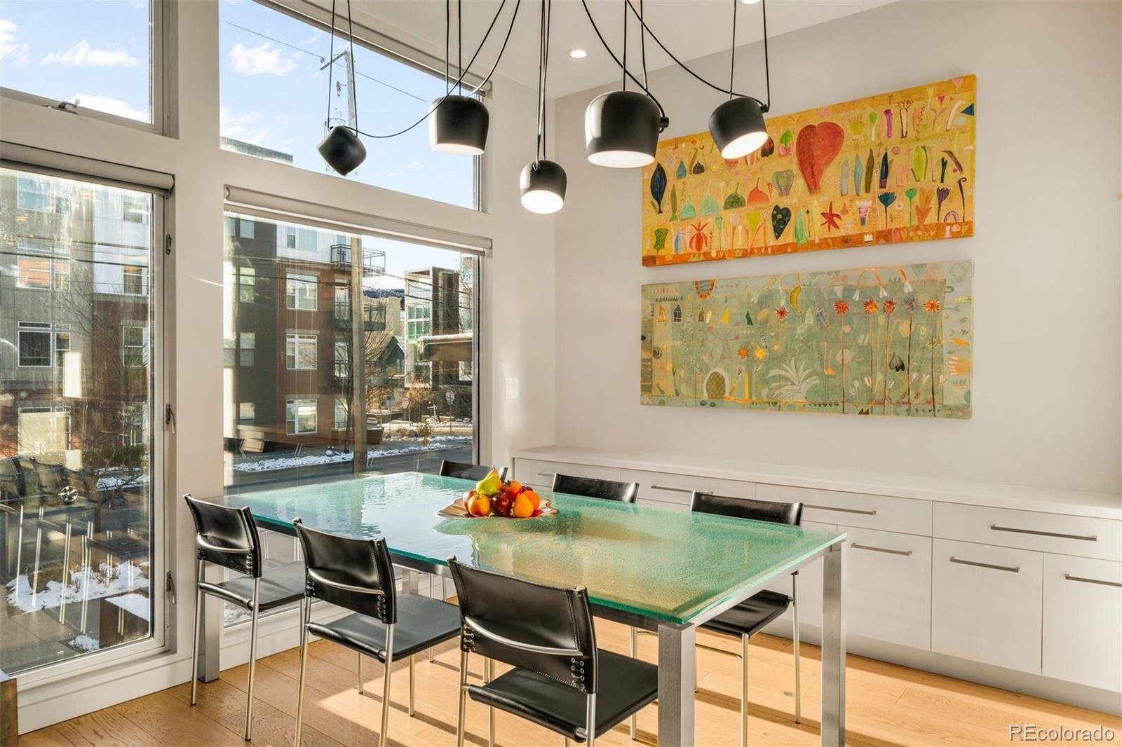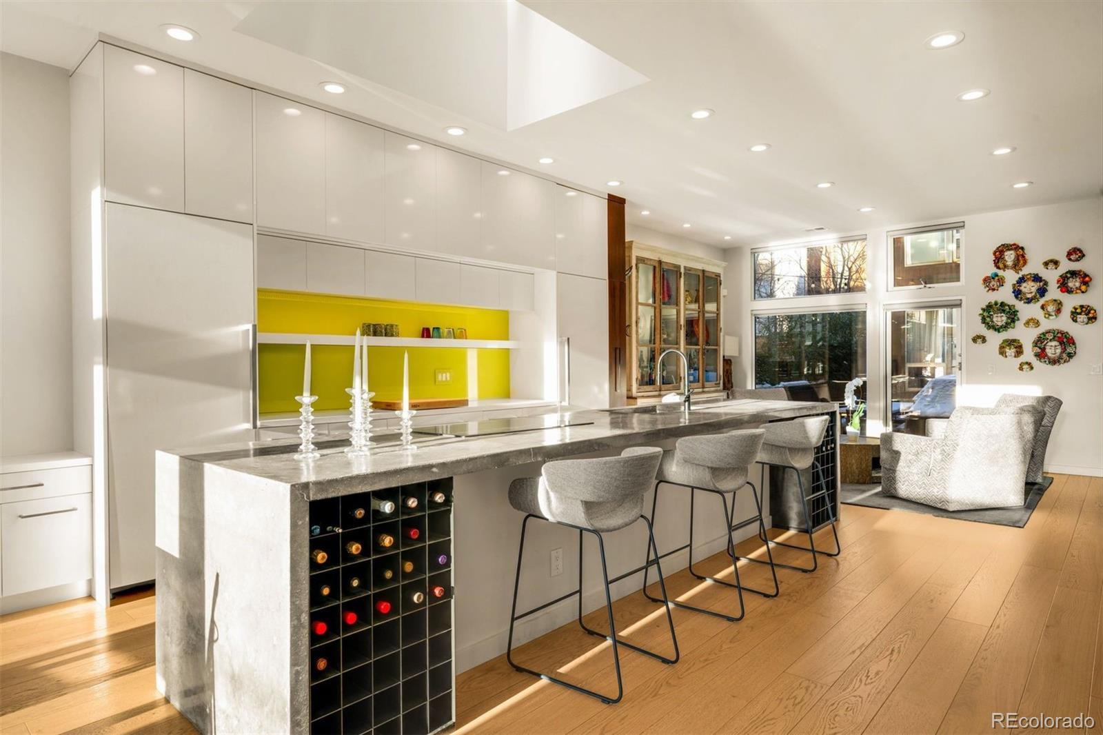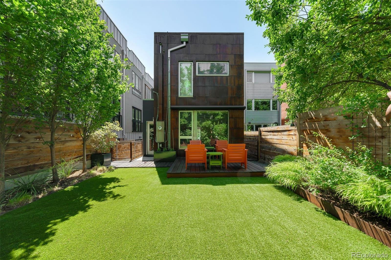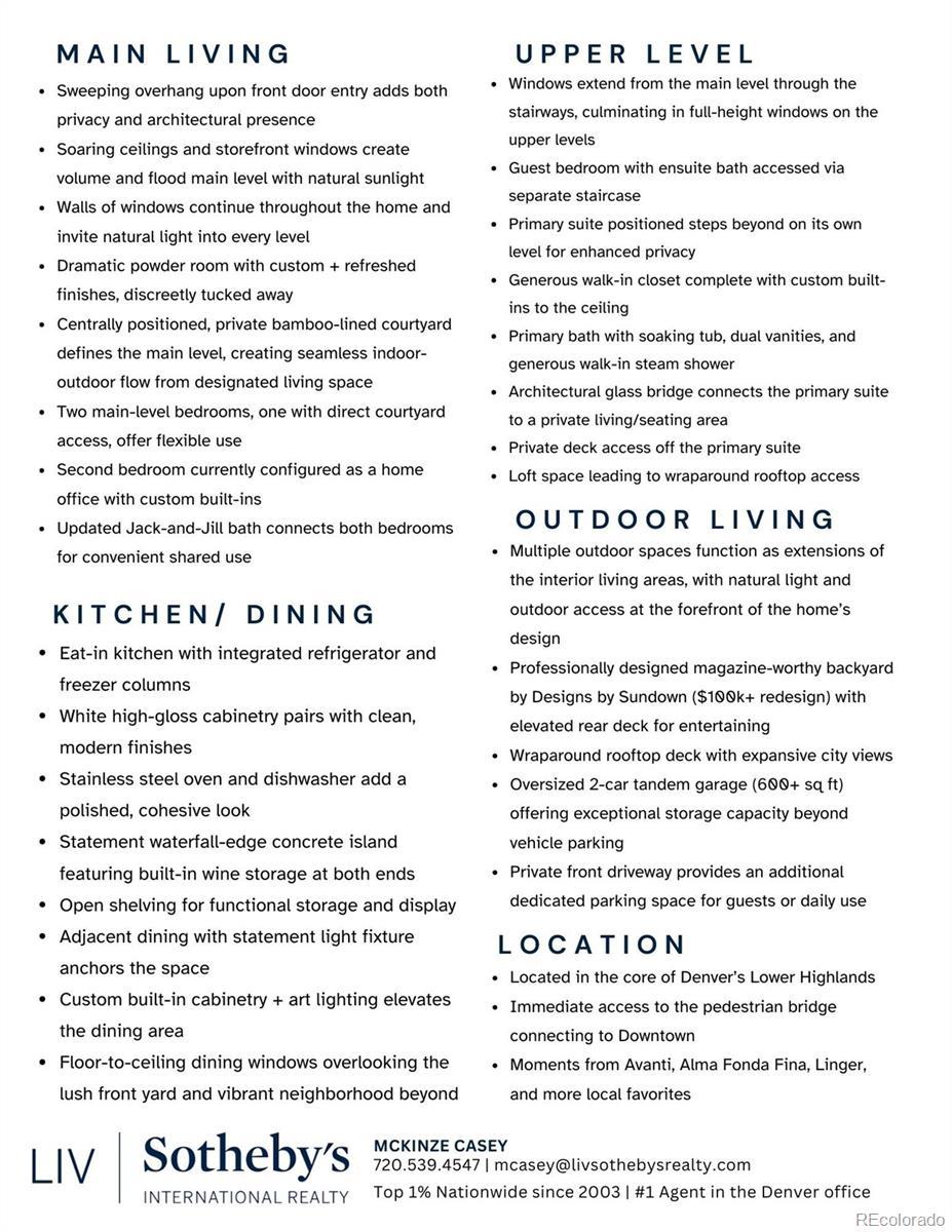 Located in the heart of Denver’s Lower Highlands, 1815 Boulder Street is one of two seminal architectural homes that helped catalyze LoHi’s evolution. Set among award-winning restaurants, coffee shops, boutiques, parks, and direct pedestrian bridge access to Downtown Denver, this single-family residence features a magazine-worthy backyard in one of the city’s most vibrant neighborhoods. A dramatic front porch with sweeping overhang offers a welcoming arrival, complemented by raised garden beds in front/back yards. Inside, the main level is filled with natural light from soaring ceilings and storefront-style windows, creating spaces that feel more gallery than residence. The eat-in kitchen is designed for daily living and entertaining, featuring integrated refrigerator and freezer columns, a waterfall concrete island with built-in wine storage, and open shelving. The dining area is anchored by statement lighting and custom built-ins, with lush front yard views, while the living room opens to custom bamboo-lined courtyard, extending indoor-outdoor living and connecting to a main-level bedroom. Main-floor bedrooms offer flexibility, including one currently used as an office with custom built-ins. Both share a remodeled Jack-and-Jill bath, complemented by a dramatic powder room. A separate staircase leads to an additional upper-level bedroom, creating separation from the primary suite. The primary suite lives like a private level, featuring a custom walk-in closet and refreshed bath with soaking tub, dual vanities, and steam shower, connected by a striking glass bridge to a private living area. The top-floor loft opens to a wraparound rooftop deck with sweeping city views. The backyard, a six-figure redesign by Designs by Sundown, offers a sculptural outdoor retreat. An oversized 2-car tandem garage with 600+ SqFt of storage and private driveway complete the home. Moments from Avanti and Michelin-recognized Alma Fonda Fina, 1815 is a one-of-a-kind work of art.