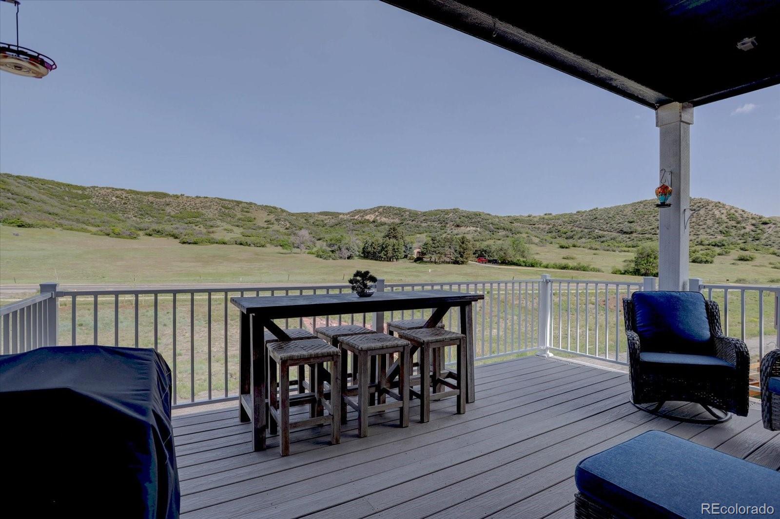 Stunning Ranch Style Paired Home in Azure/The Meadows with Upgrades Galore! This home has shared driveway & backs to Wolfsenburger Rd, gives you unobstructed views of Ridgeline Open Space. Minimal Maintenance, Maximum Convenience. Forget the shovel and the mower! Enjoy virtually maintenance-free living—the Azure HOA expertly manages snow removal to your front door. This spacious home offers an open floor plan with 3,484 total SF, including 2,671 finished SF & an additional 813 SF unfinished in the full walkout basement. Featuring 3 bedrooms, 3 bathrooms, and an office, includes a luxurious primary suite complete with a barn door leading to a spa-like bath featuring dual vanities, a large shower, and a massive walk-in closet. Every detail has been thoughtfully designed with premium upgrades, including 9-foot ceilings, 8-foot doors, a whole-house water softener and purifier, upgraded bathroom tile, and a gourmet kitchen with KitchenAid appliances and luxury vinyl flooring on the main level. Additional highlights include upgraded hand railing, 5-inch baseboards, tall bathroom cabinets, surround sound in the living room and on the deck, and customized built-out closets. The current owner has enhanced the home with finishes such as marble countertops and matching backsplash in the kitchen, all new sinks and faucets, an upgraded dishwasher, elegant Hunter Douglas Silhouette blinds, and blown-in insulation added between the main floor and basement. The finished walkout basement provides a large family room, bedroom, and ¾ bath—perfect for guests or extra living space. Outdoor living shines with an expanded deck designed to showcase the beautiful open views. You’ll feel like you’re living in a peaceful country setting, yet you’re only about 5 miles from highway access and all the amenities Castle Rock has to offer. Move right in and enjoy this home - Furnishings available if desired!